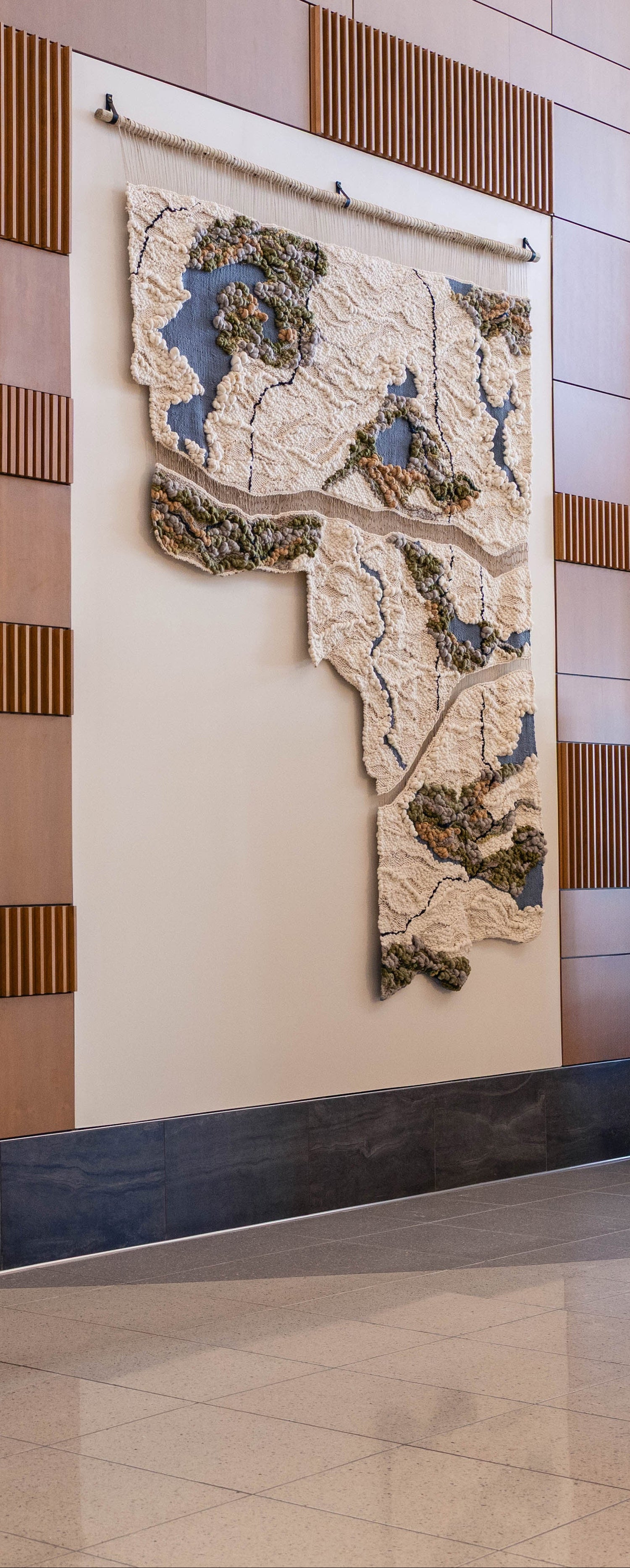 Working together on a custom woven piece was a thoughtful and collaborative process from start to finish. Rebecca took the time to understand the story, setting, and intent behind the work, translating that into something both meaningful and beautiful. The piece has become the focal point of the main lobby and people are genuinely excited to recognize it as a map of Chanhassen and to identify familiar landmarks. They love how the textures and colors contrast with and complement the building's wood and glass, helping tie the entire space together.