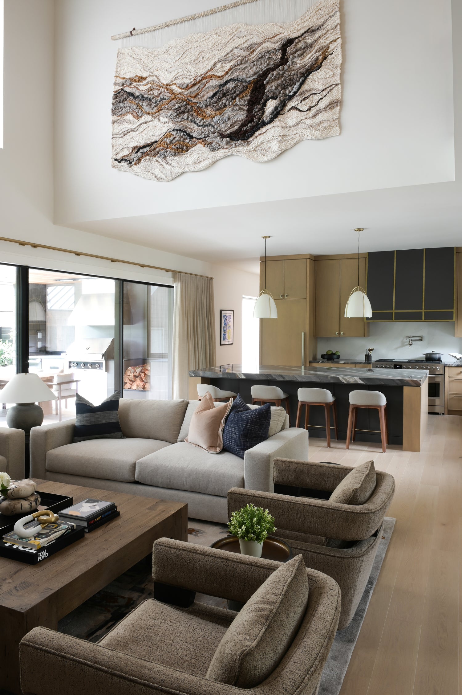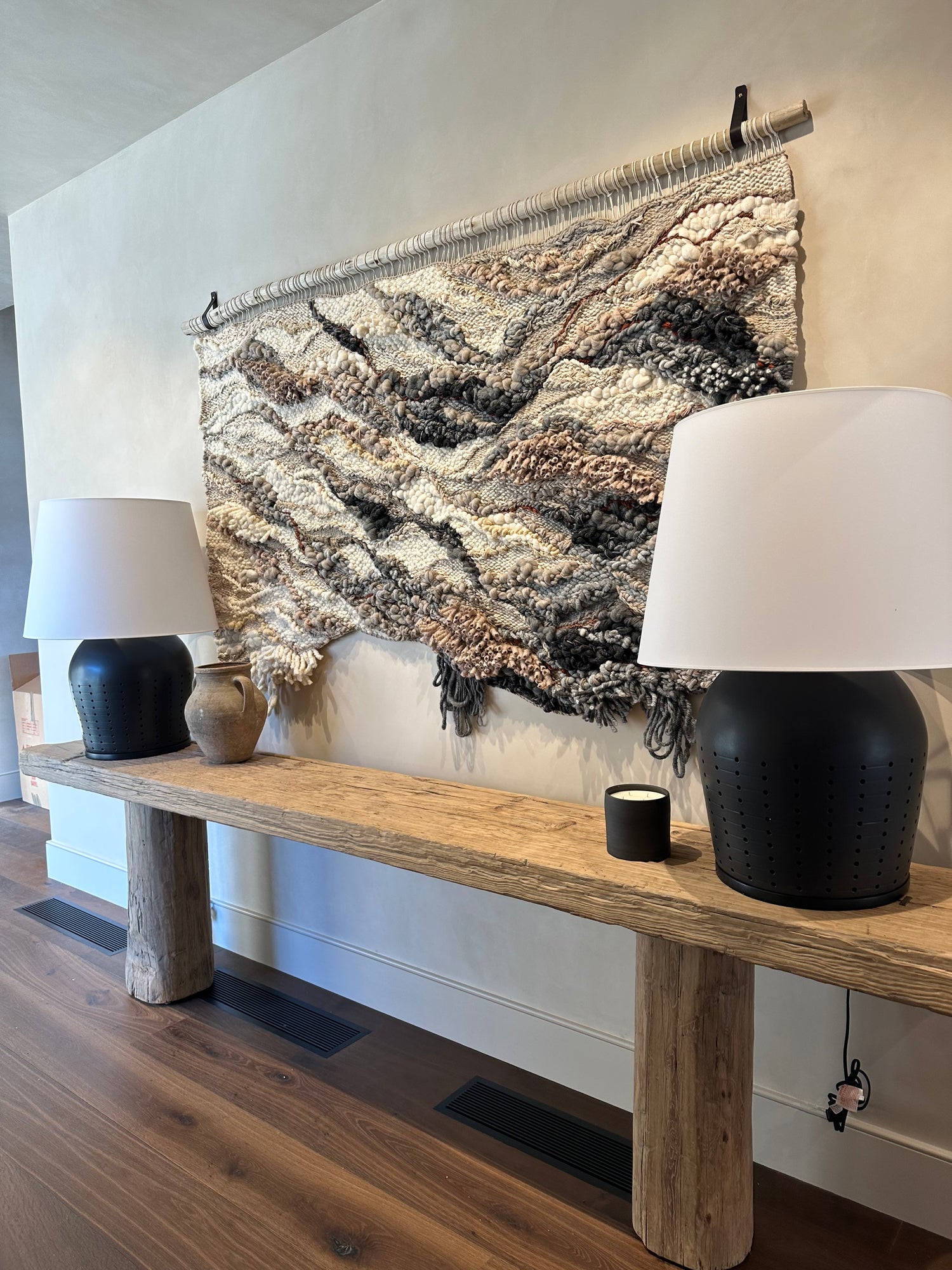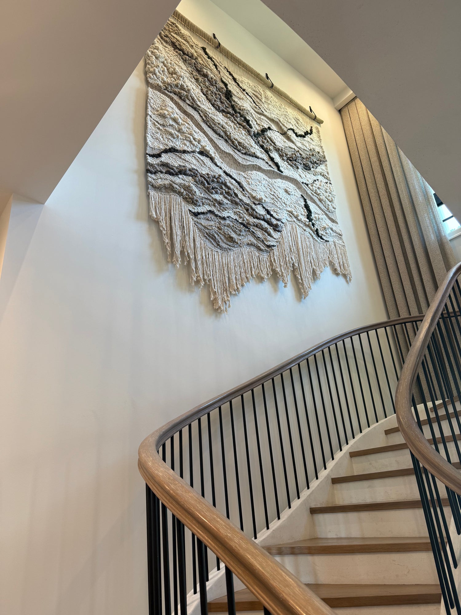 When I was looking for a unique, organic large piece of art for my client that has a one of a kind custom home, I found Rebecca Whitaker. I was initially cautious, as I had not worked with her previously; however, her creations had stellar reviews and after scheduling a Zoom meeting, the client and I decided to commission her to weave a statement piece for their home.