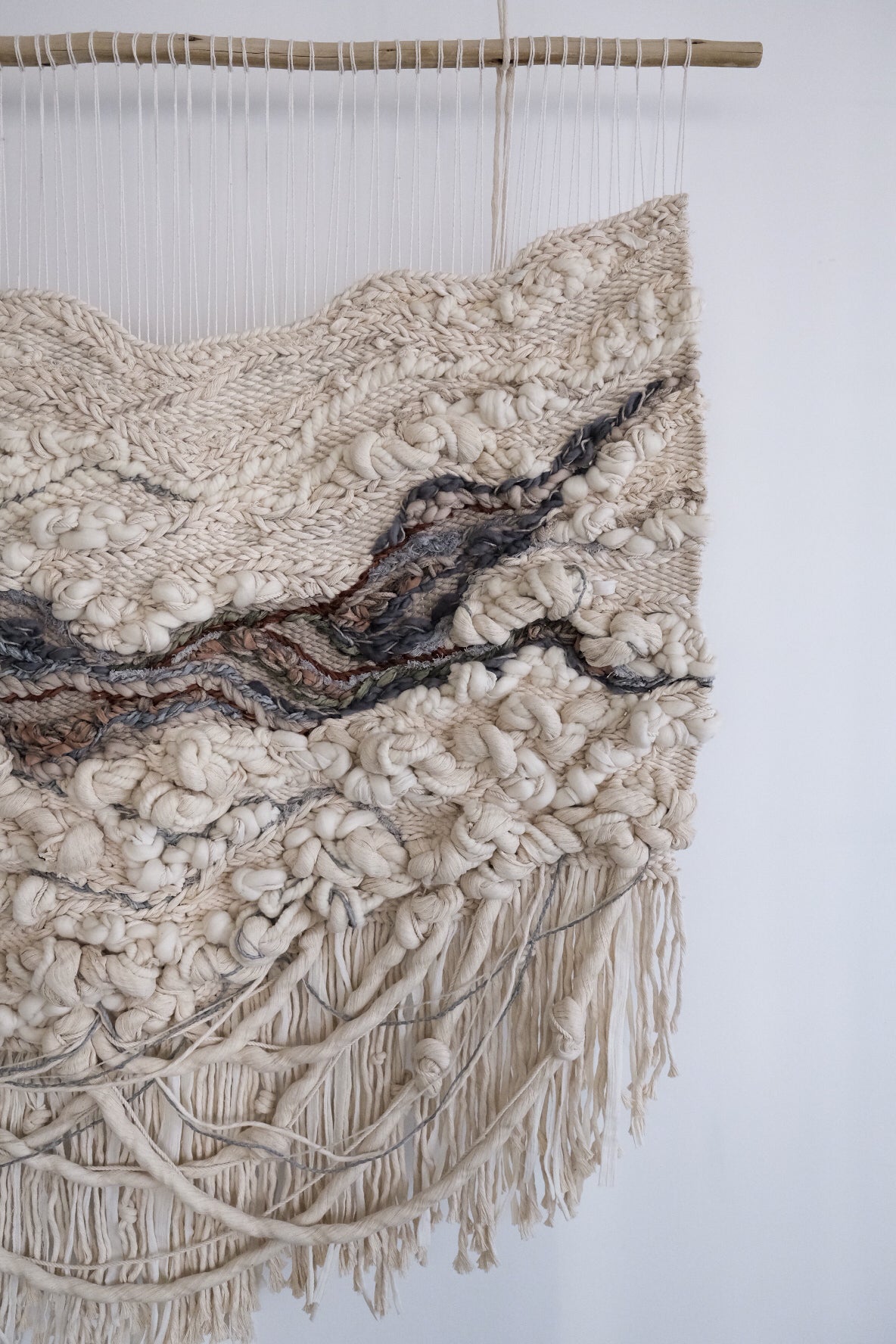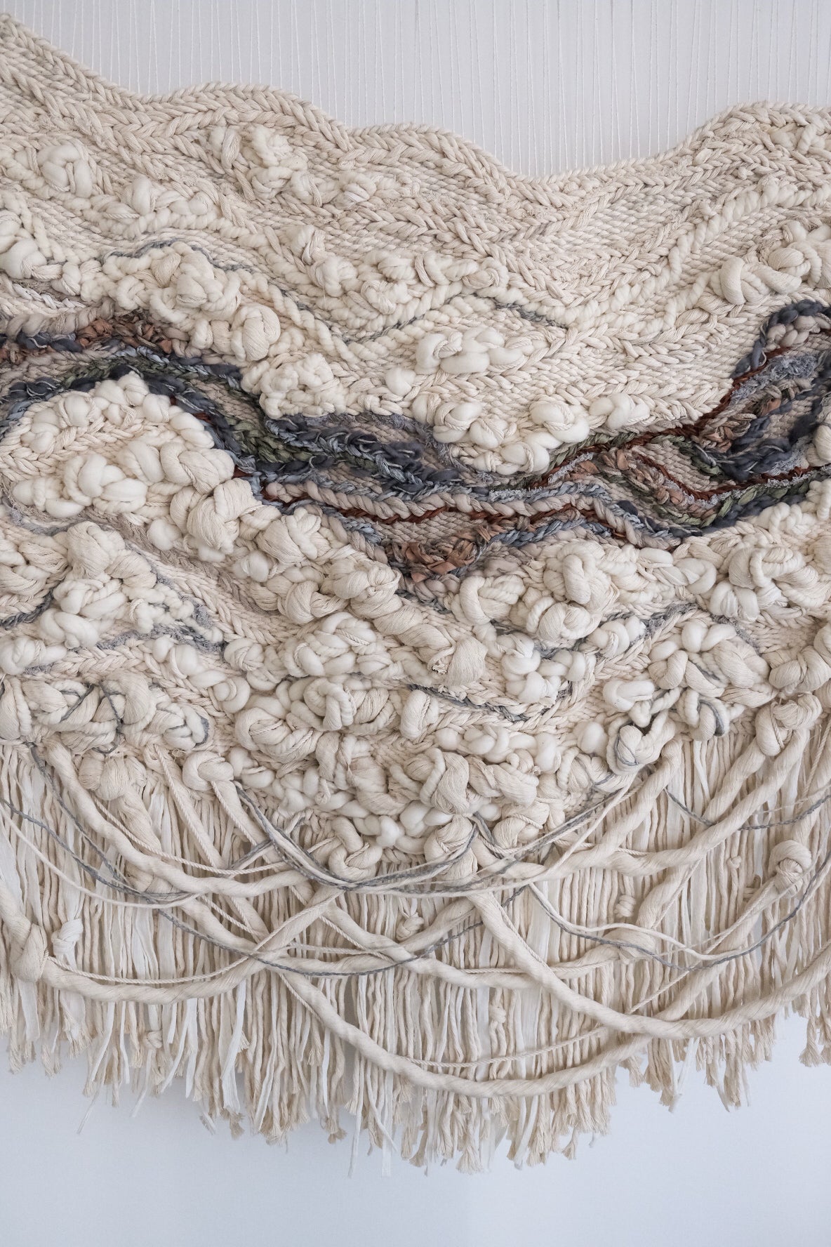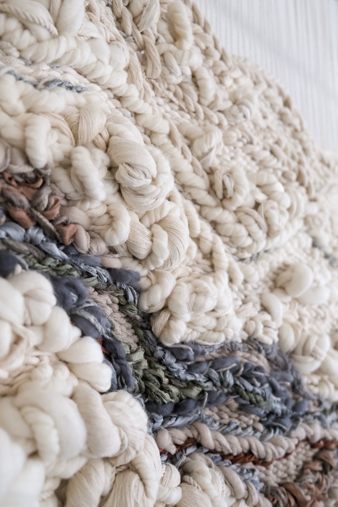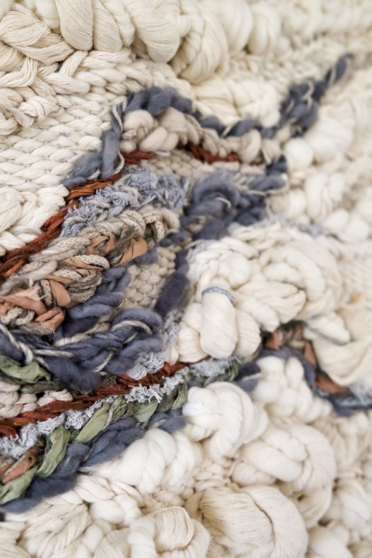 Its soft, neutral palette — anchored by slate blue, flecks of rust, and delicate traces of green — is paired with richly knotted textures, inviting a tactile, contemplative experience. Both sculptural and subtle, this work reflects a connection to landscape, weather, and emotional resonance through fiber.
