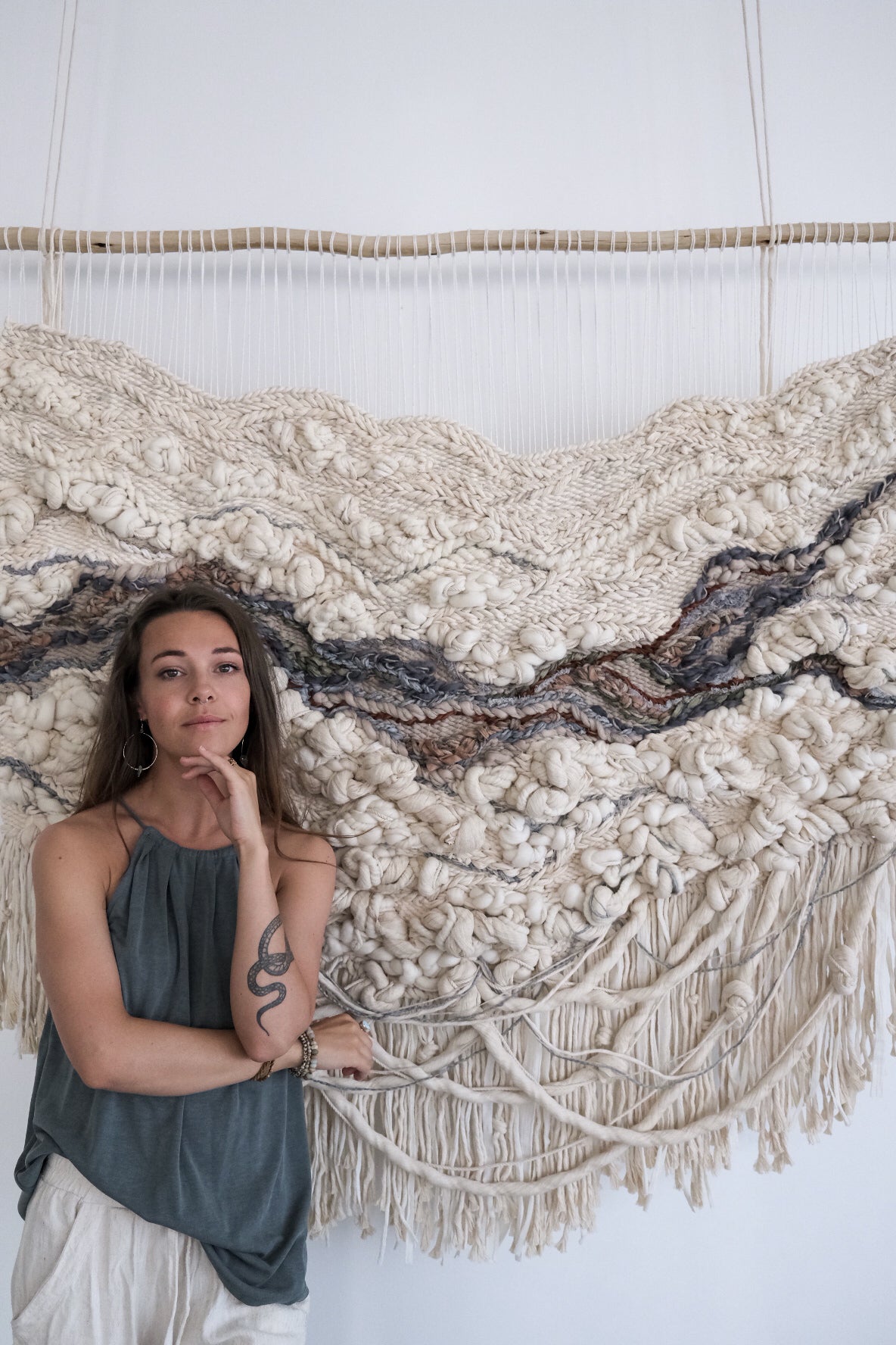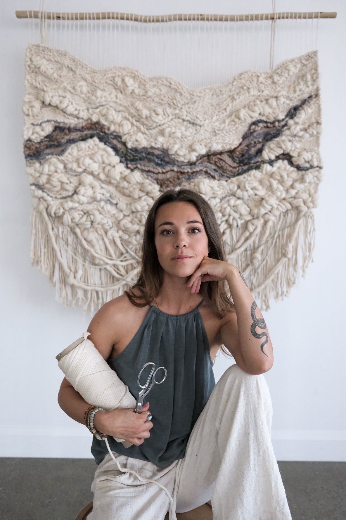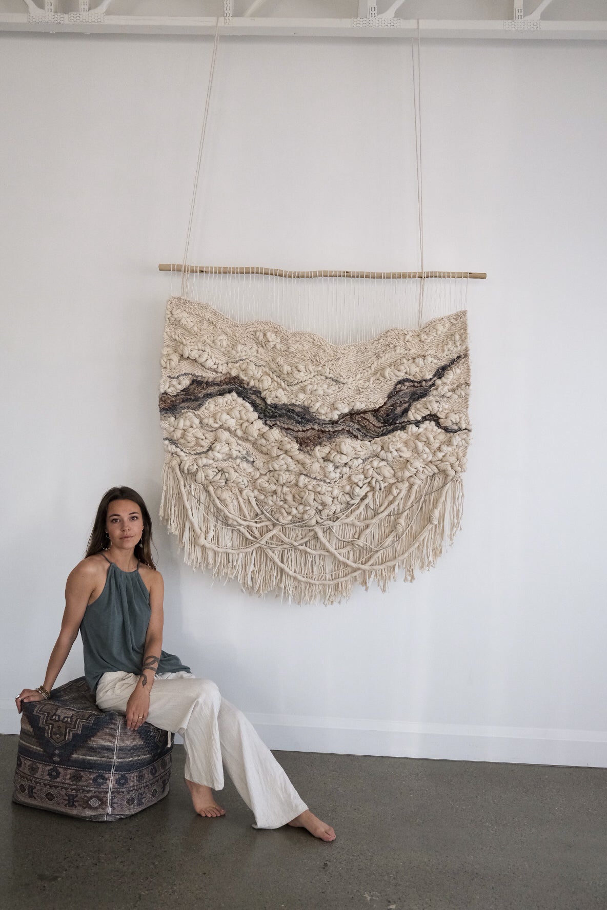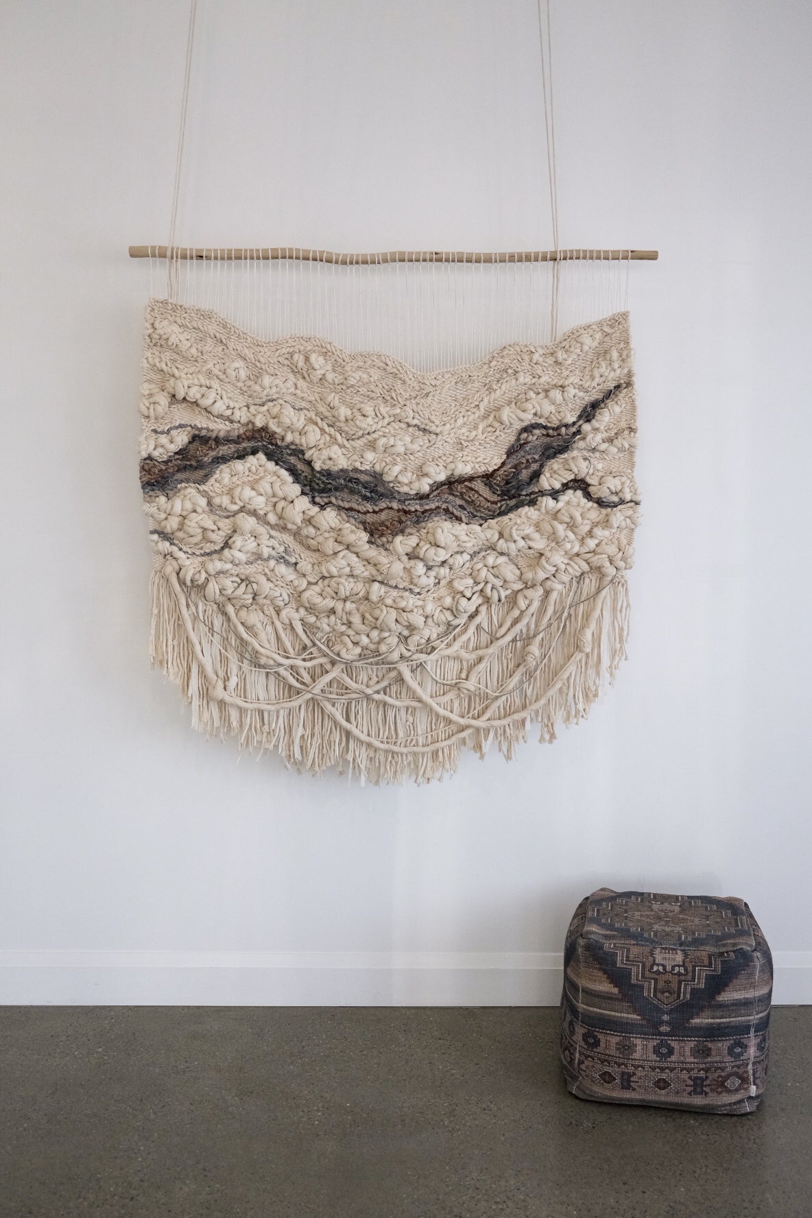 After the Rain is a handwoven tapestry created for a private collector in North Muskegon, Michigan. Measuring 4 by 4 feet and suspended from a natural eucalyptus branch, this piece explores the grounded stillness that follows a passing storm.