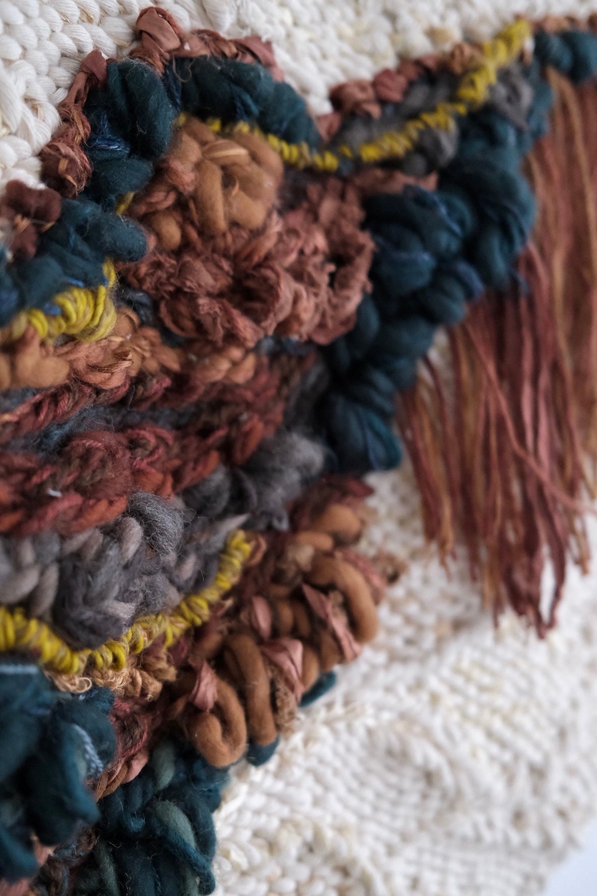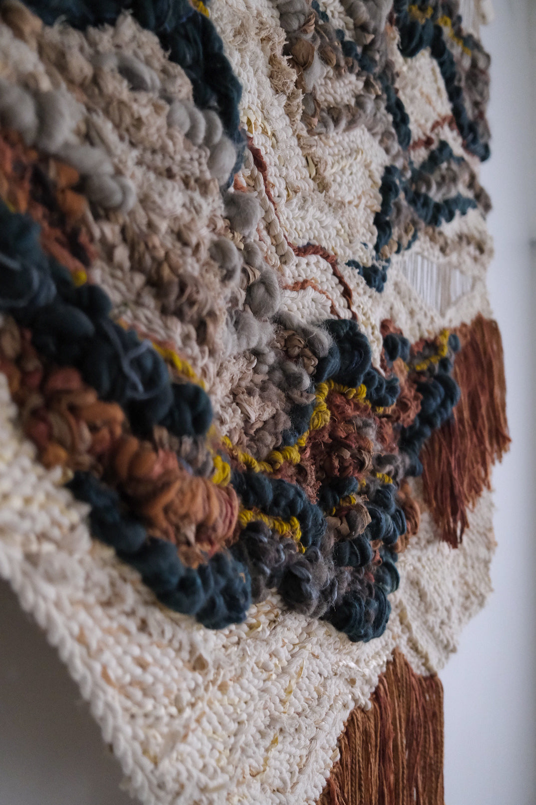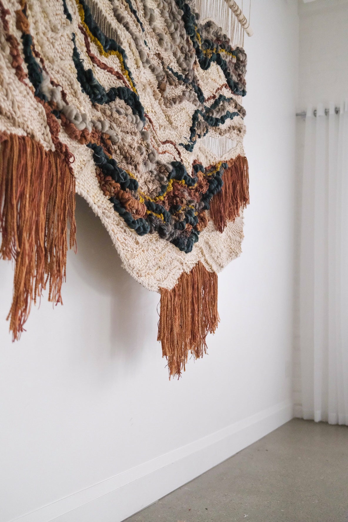 Please handle with care. Rebecca's work is designed to be a decorative wall hanging only, not to be used as rugs or regularly handled. Avoid moisture except to gently steam the fringe if necessary shortly after installation. Use clean hands to comb through fringe or straighten strings at the top, careful to avoid snagging fibers. No maintenance cleaning is necessary besides gently dusting with a feather dusty as needed.