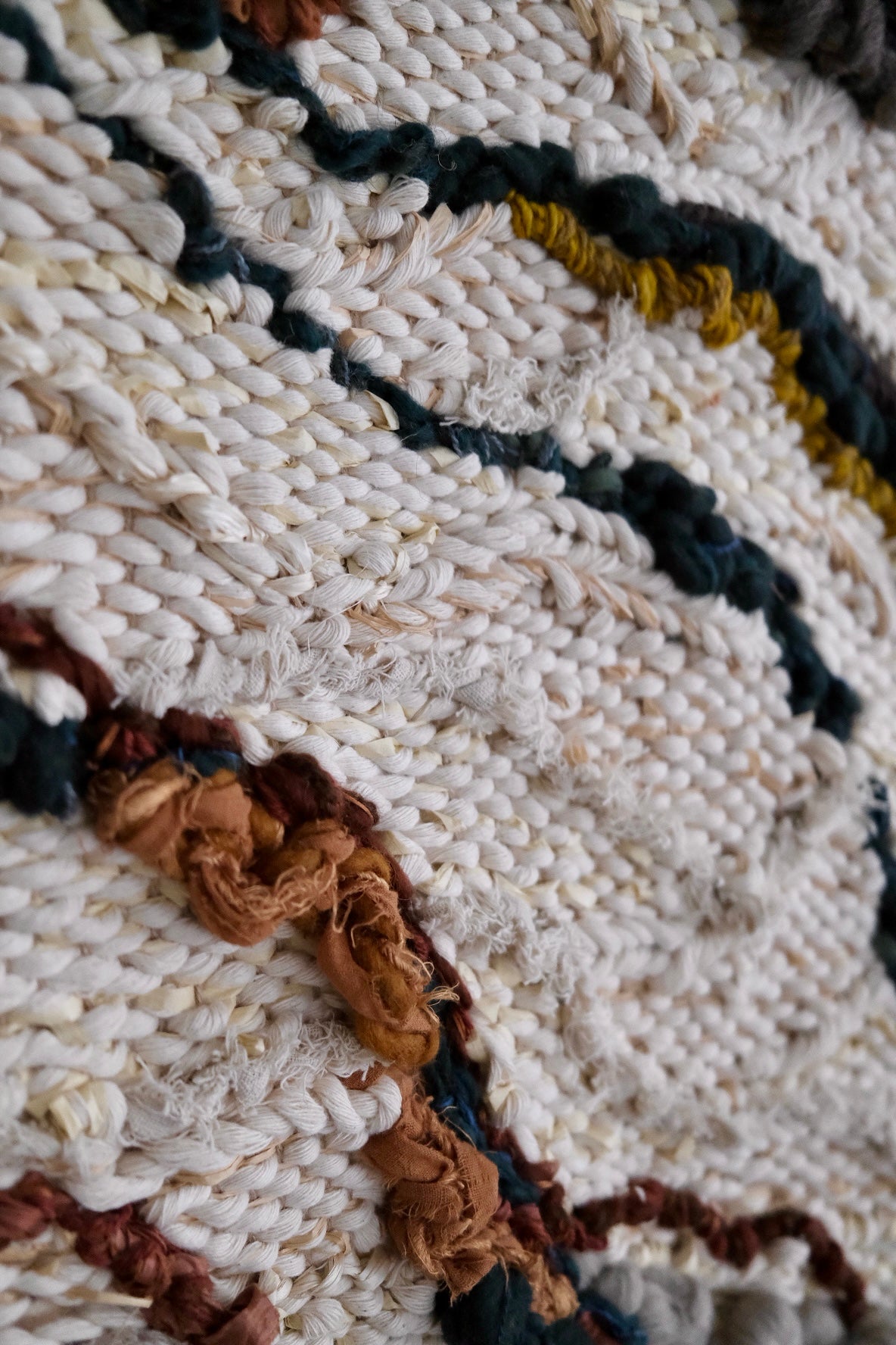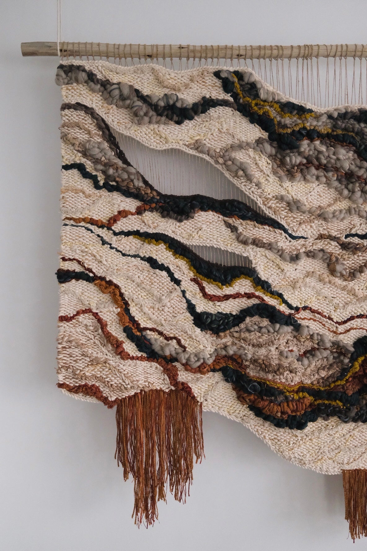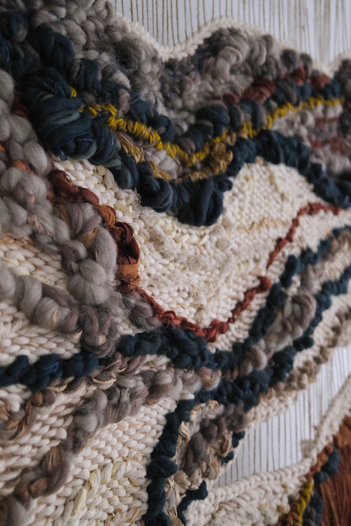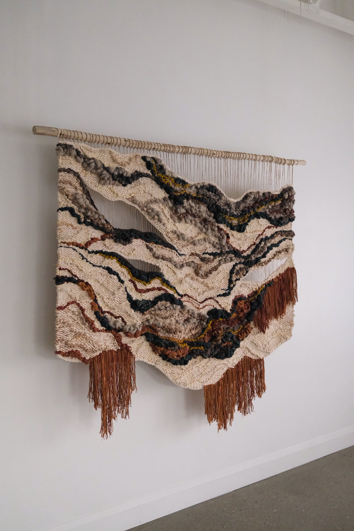 Please handle with care. Rebecca's work is designed to be a decorative wall hanging only, not to be used as rugs or regularly handled. Avoid moisture except to gently steam the fringe if necessary shortly after installation. Use clean hands to comb through fringe or straighten strings at the top, careful to avoid snagging fibers. No maintenance cleaning is necessary besides gently dusting with a feather dusty as needed.