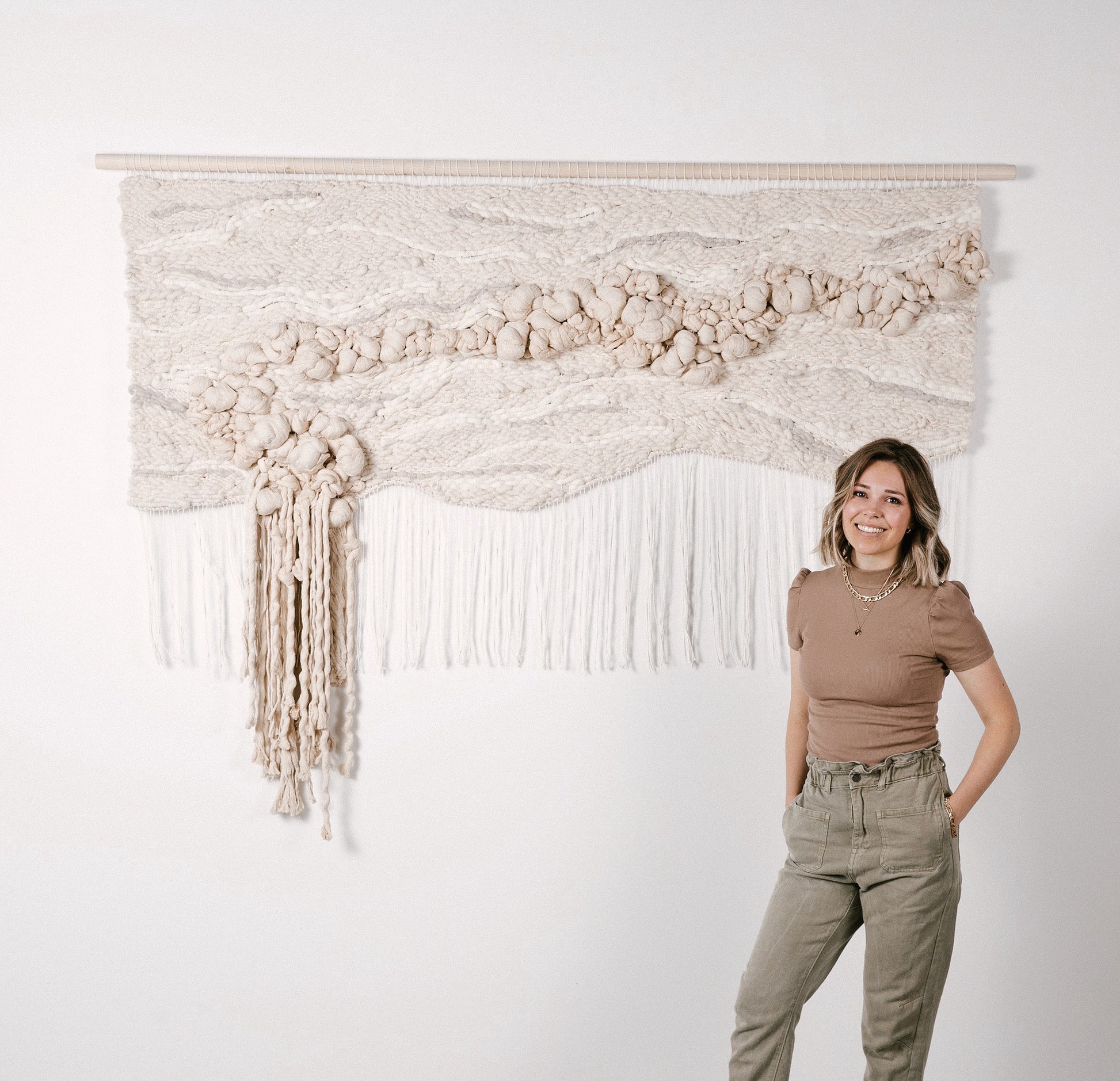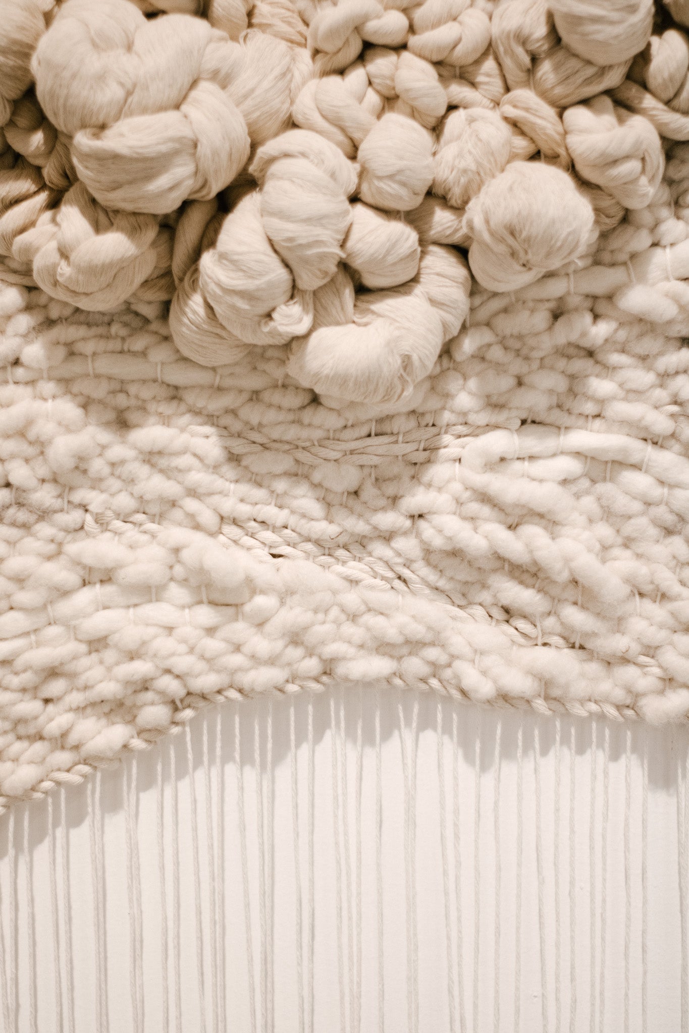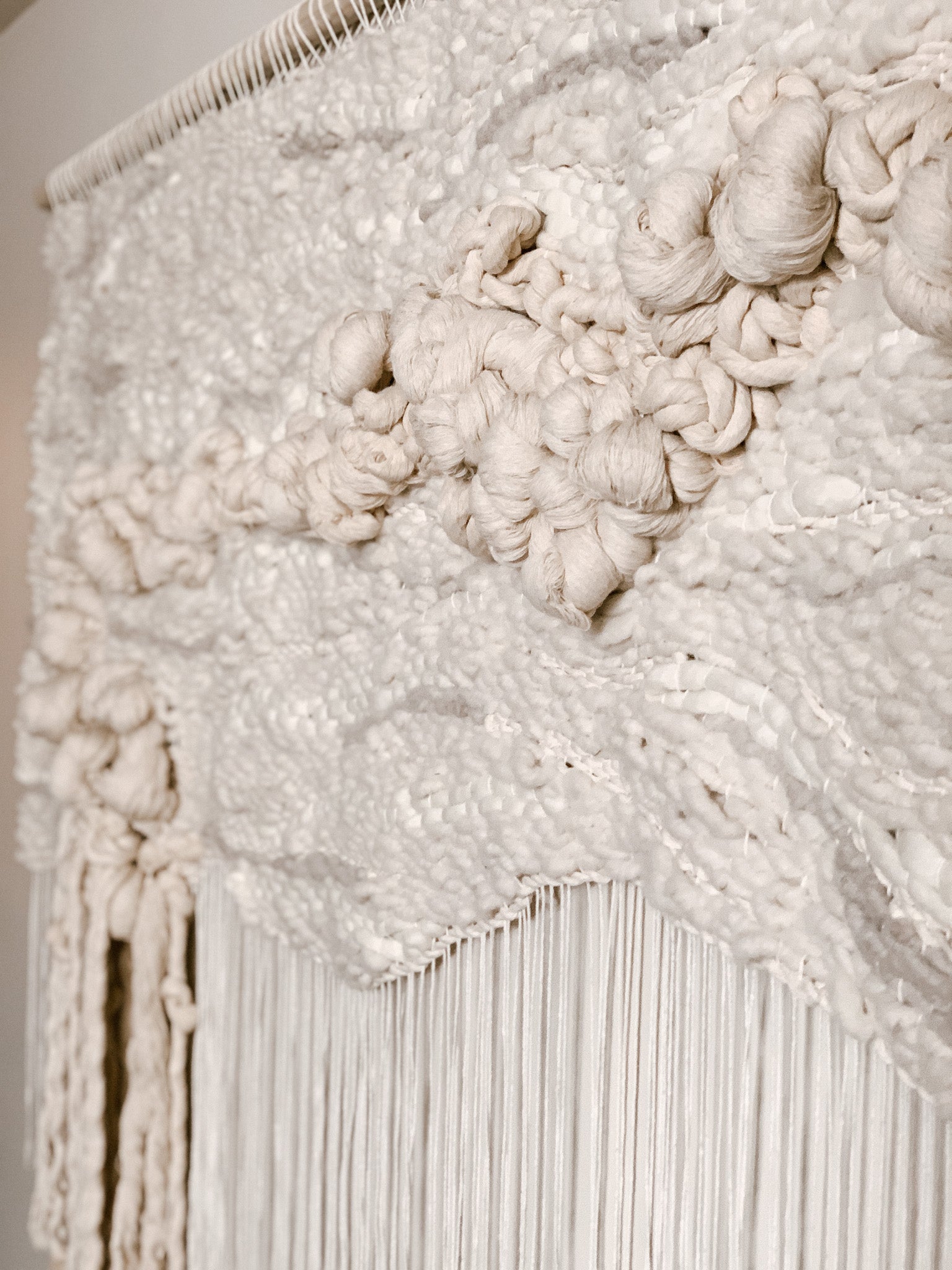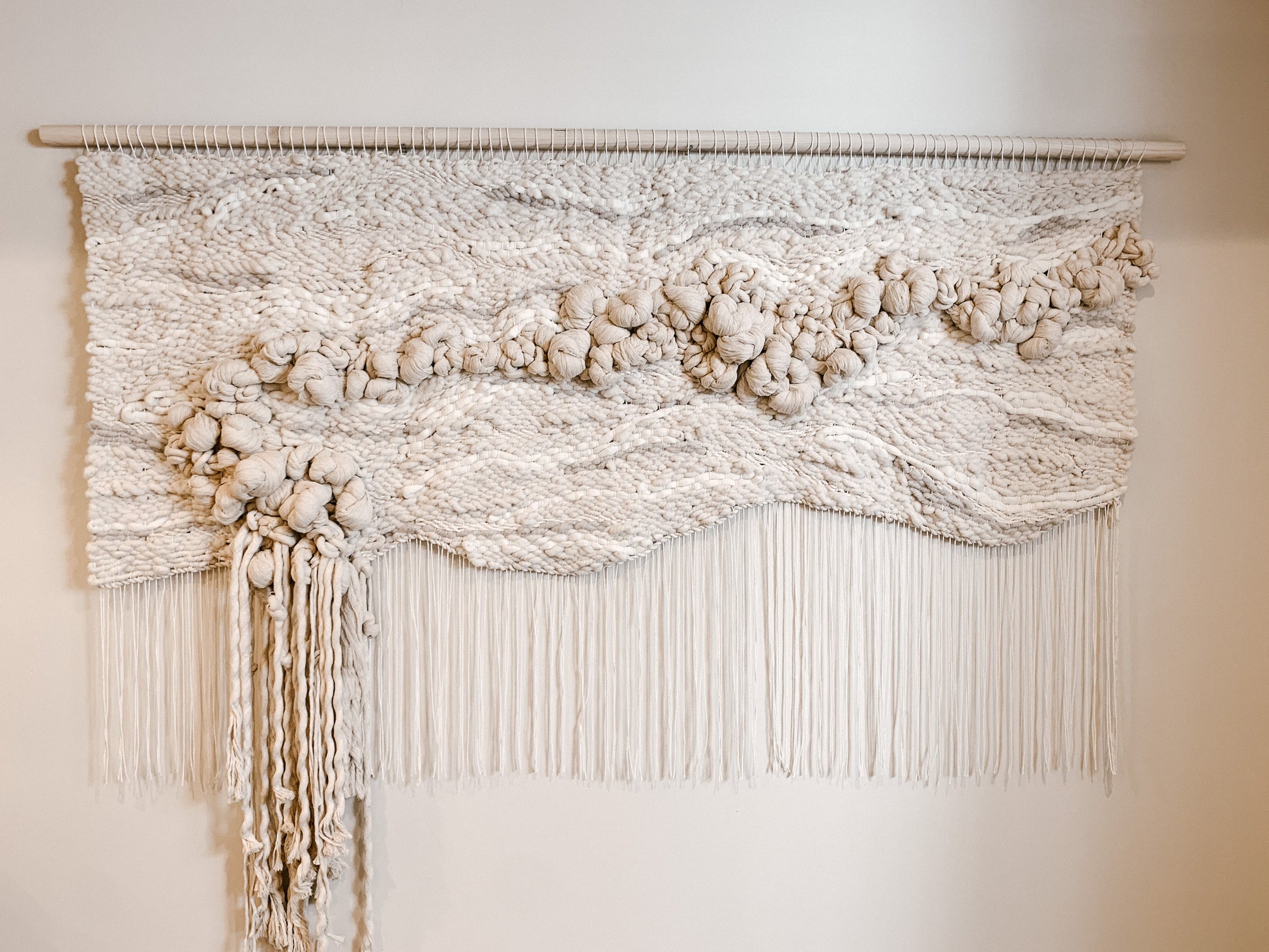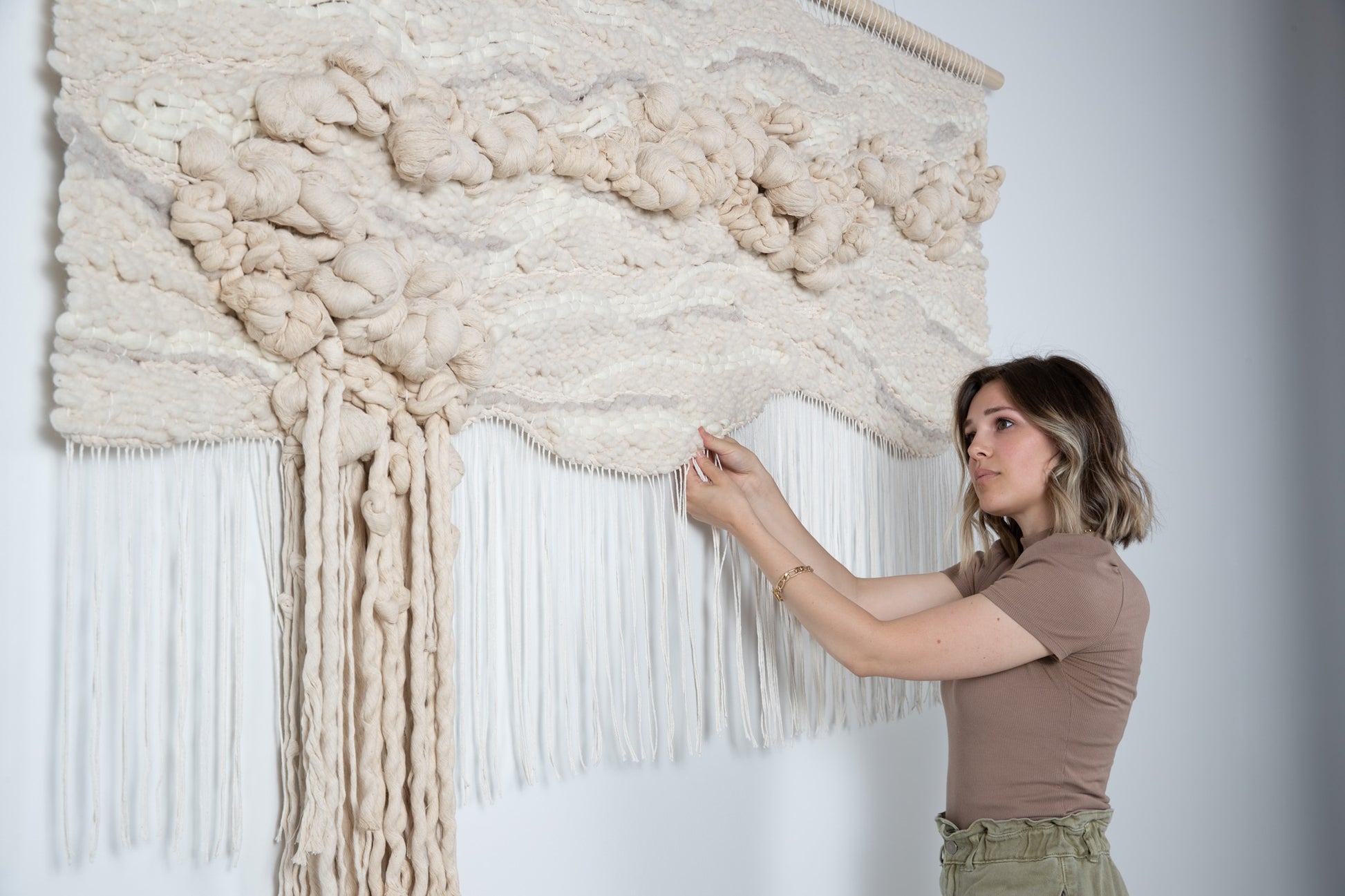 Please handle with care. Rebecca's work is designed to be a decorative wall hanging only, not to be used as rugs or regularly handled. Avoid moisture except to gently steam the fringe if necessary shortly after installation. Use clean hands to comb through fringe or straighten strings at the top, careful to avoid snagging fibers. No maintenance cleaning is necessary besides gently dusting with a feather dusty as needed.