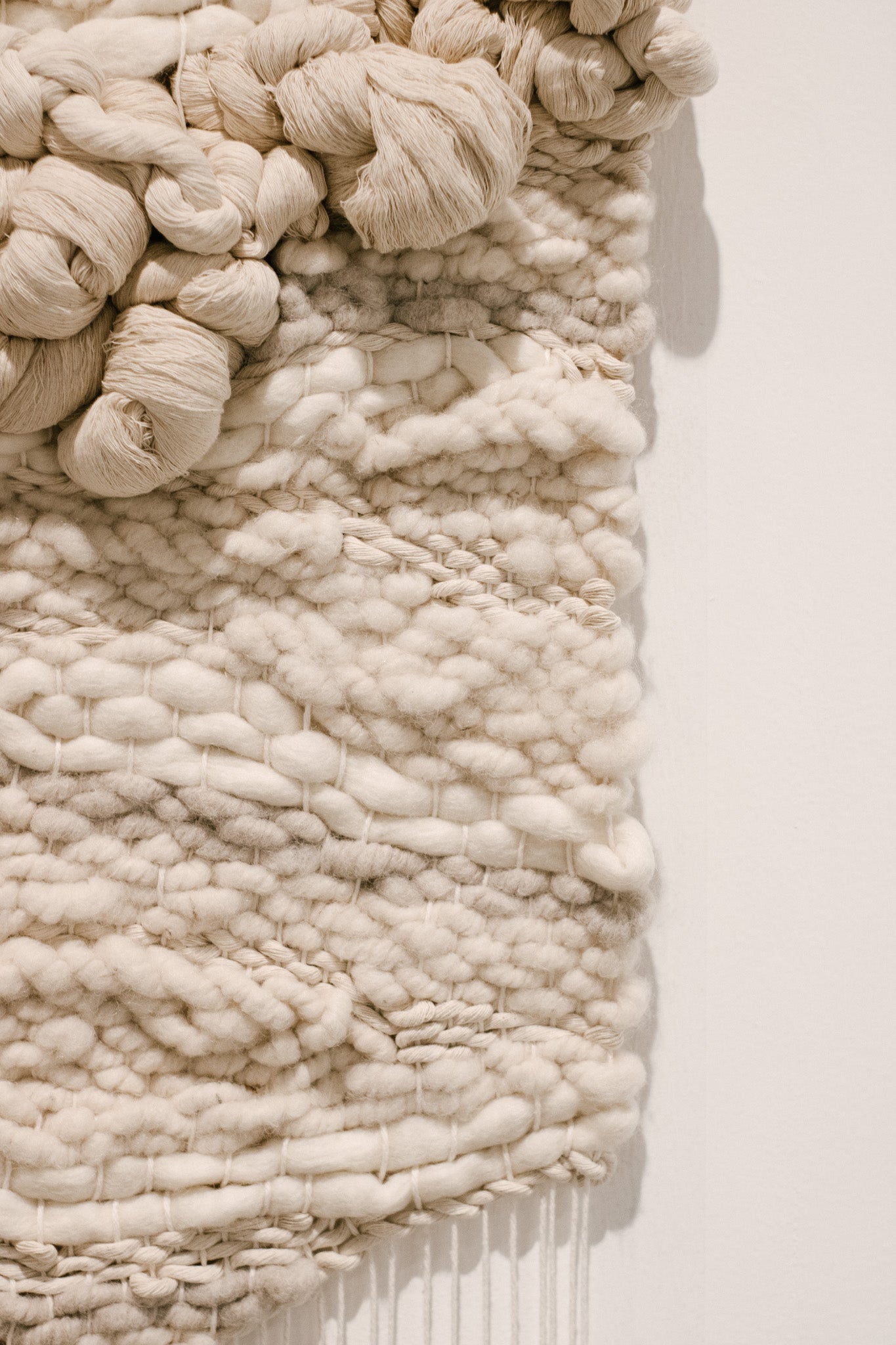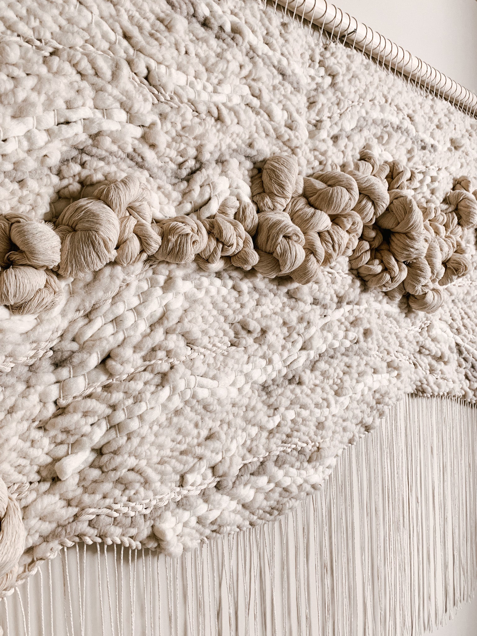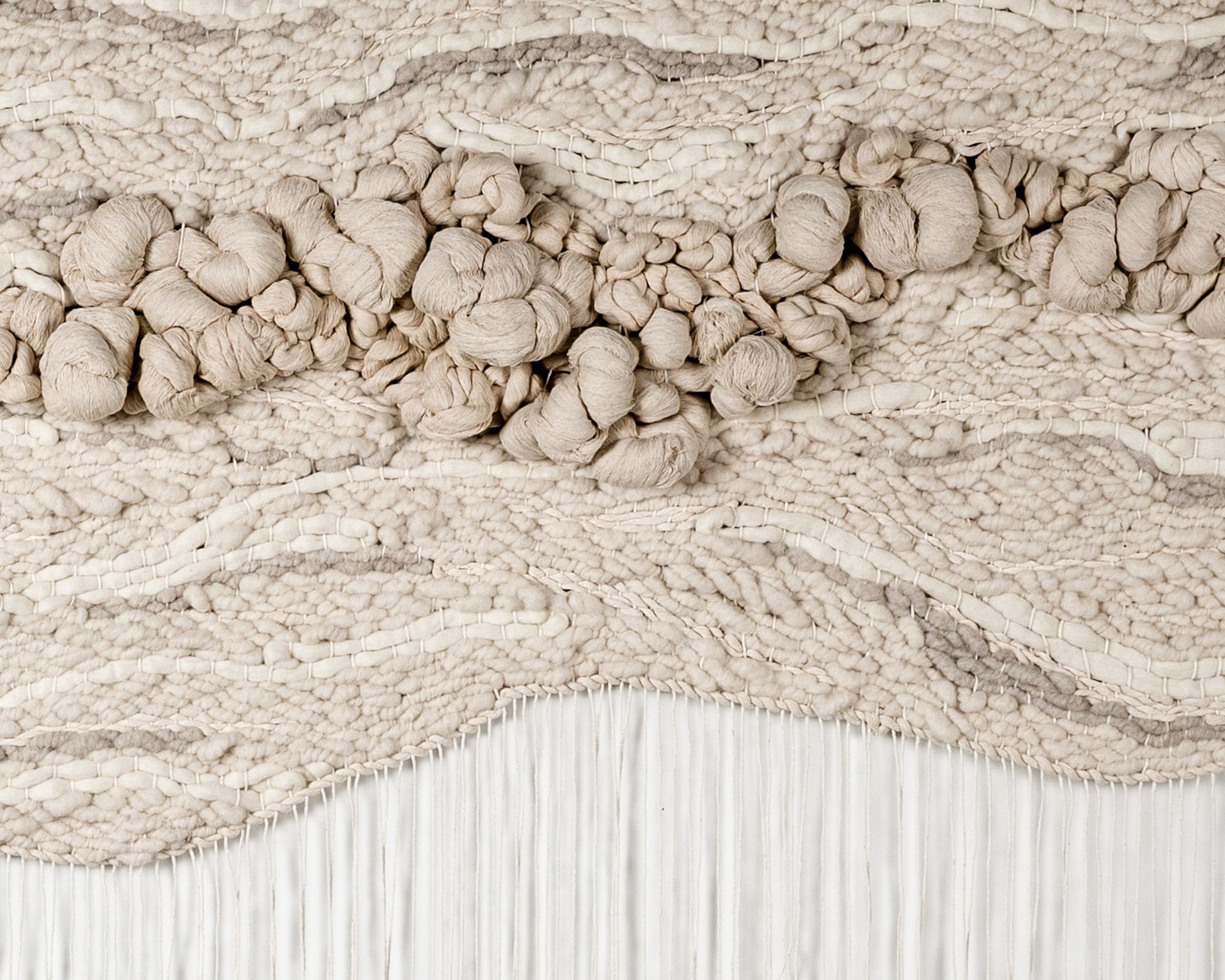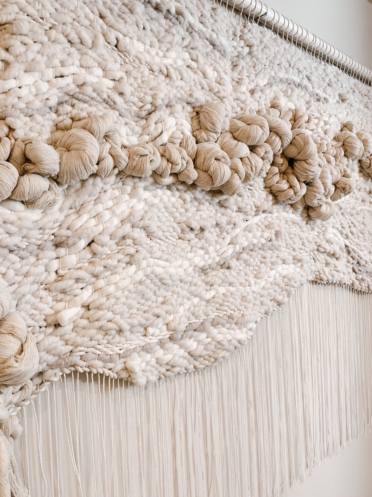 Please handle with care. Rebecca's work is designed to be a decorative wall hanging only, not to be used as rugs or regularly handled. Avoid moisture except to gently steam the fringe if necessary shortly after installation. Use clean hands to comb through fringe or straighten strings at the top, careful to avoid snagging fibers. No maintenance cleaning is necessary besides gently dusting with a feather dusty as needed.
