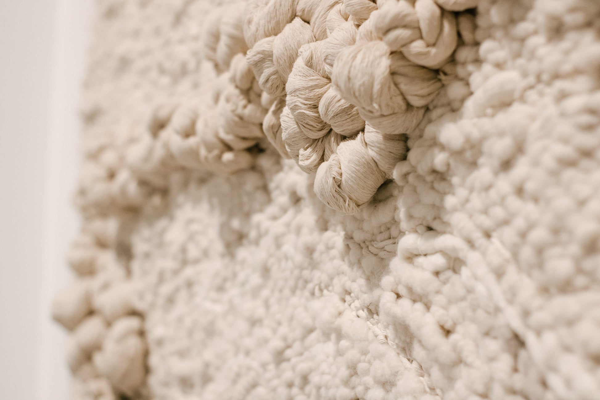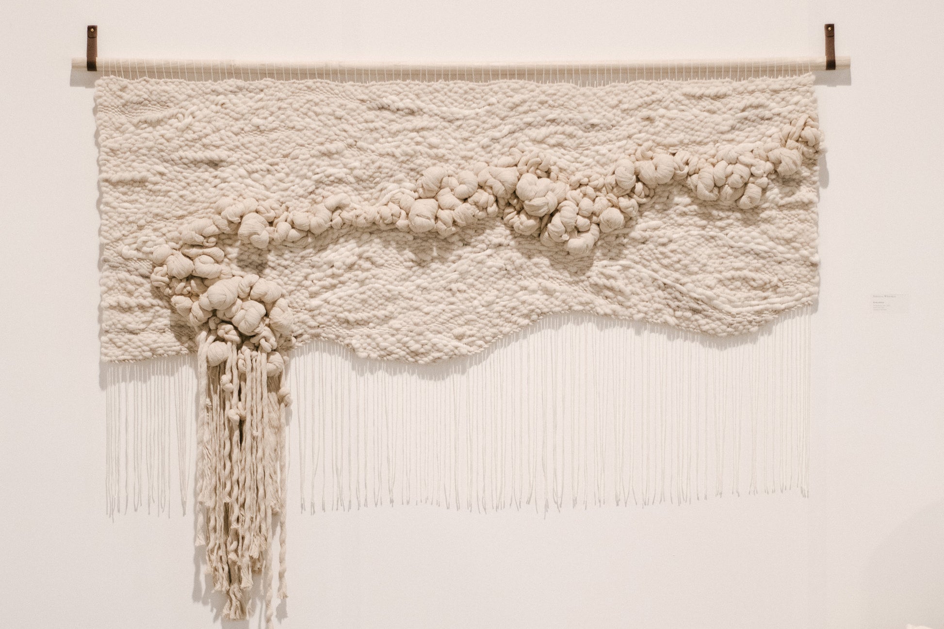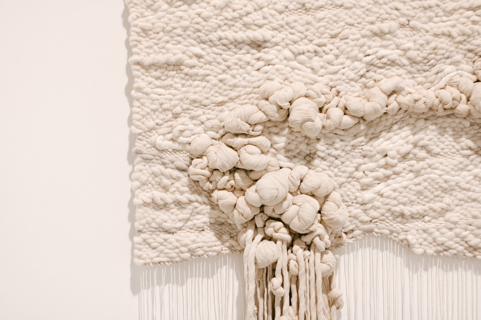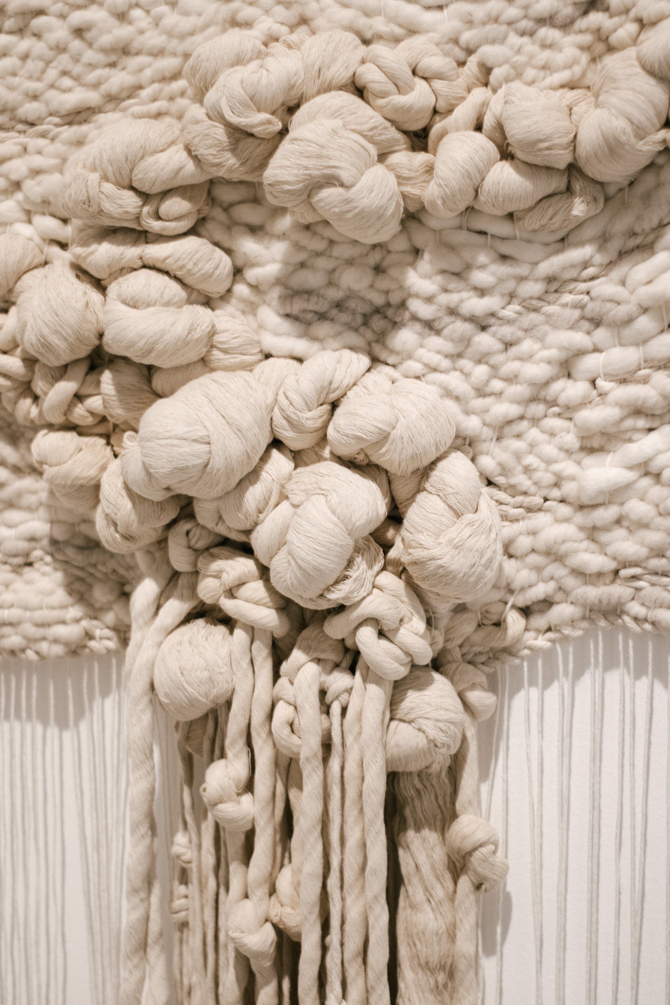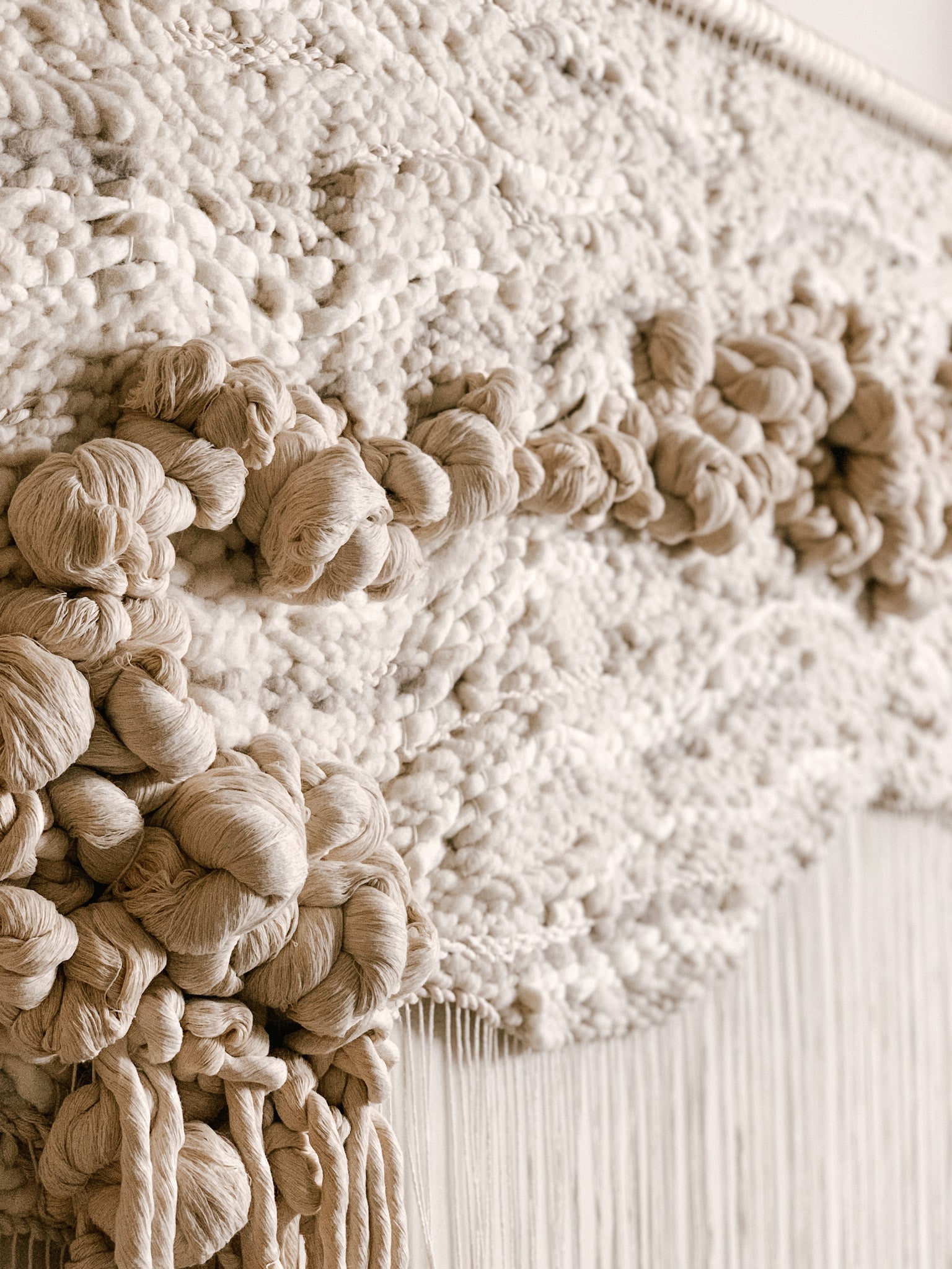 Please handle with care. Rebecca's work is designed to be a decorative wall hanging only, not to be used as rugs or regularly handled. Avoid moisture except to gently steam the fringe if necessary shortly after installation. Use clean hands to comb through fringe or straighten strings at the top, careful to avoid snagging fibers. No maintenance cleaning is necessary besides gently dusting with a feather dusty as needed.