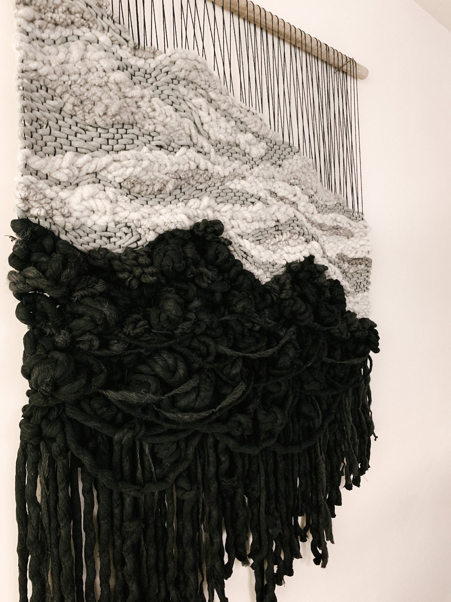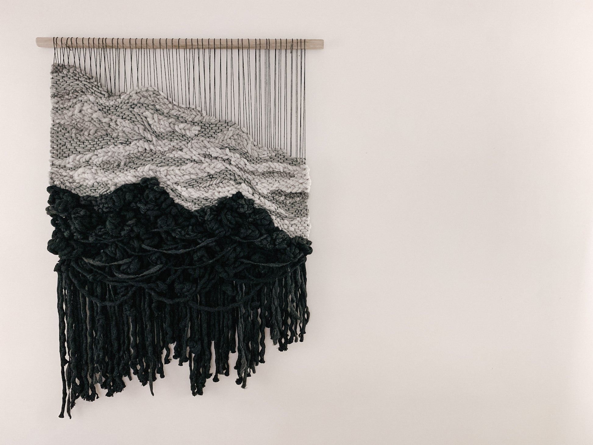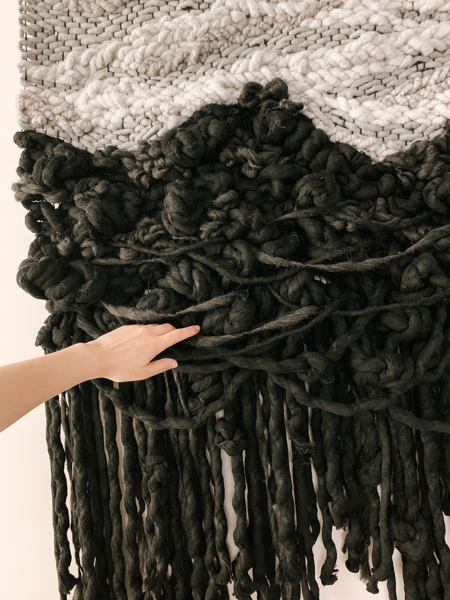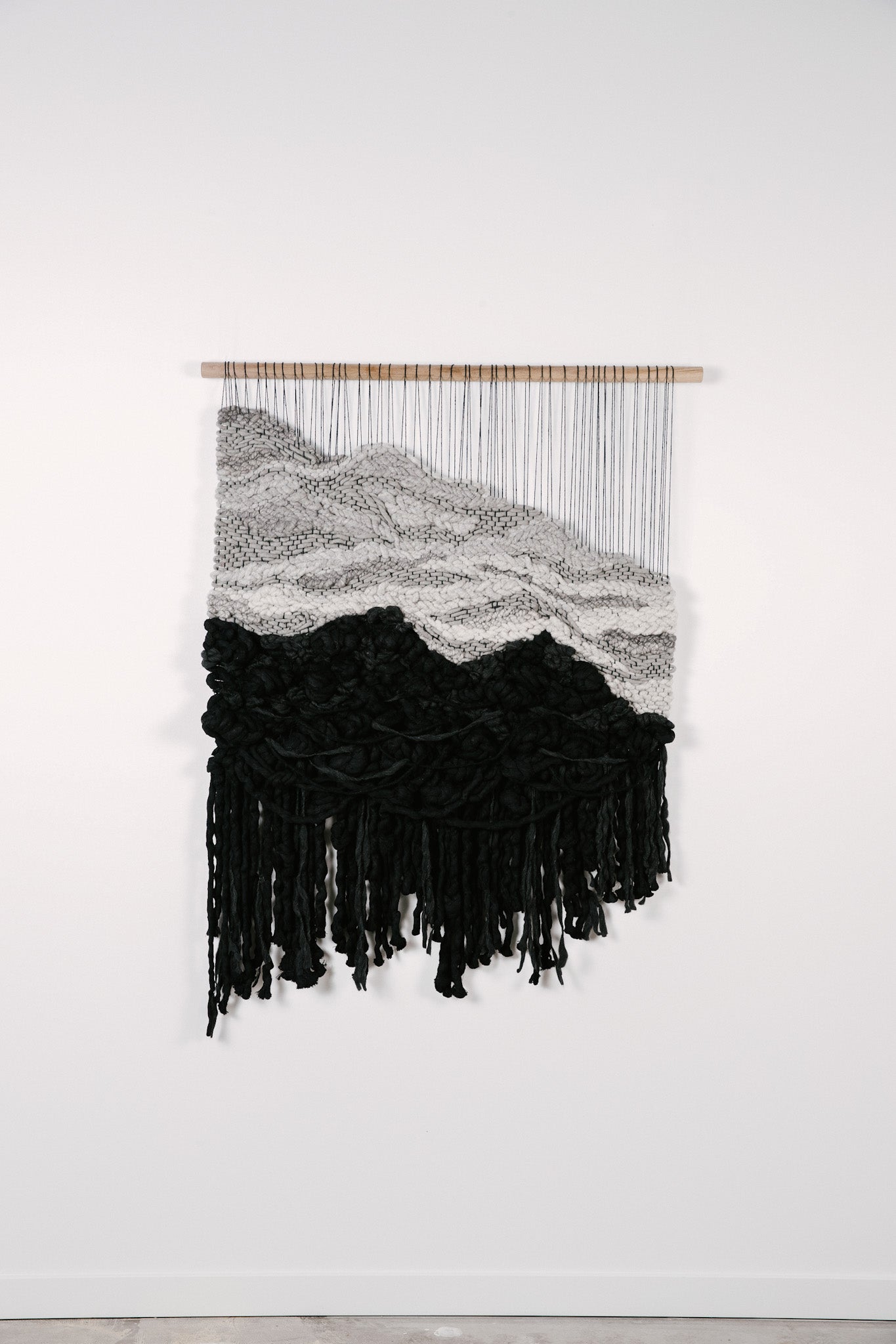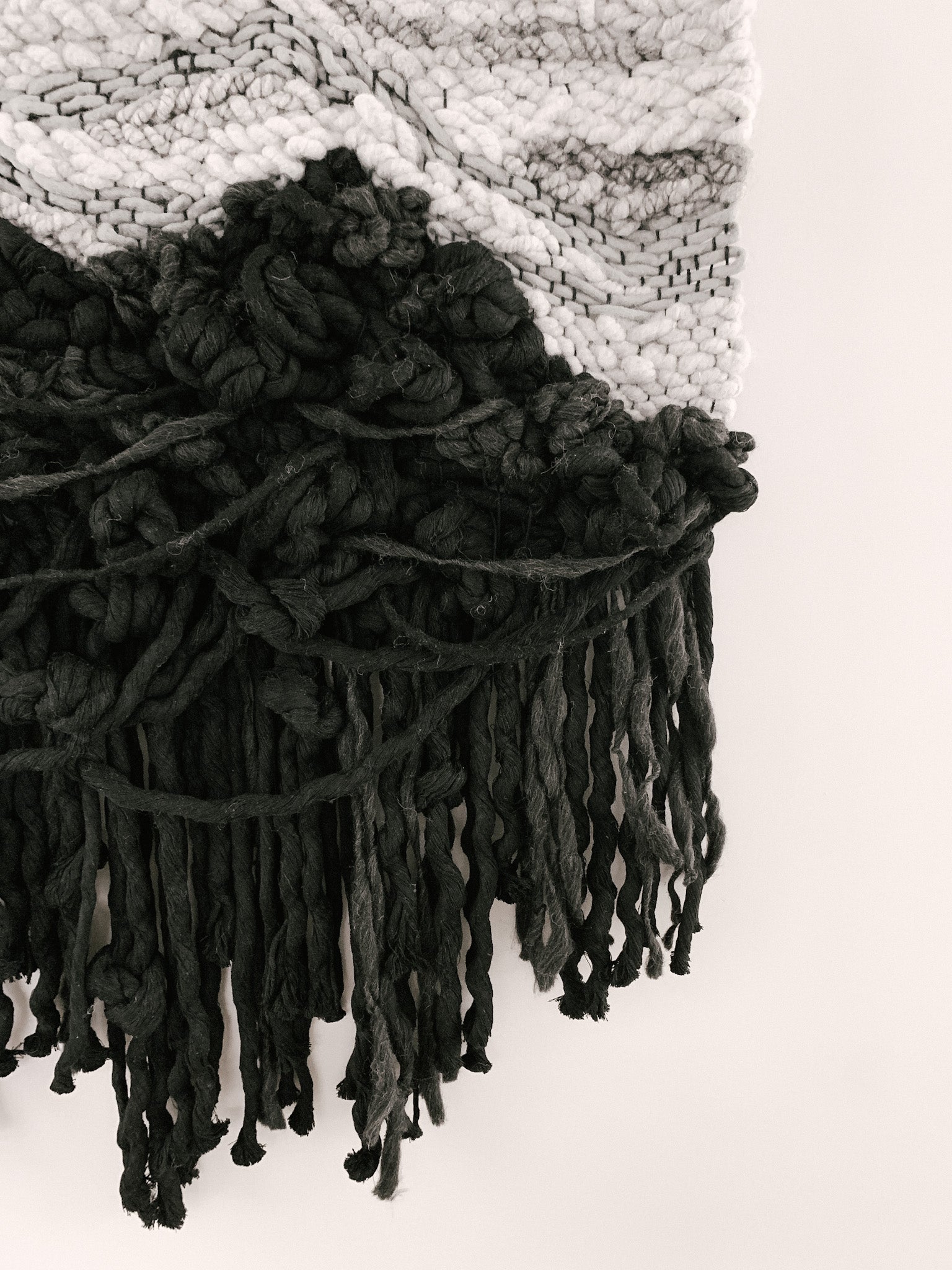 Please handle with care. Rebecca's work is designed to be a decorative wall hanging only, not to be used as rugs or regularly handled. Avoid moisture except to gently steam the fringe if necessary shortly after installation. Use clean hands to comb through fringe or straighten strings at the top, careful to avoid snagging fibers. No maintenance cleaning is necessary besides gently dusting with a feather dusty as needed.