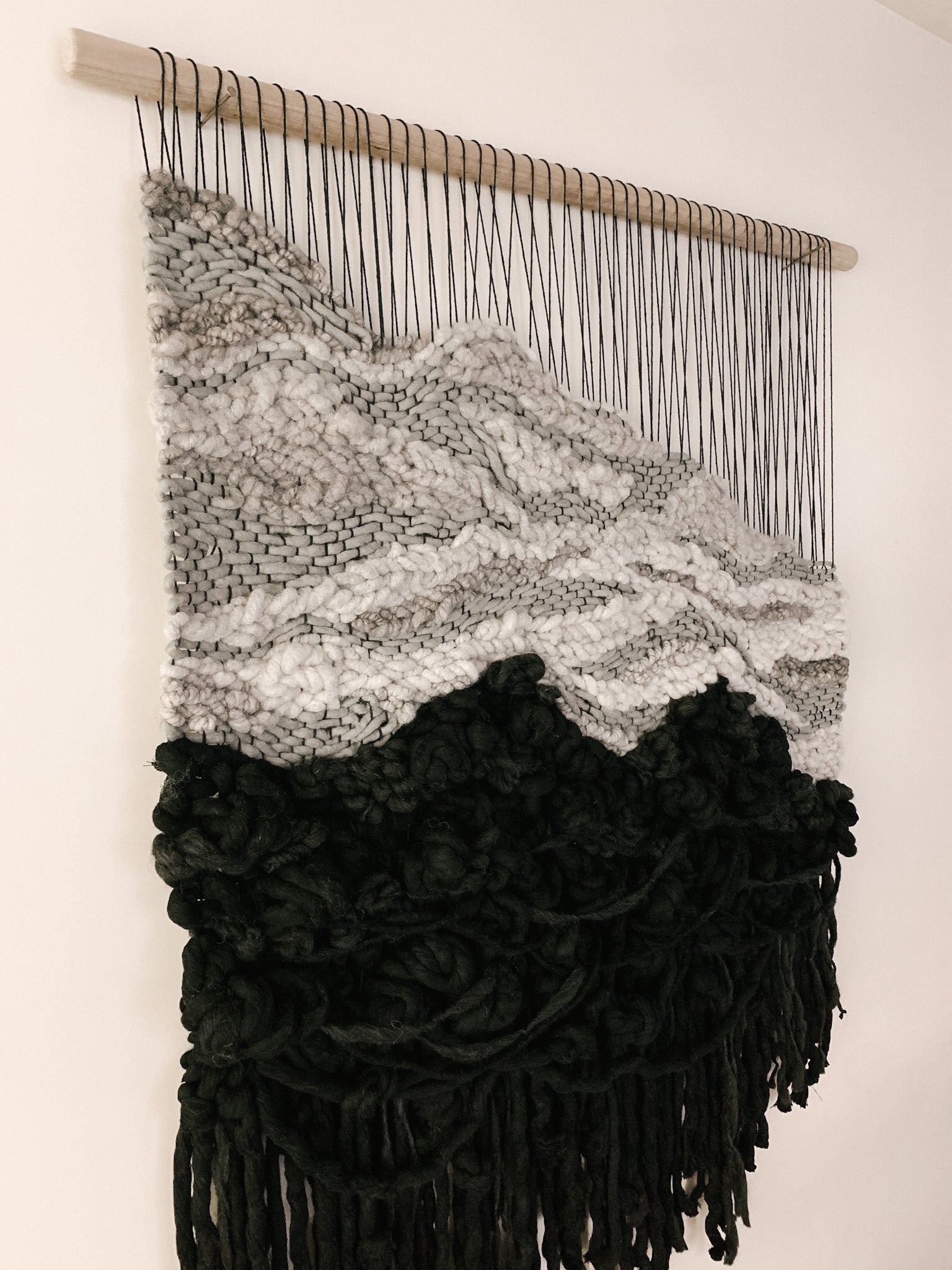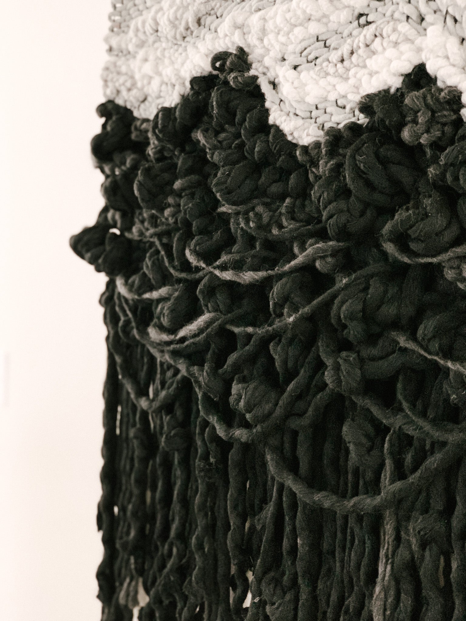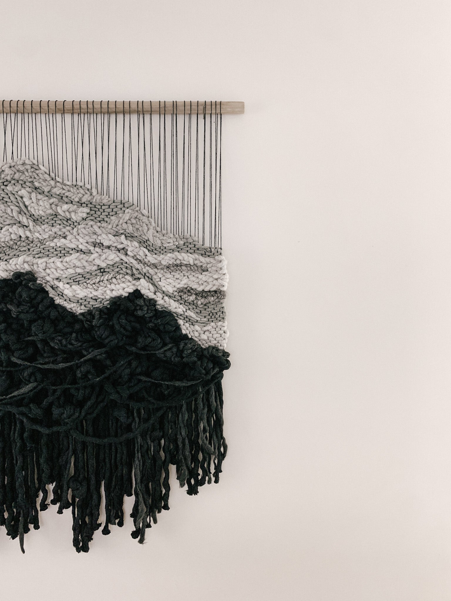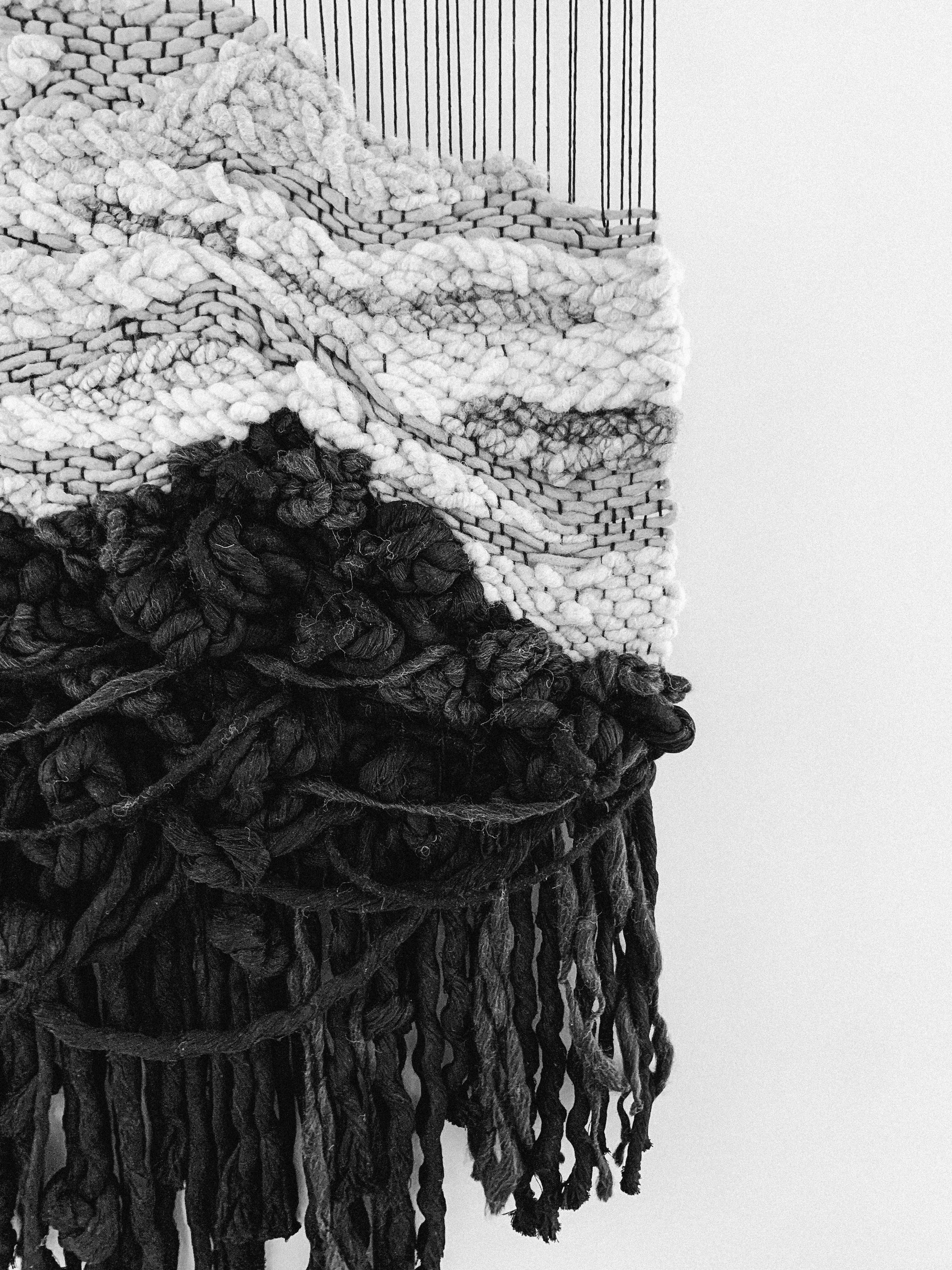 Please handle with care. Rebecca's work is designed to be a decorative wall hanging only, not to be used as rugs or regularly handled. Avoid moisture except to gently steam the fringe if necessary shortly after installation. Use clean hands to comb through fringe or straighten strings at the top, careful to avoid snagging fibers. No maintenance cleaning is necessary besides gently dusting with a feather dusty as needed.