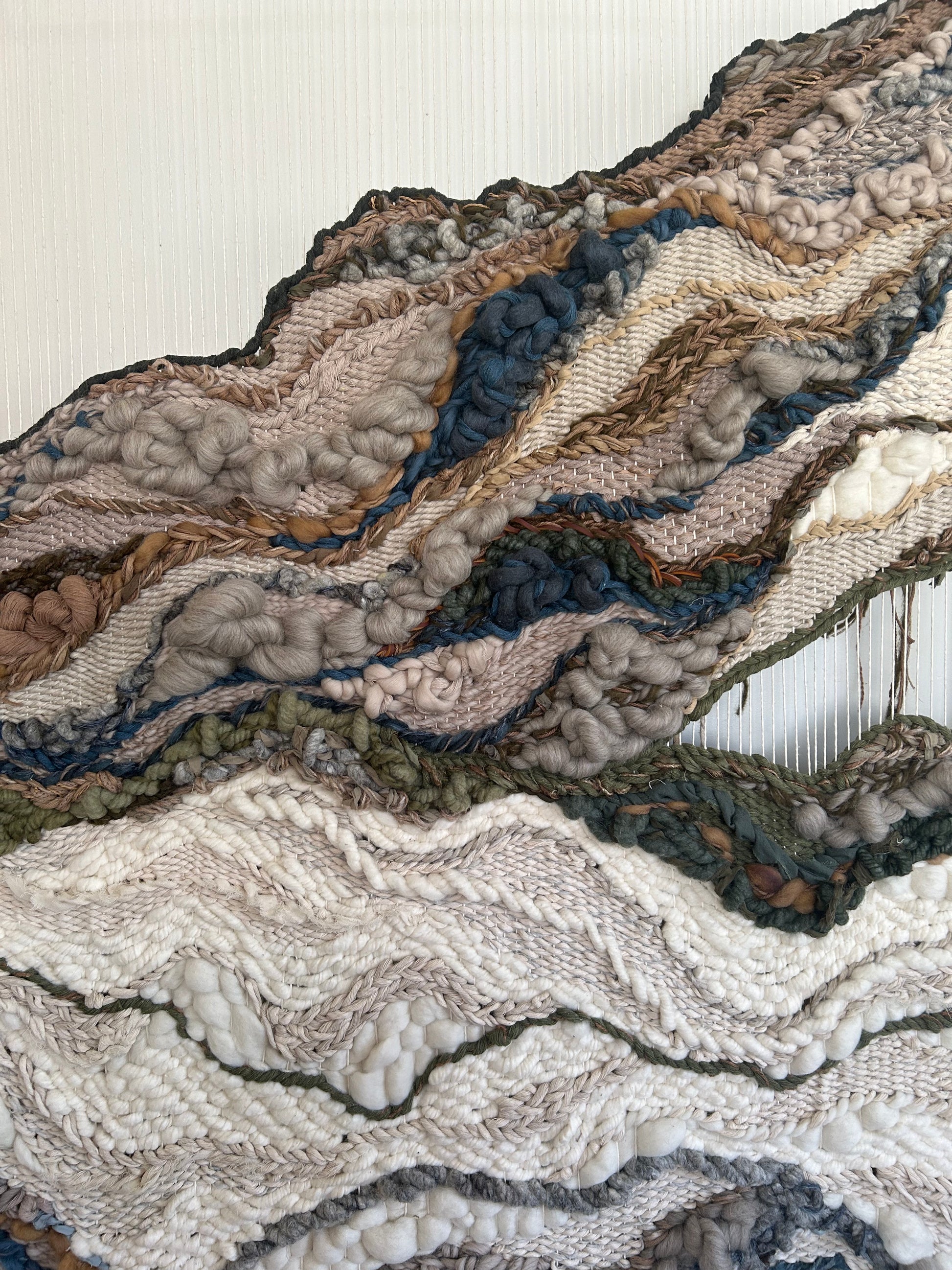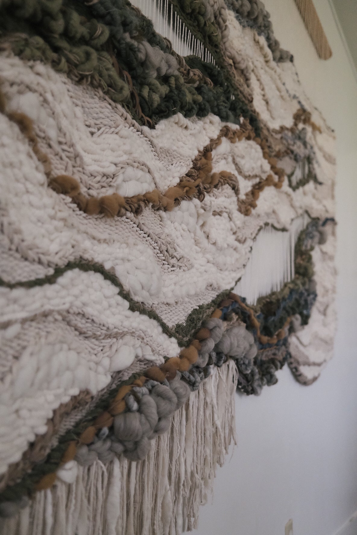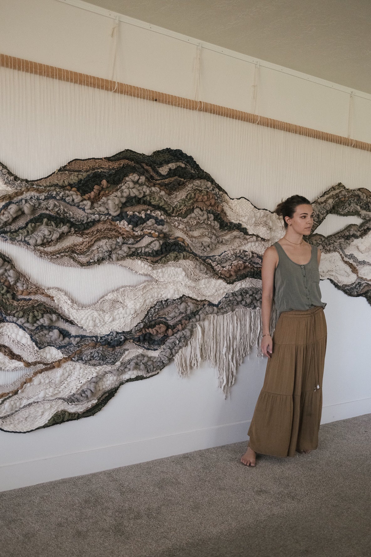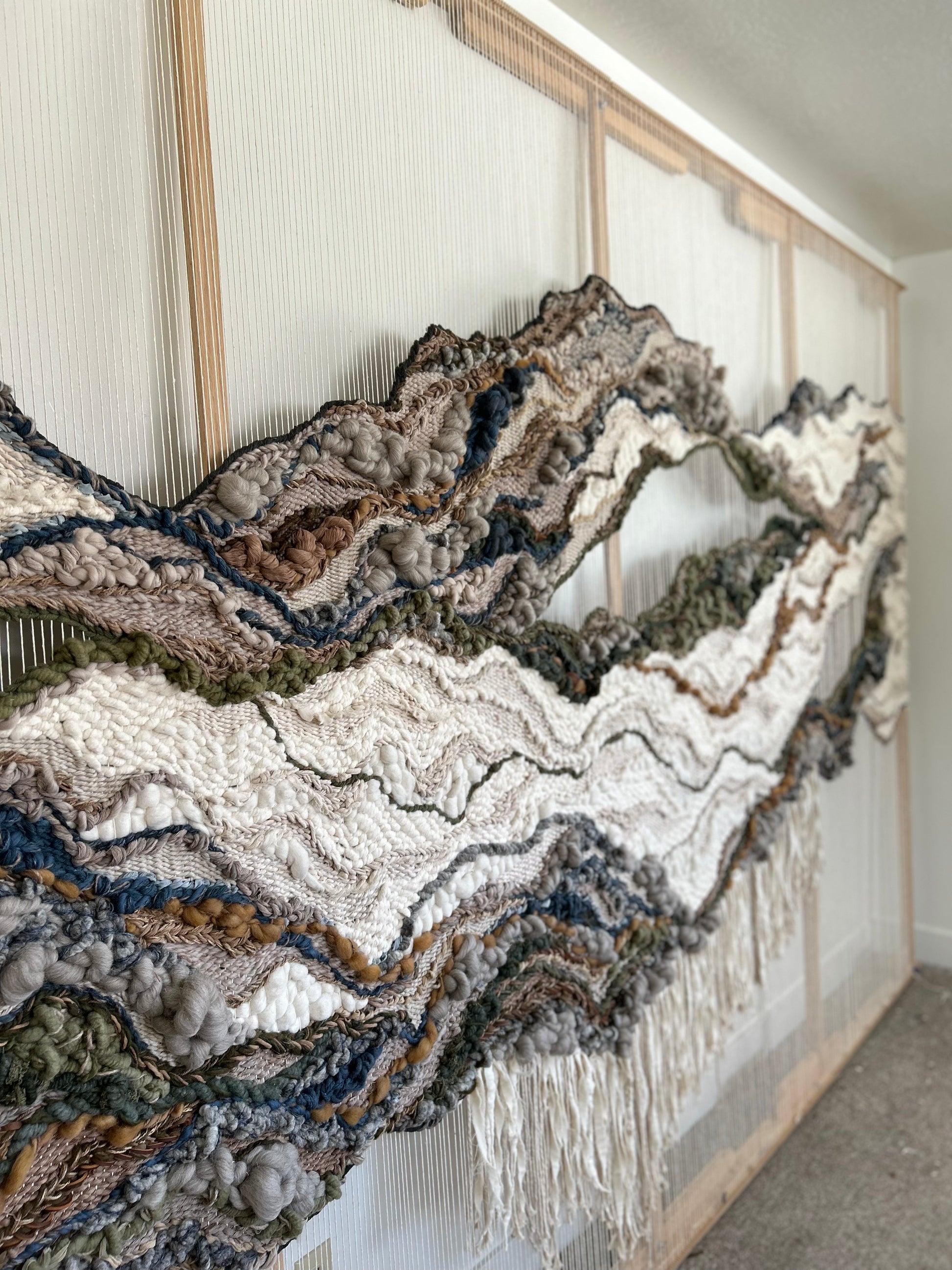 Please handle with care. Rebecca's work is designed to be a decorative wall hanging only, not to be used as rugs or regularly handled. Avoid moisture except to gently steam the fringe if necessary shortly after installation. Use clean hands to comb through fringe or straighten strings at the top, careful to avoid snagging fibers. No maintenance cleaning is necessary besides gently dusting with a feather dusty as needed.