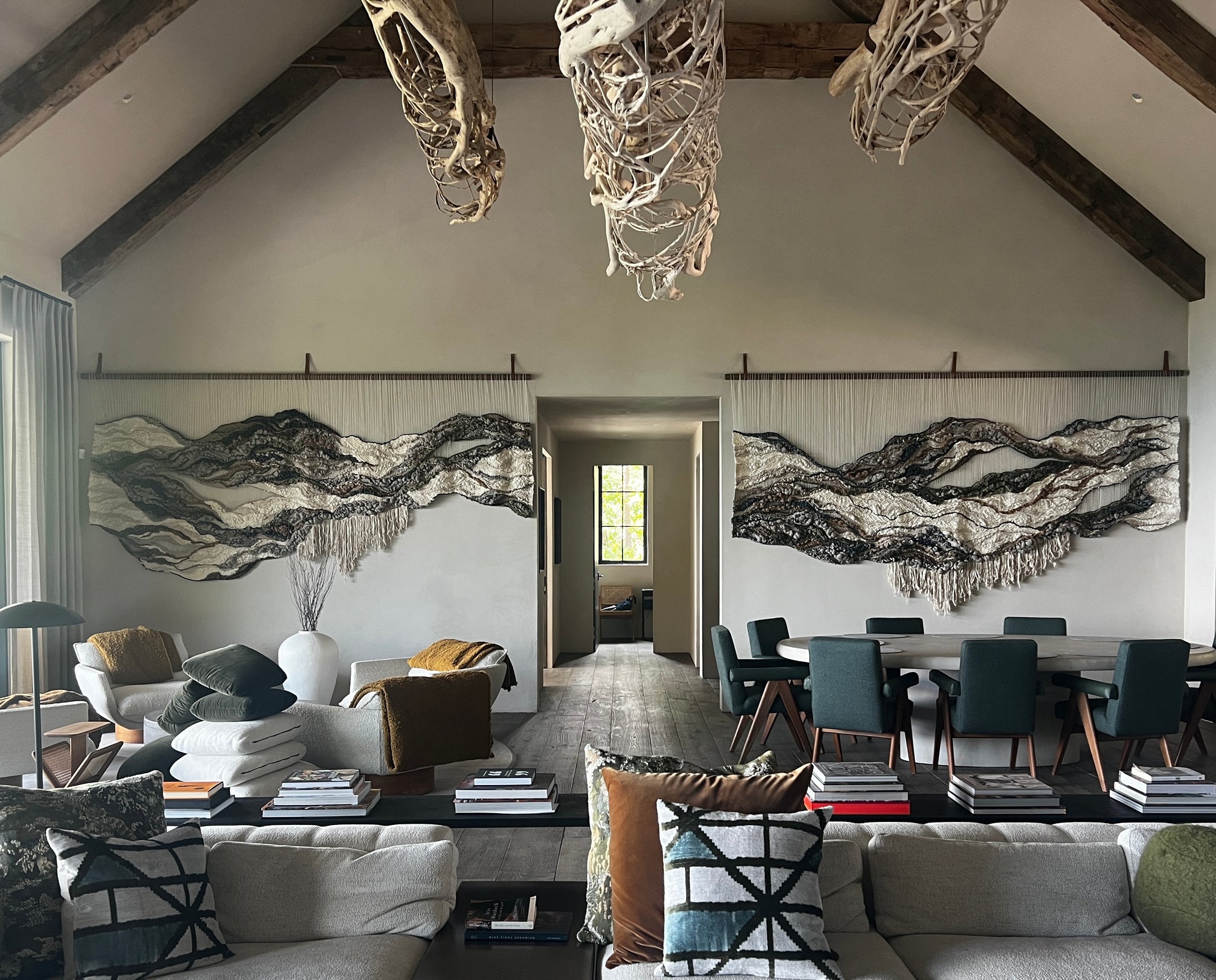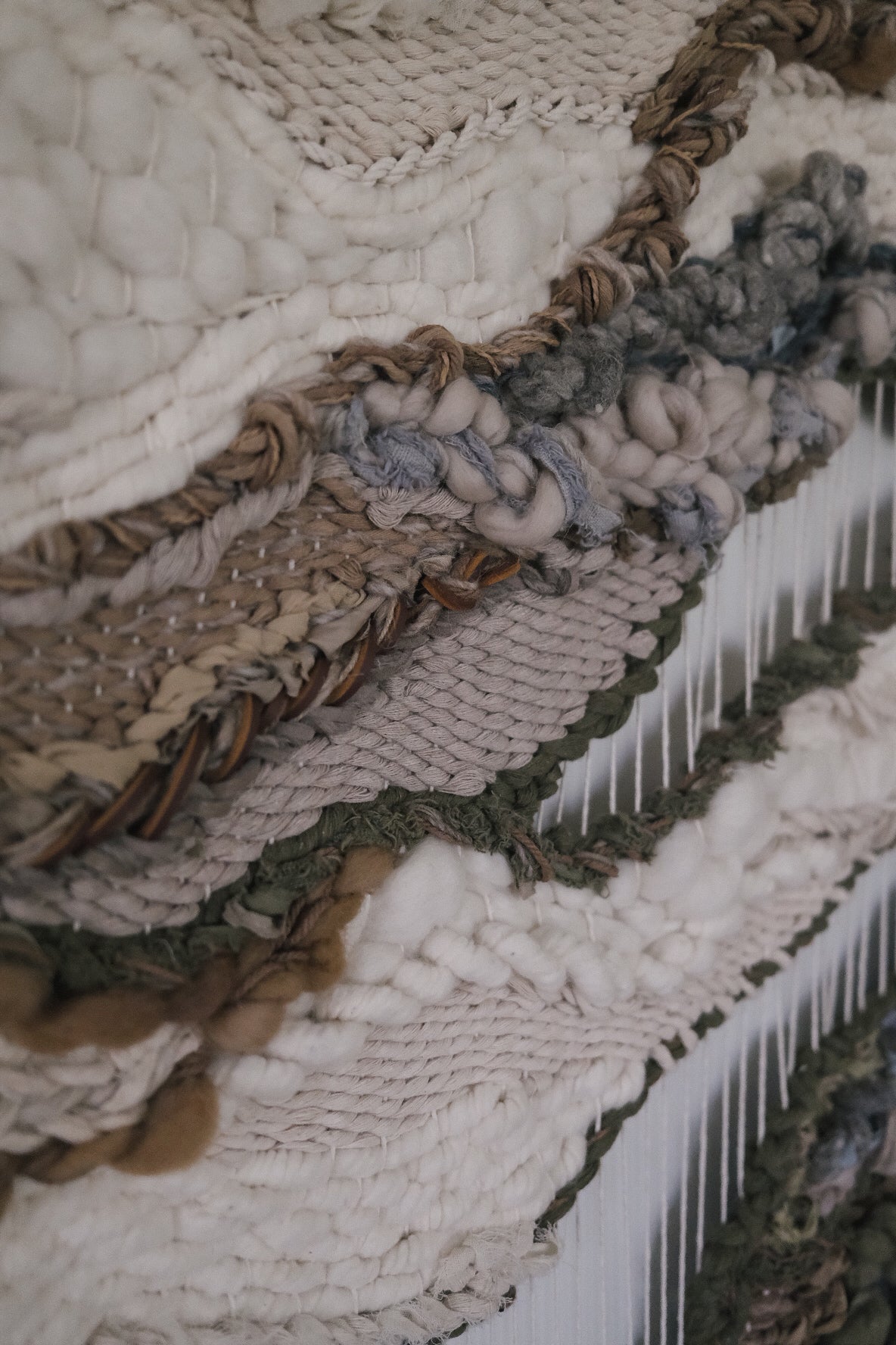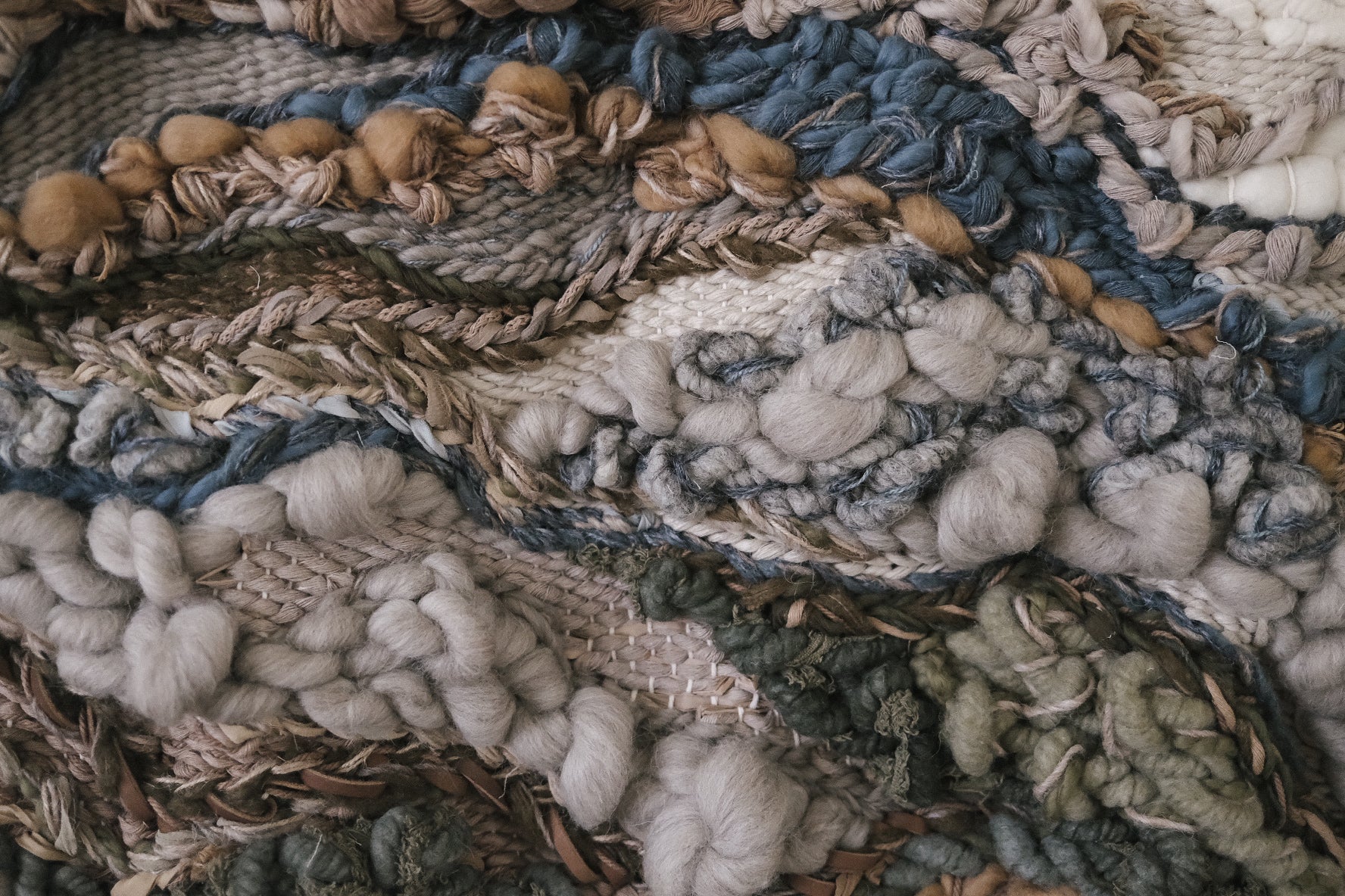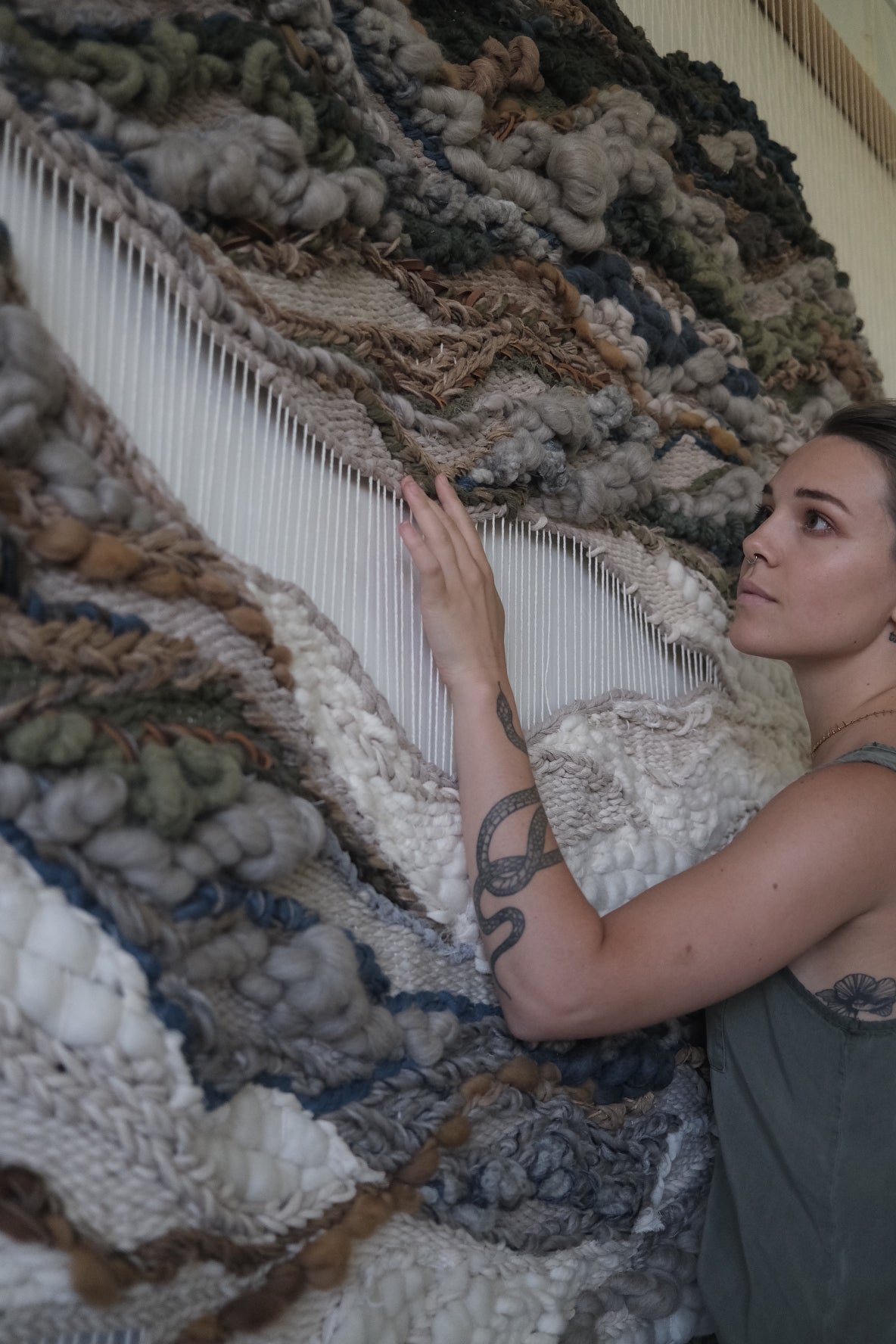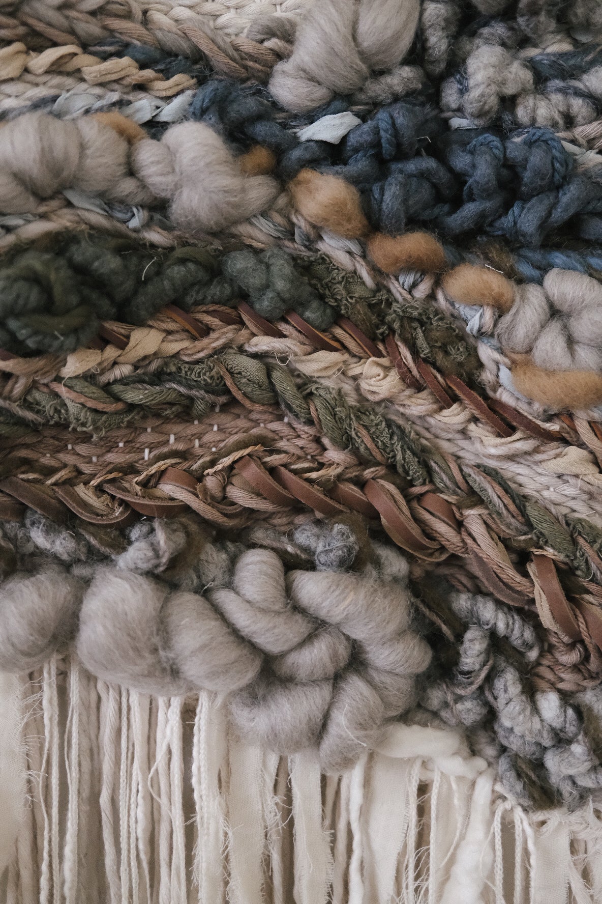 Please handle with care. Rebecca's work is designed to be a decorative wall hanging only, not to be used as rugs or regularly handled. Avoid moisture except to gently steam the fringe if necessary shortly after installation. Use clean hands to comb through fringe or straighten strings at the top, careful to avoid snagging fibers. No maintenance cleaning is necessary besides gently dusting with a feather dusty as needed.