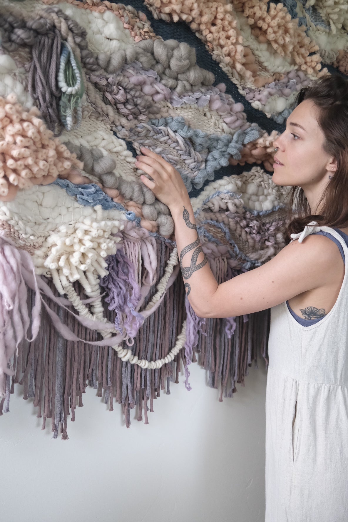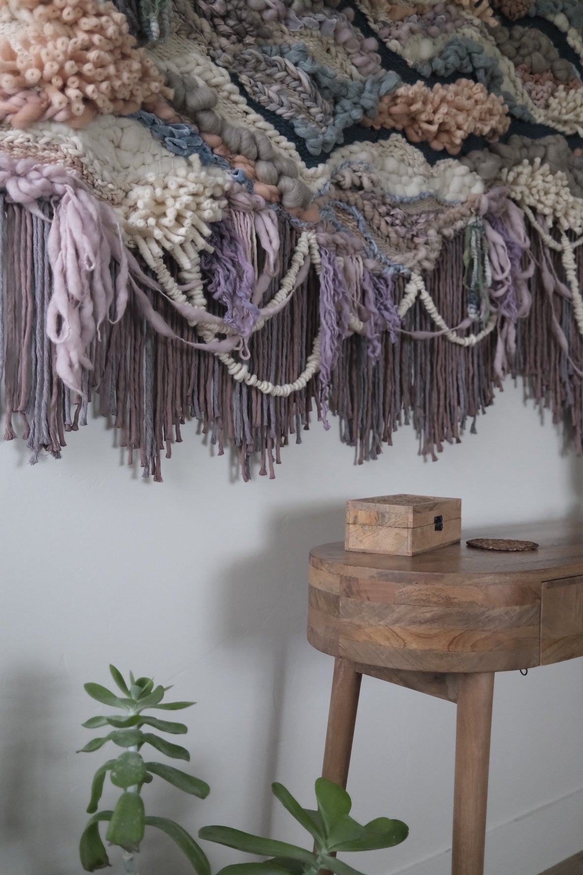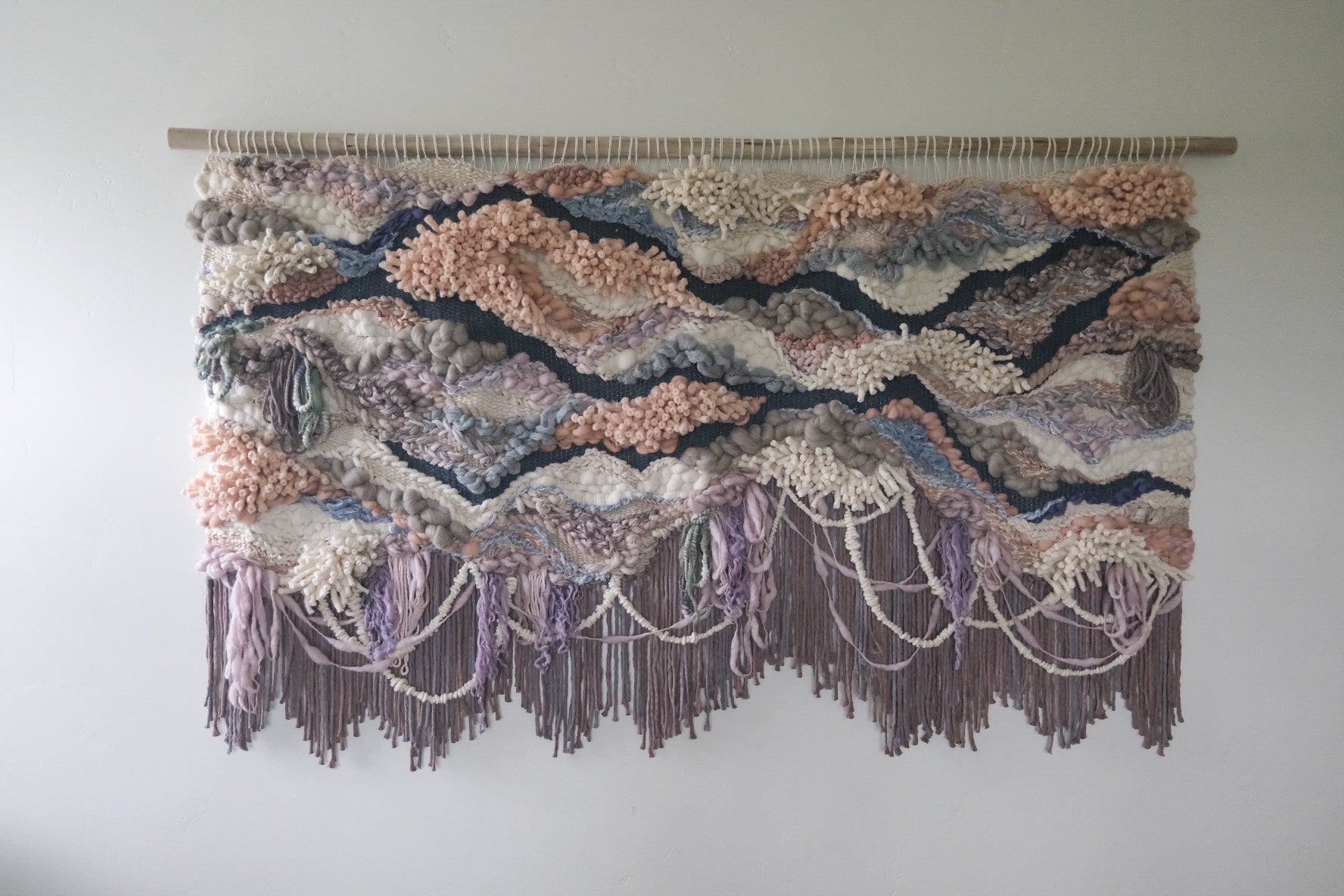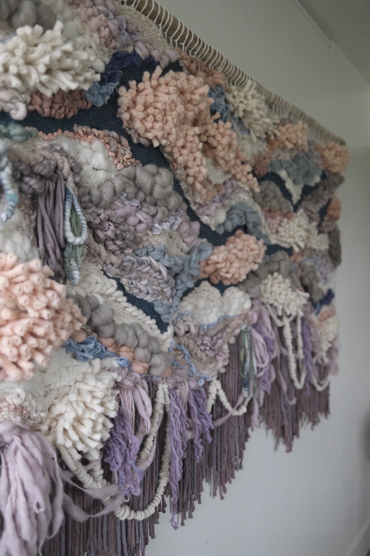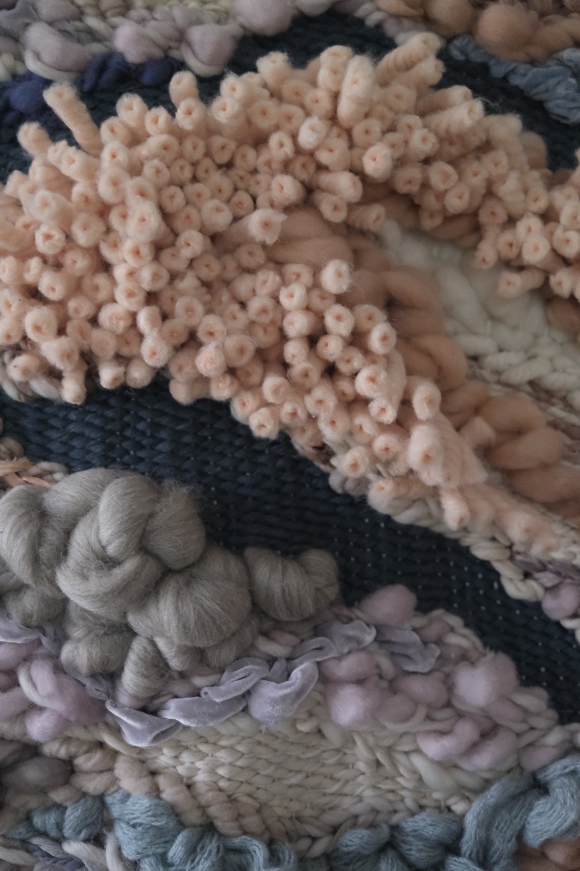 This custom woven wall hanging was inspired by coral reefs and incorporates a wide variety of muted pastels in hand-spun and recycled fibers including wool, silk, and linen.