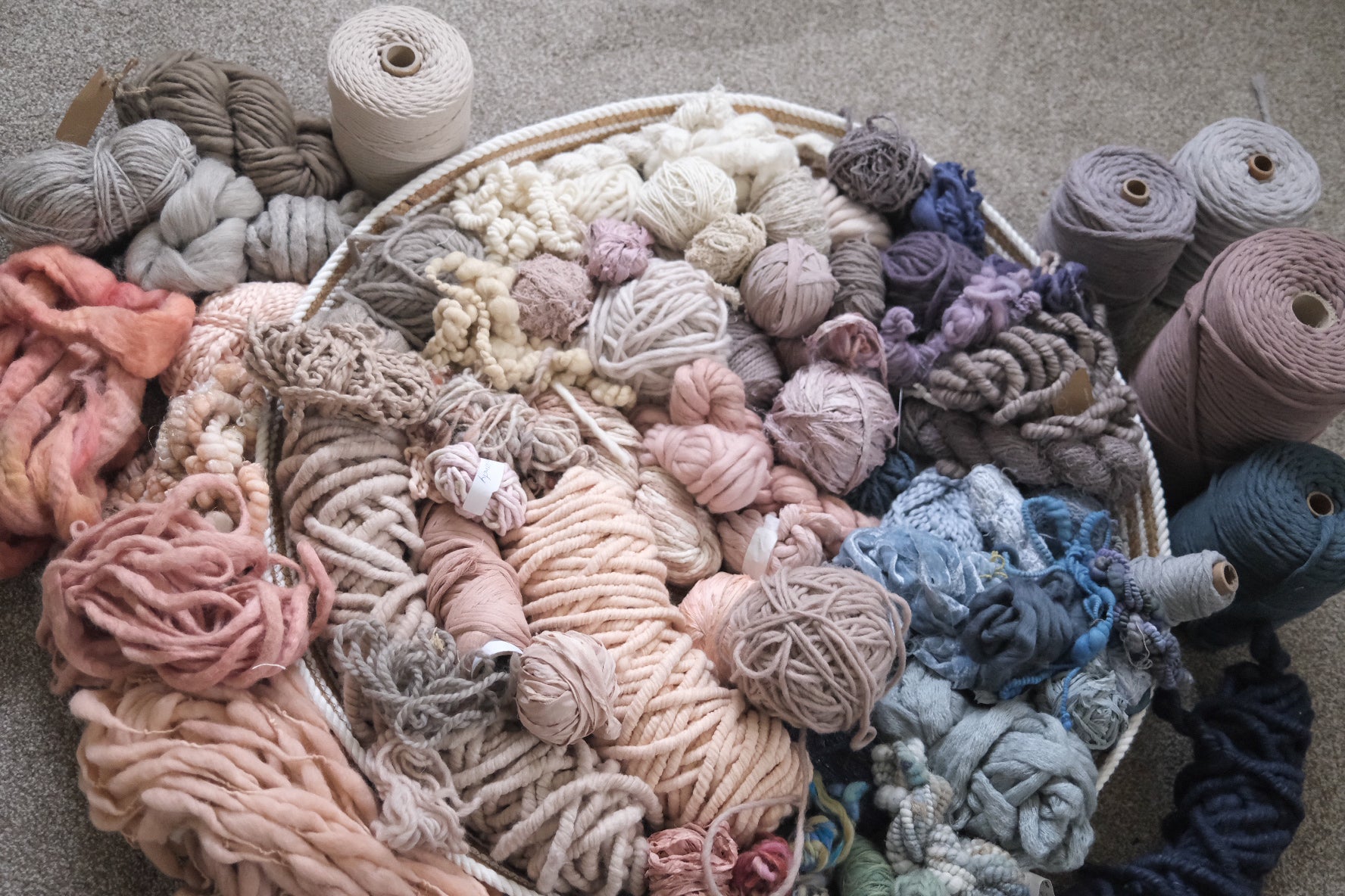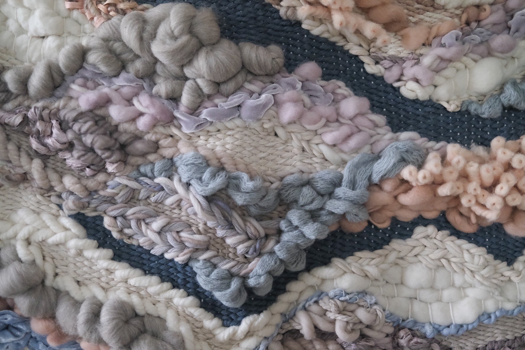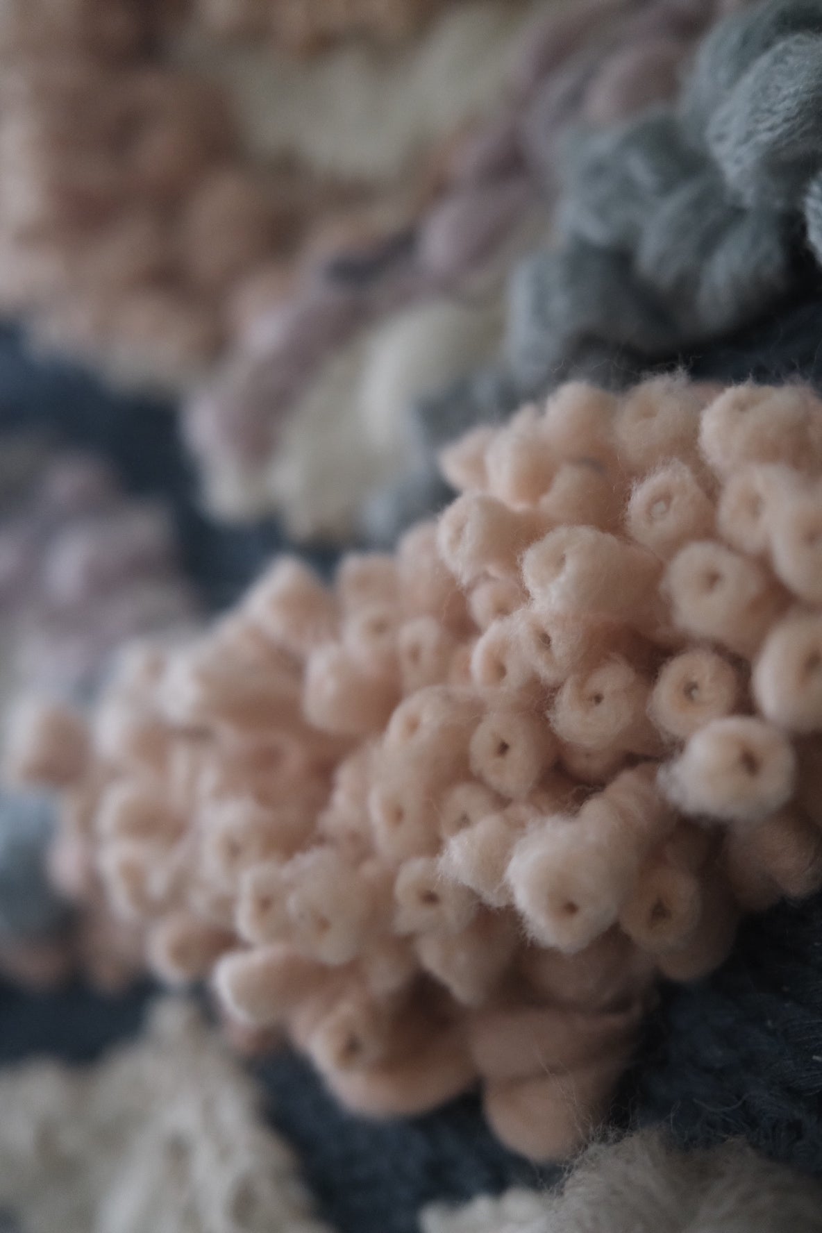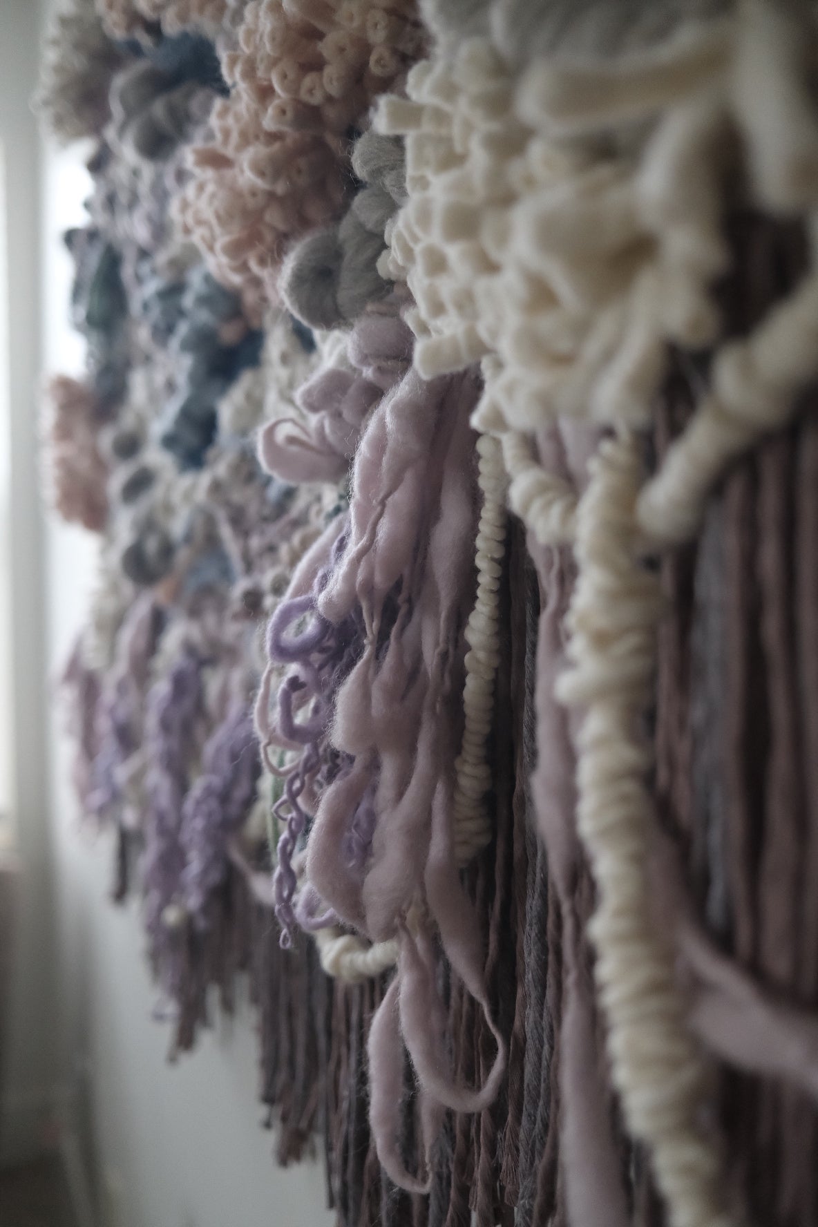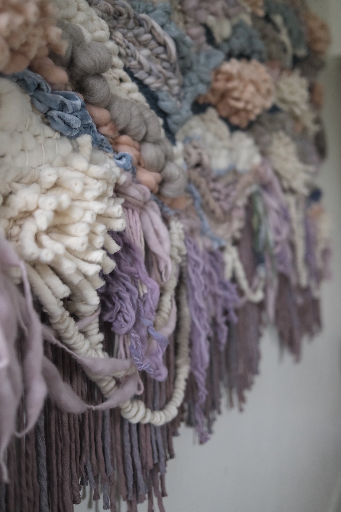This custom woven wall hanging was inspired by coral reefs and incorporates a wide variety of muted pastels in hand-spun and recycled fibers including wool, silk, and linen.
