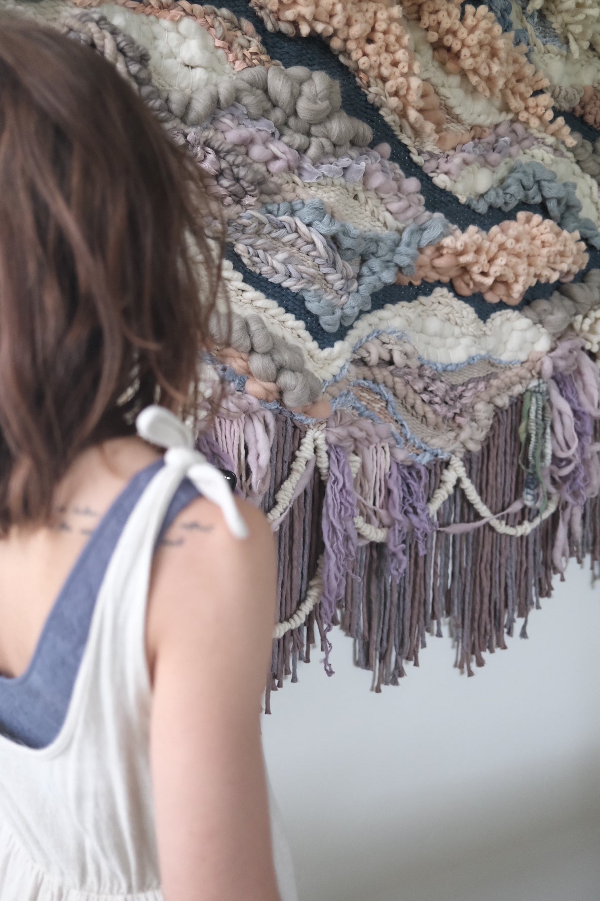 Please handle with care. Rebecca's work is designed to be a decorative wall hanging only, not to be used as rugs or regularly handled. Avoid moisture except to gently steam the fringe if necessary shortly after installation. Use clean hands to comb through fringe or straighten strings at the top, careful to avoid snagging fibers. No maintenance cleaning is necessary besides gently dusting with a feather dusty as needed.
