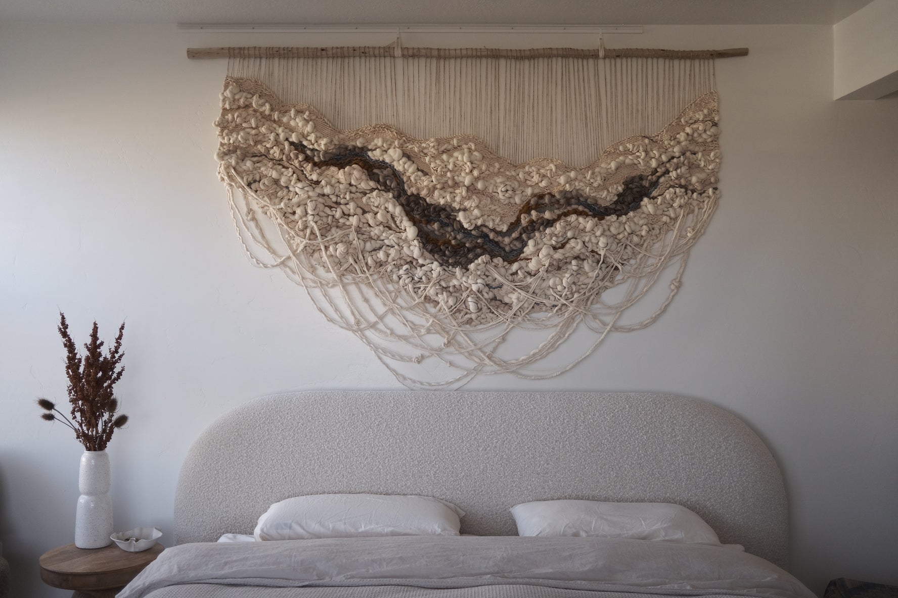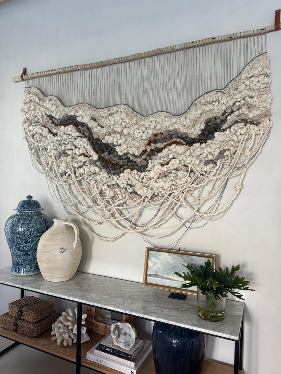 This custom woven wall hanging measures approximately 6'7" wide and 4'3" long, created with a rich blend of natural fibers, including wool, cotton, raffia, and recycled linen. The combination of textures and materials brings depth and warmth to the piece, making it a striking addition to any space.
