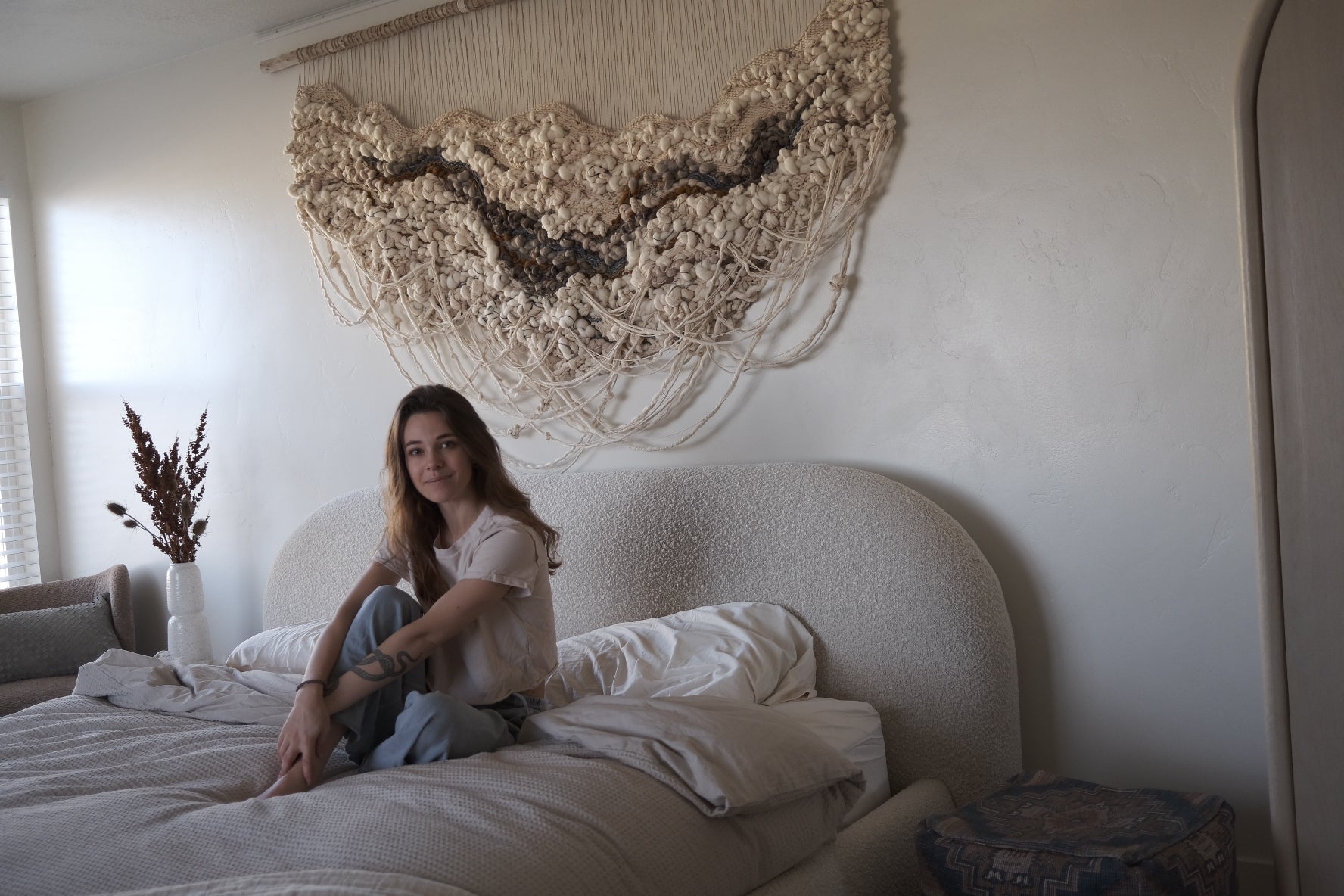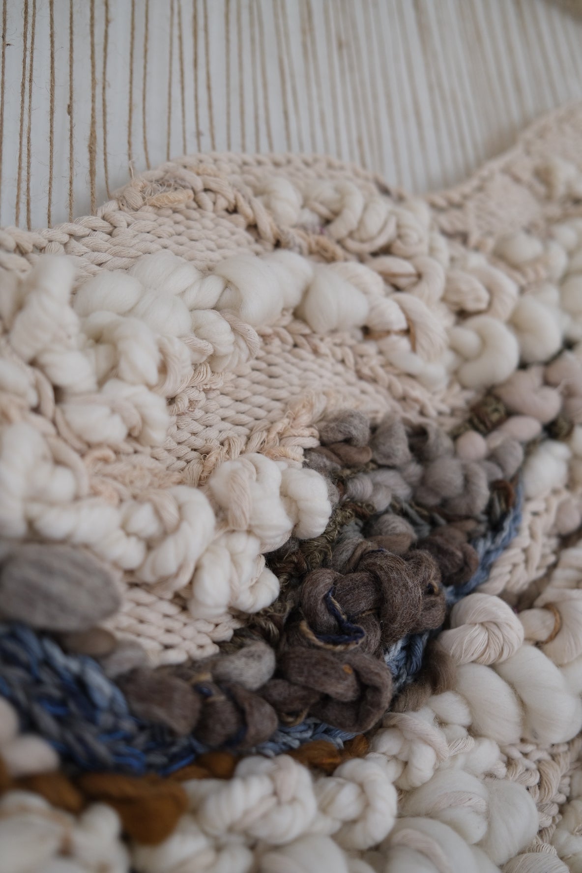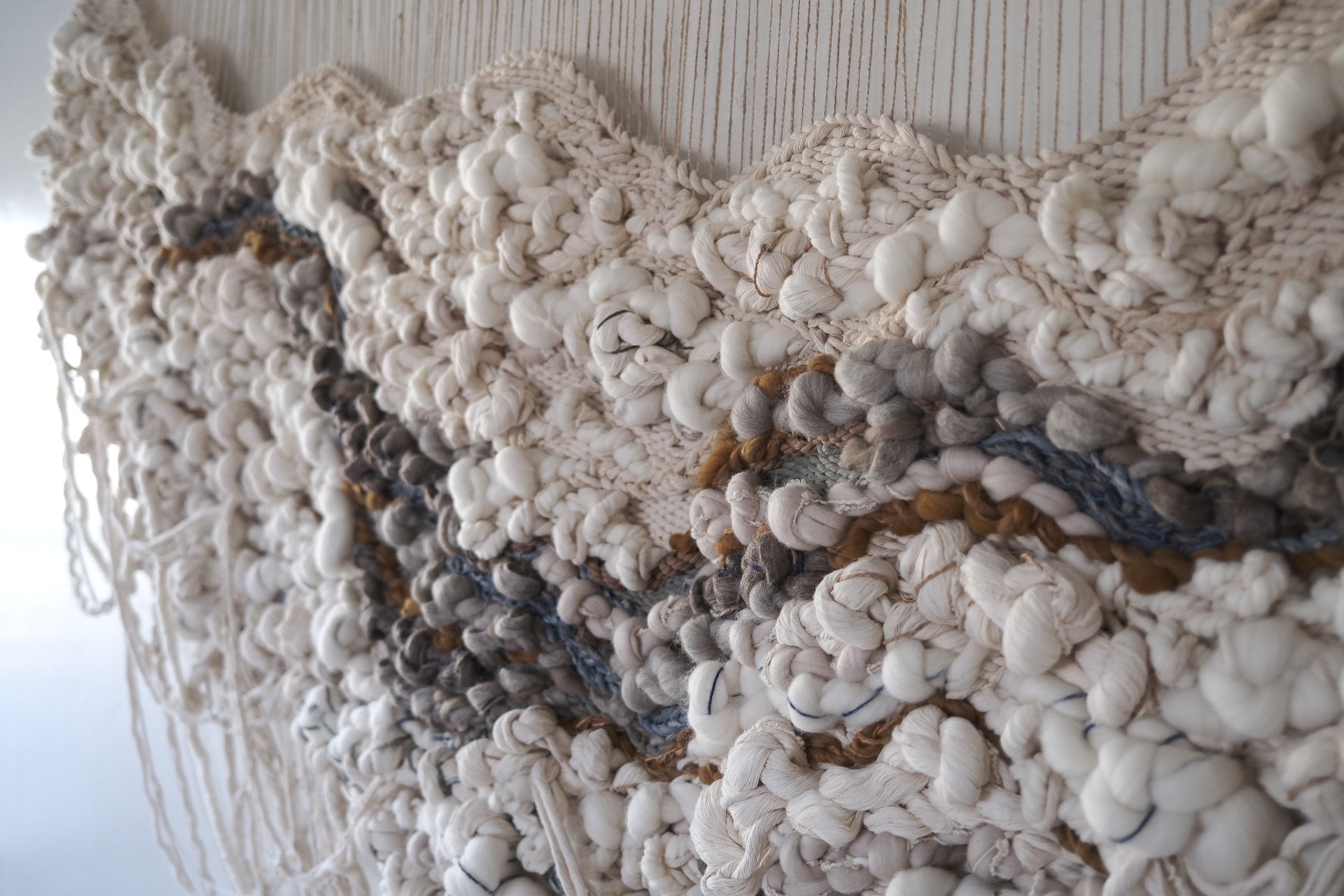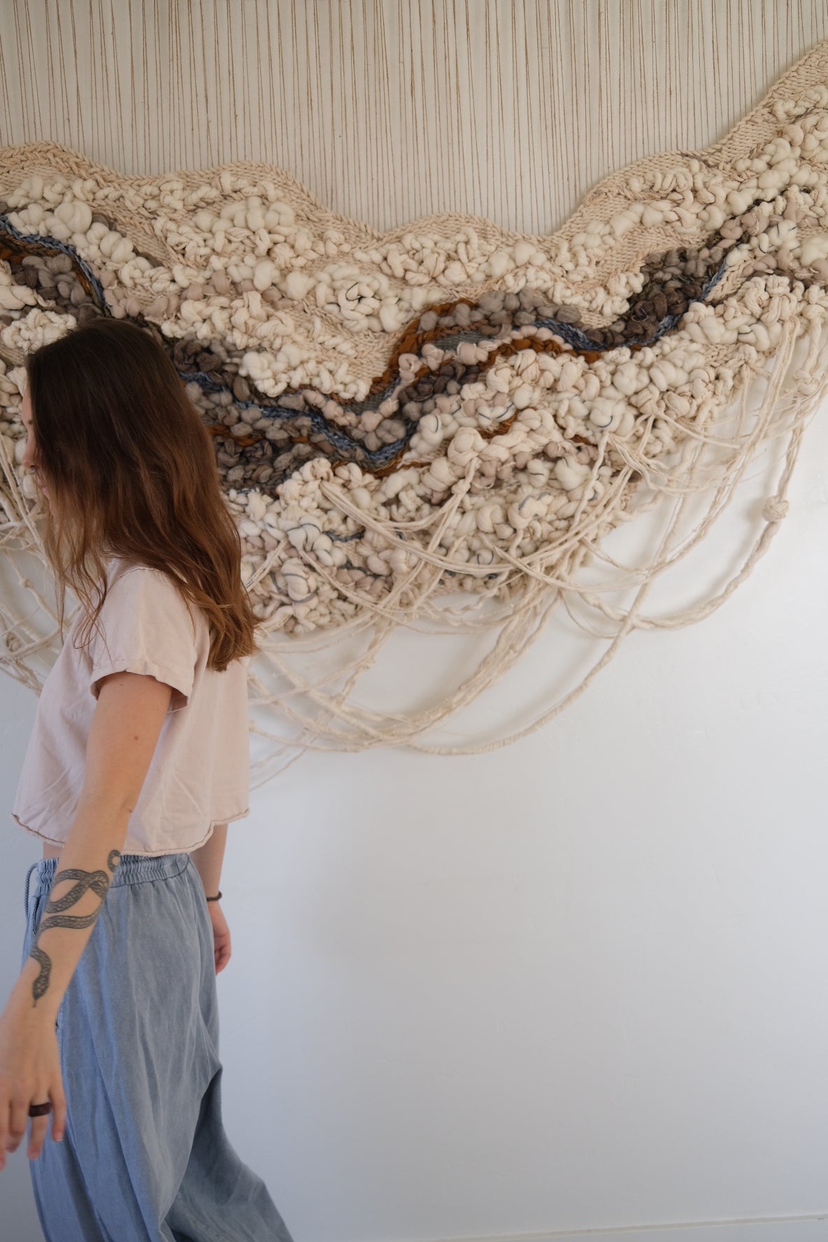 Please handle with care. Rebecca's work is designed to be a decorative wall hanging only, not to be used as rugs or regularly handled. Avoid moisture except to gently steam the fringe if necessary shortly after installation. Use clean hands to comb through fringe or straighten strings at the top, careful to avoid snagging fibers. No maintenance cleaning is necessary besides gently dusting with a feather dusty as needed.