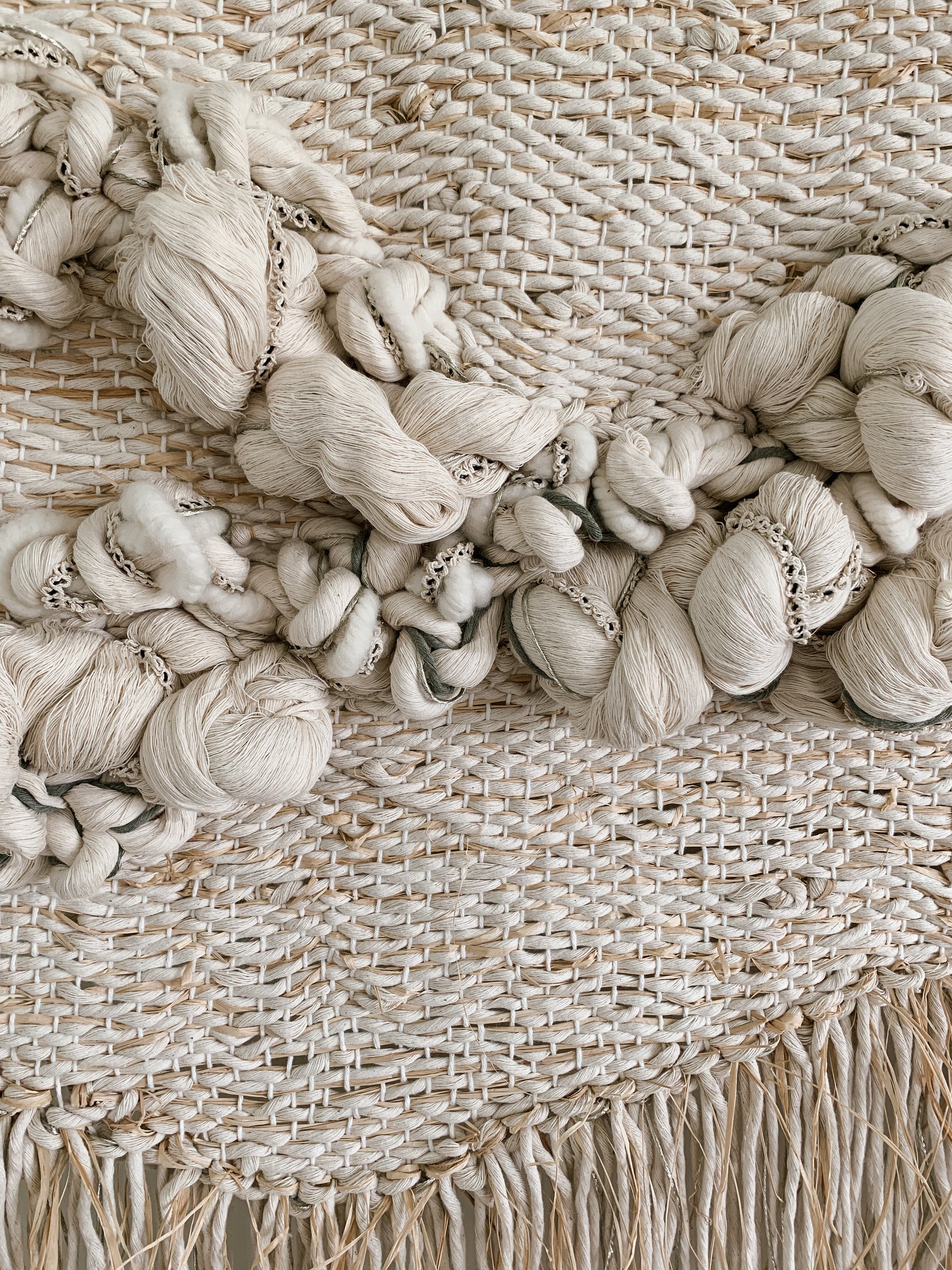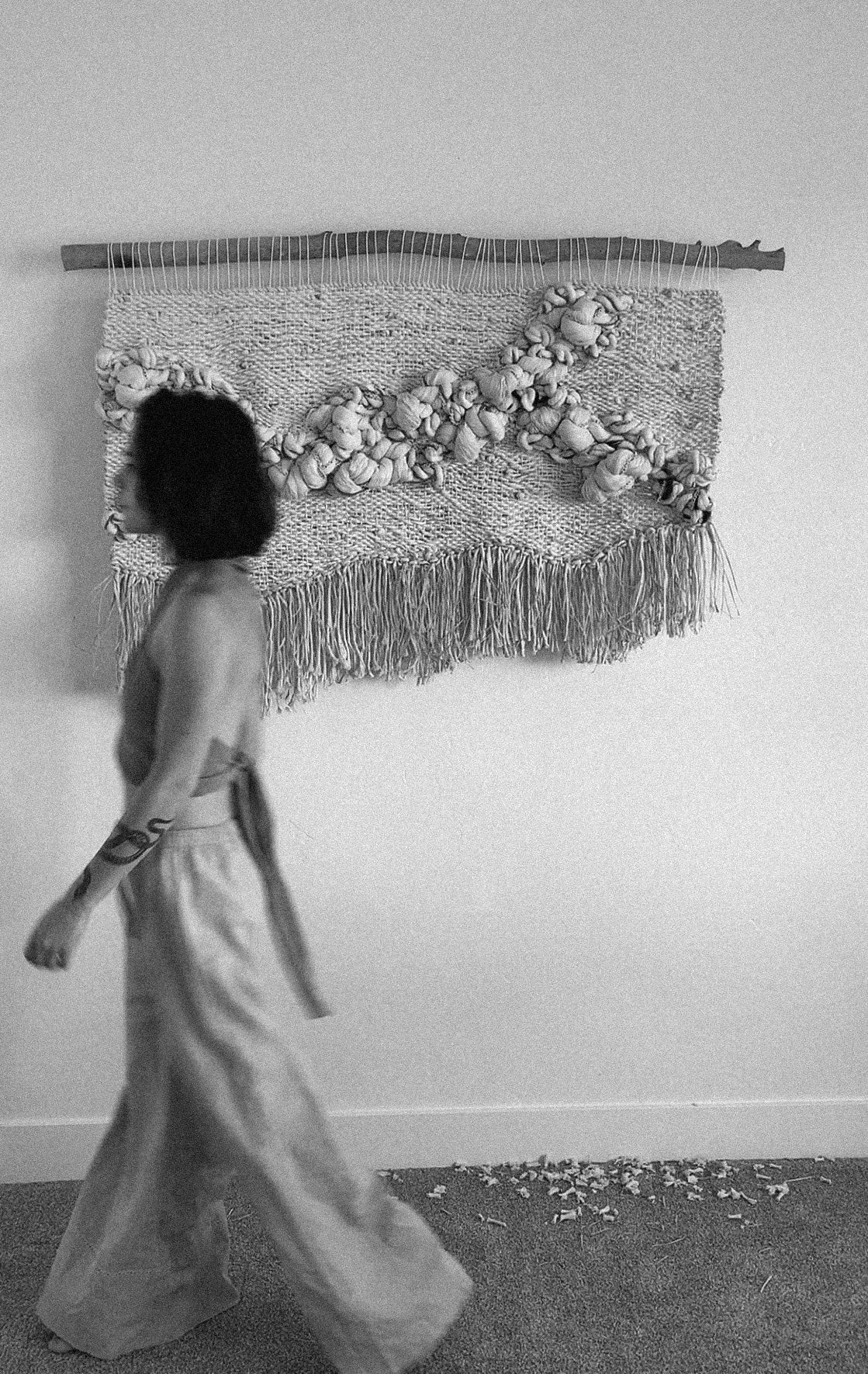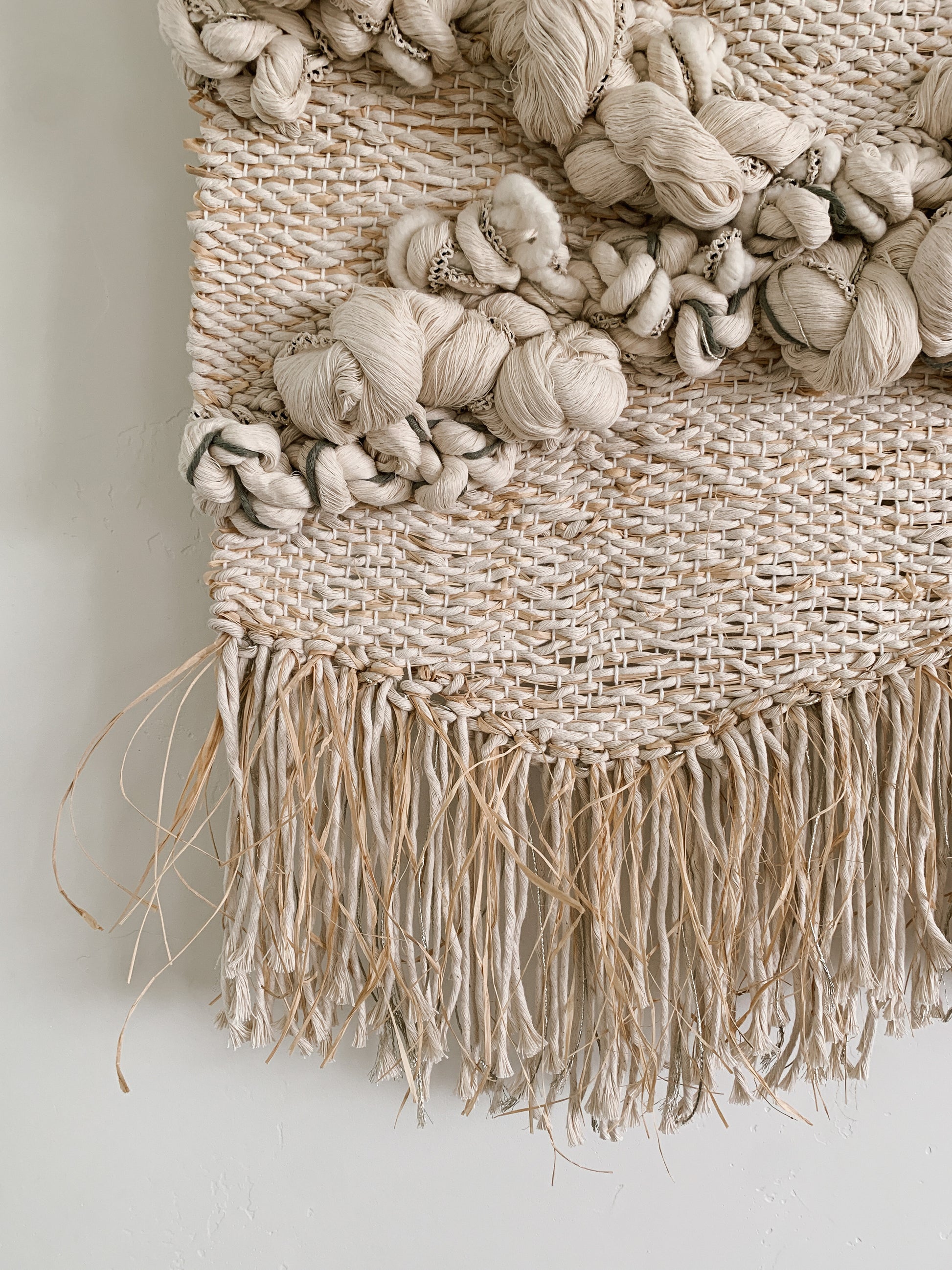 Please handle with care. Rebecca's work is designed to be a decorative wall hanging only, not to be used as rugs or regularly handled. Avoid moisture except to gently steam the fringe if necessary shortly after installation. Use clean hands to comb through fringe or straighten strings at the top, careful to avoid snagging fibers. No maintenance cleaning is necessary besides gently dusting with a feather dusty as needed.