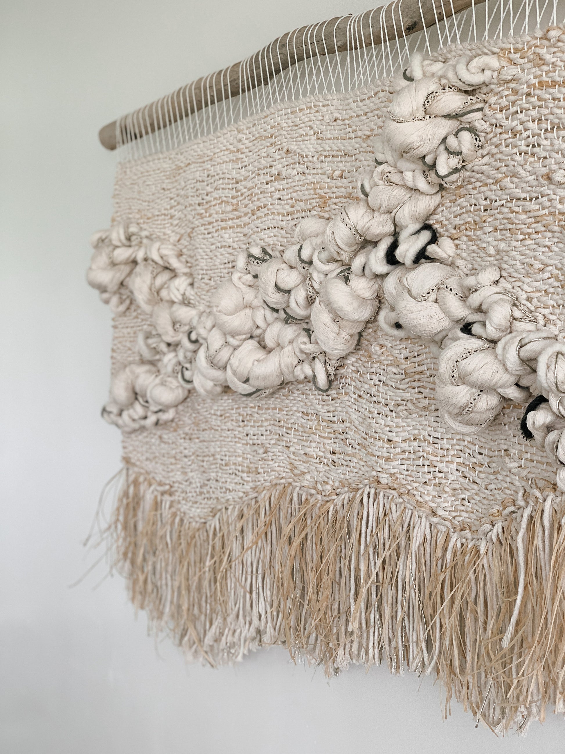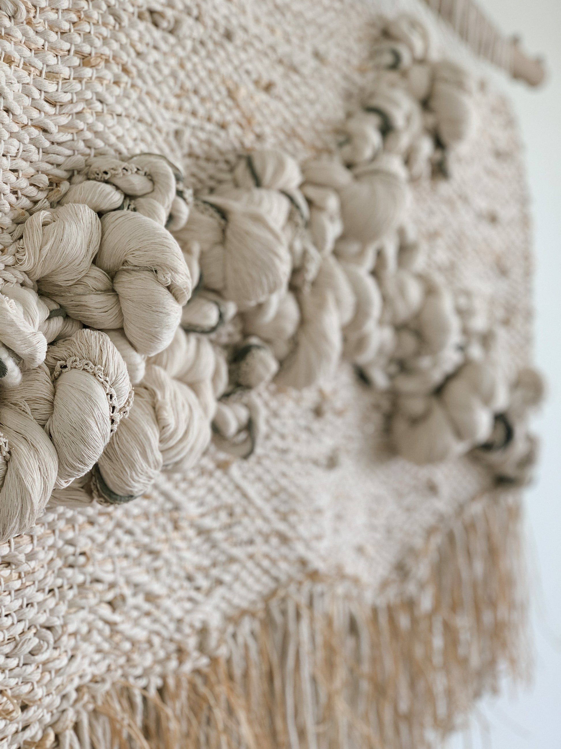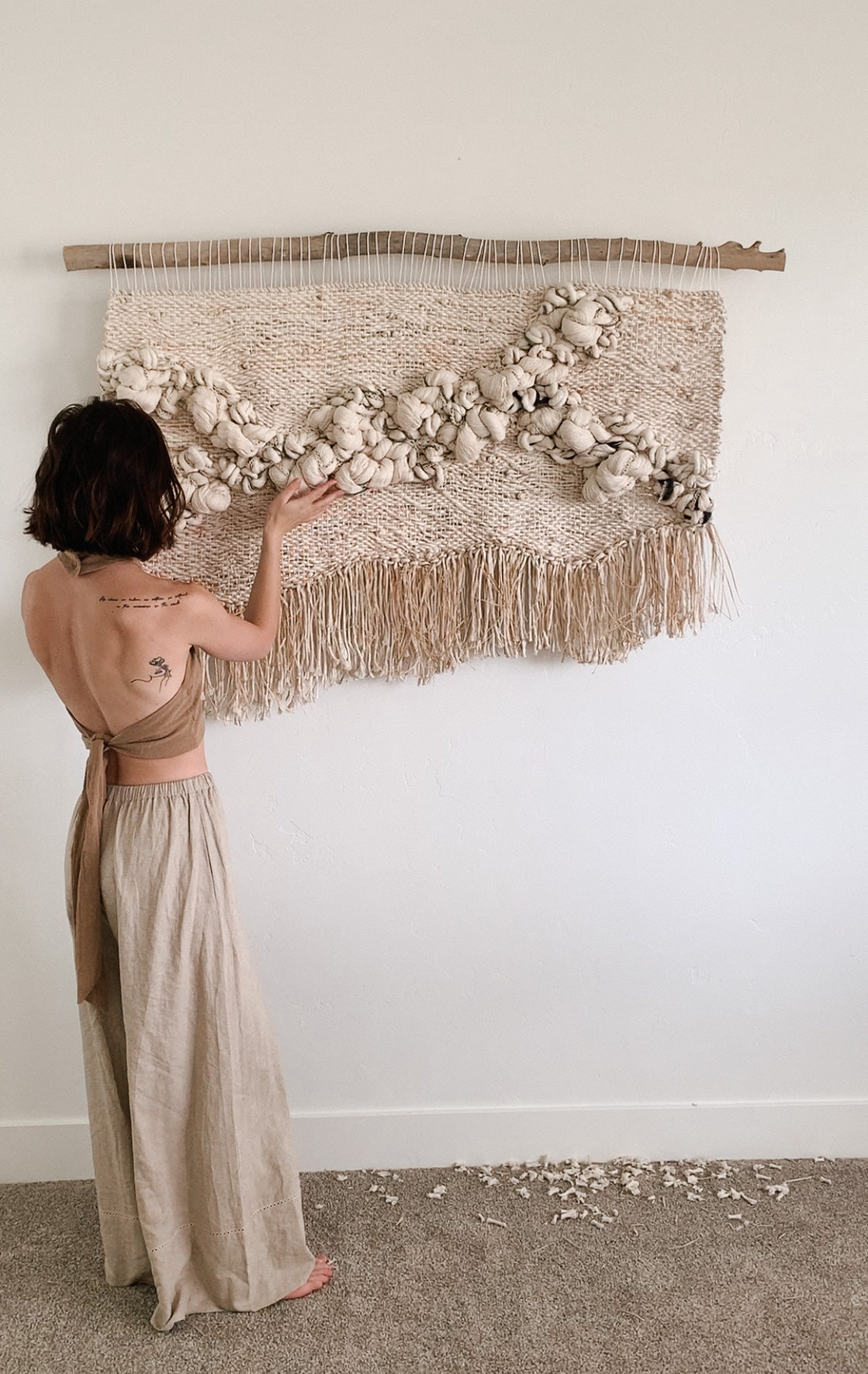 Please handle with care. Rebecca's work is designed to be a decorative wall hanging only, not to be used as rugs or regularly handled. Avoid moisture except to gently steam the fringe if necessary shortly after installation. Use clean hands to comb through fringe or straighten strings at the top, careful to avoid snagging fibers. No maintenance cleaning is necessary besides gently dusting with a feather dusty as needed.