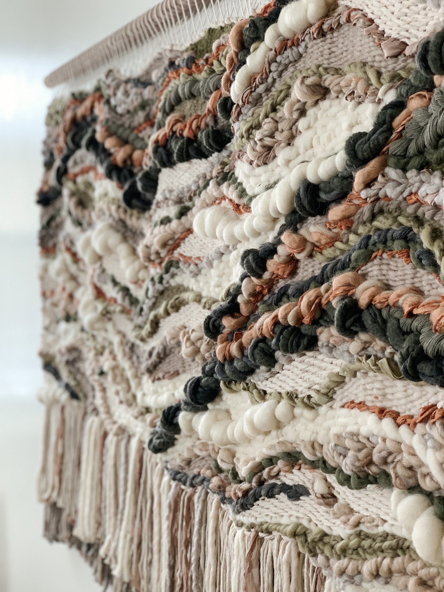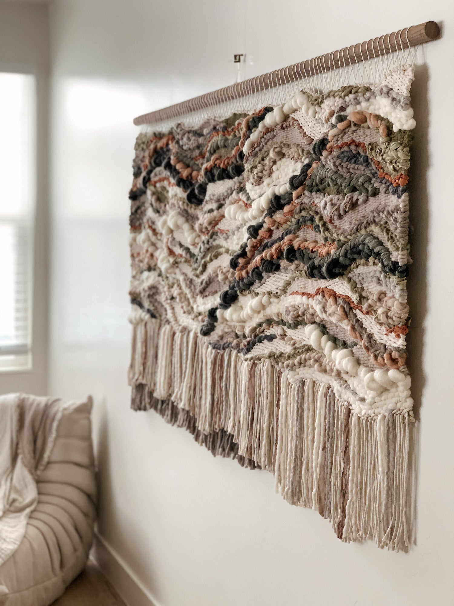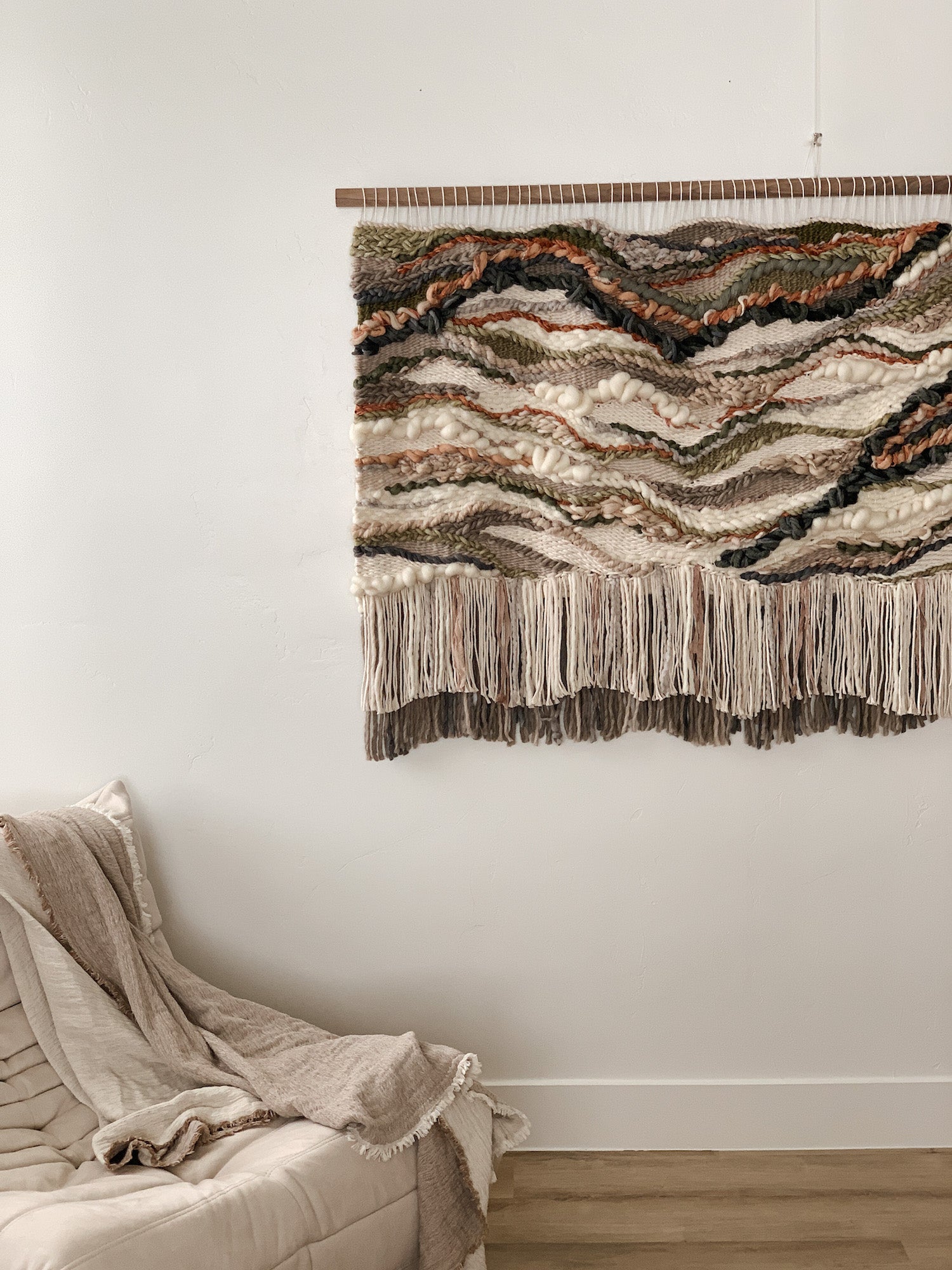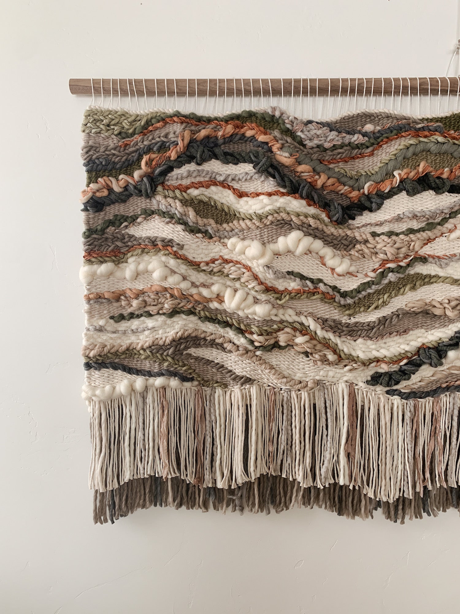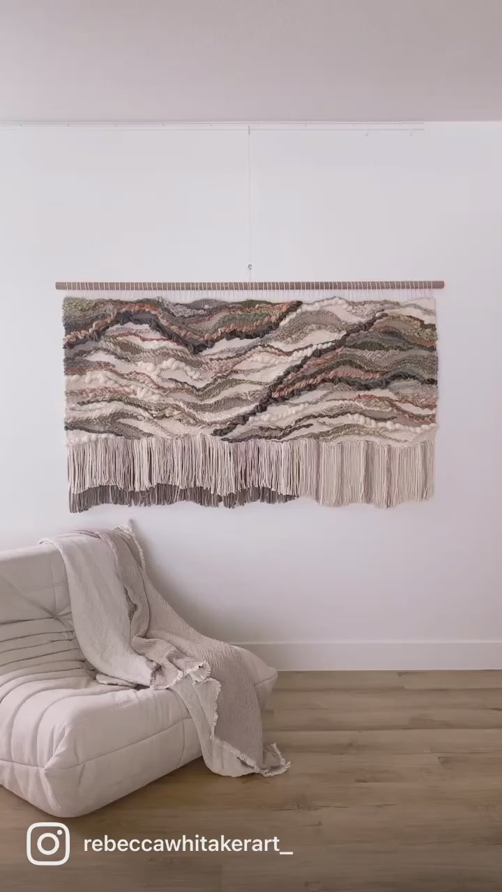 Please handle with care. Rebecca's work is designed to be a decorative wall hanging only, not to be used as rugs or regularly handled. Avoid moisture except to gently steam the fringe if necessary shortly after installation. Use clean hands to comb through fringe or straighten strings at the top, careful to avoid snagging fibers. No maintenance cleaning is necessary besides gently dusting with a feather dusty as needed.