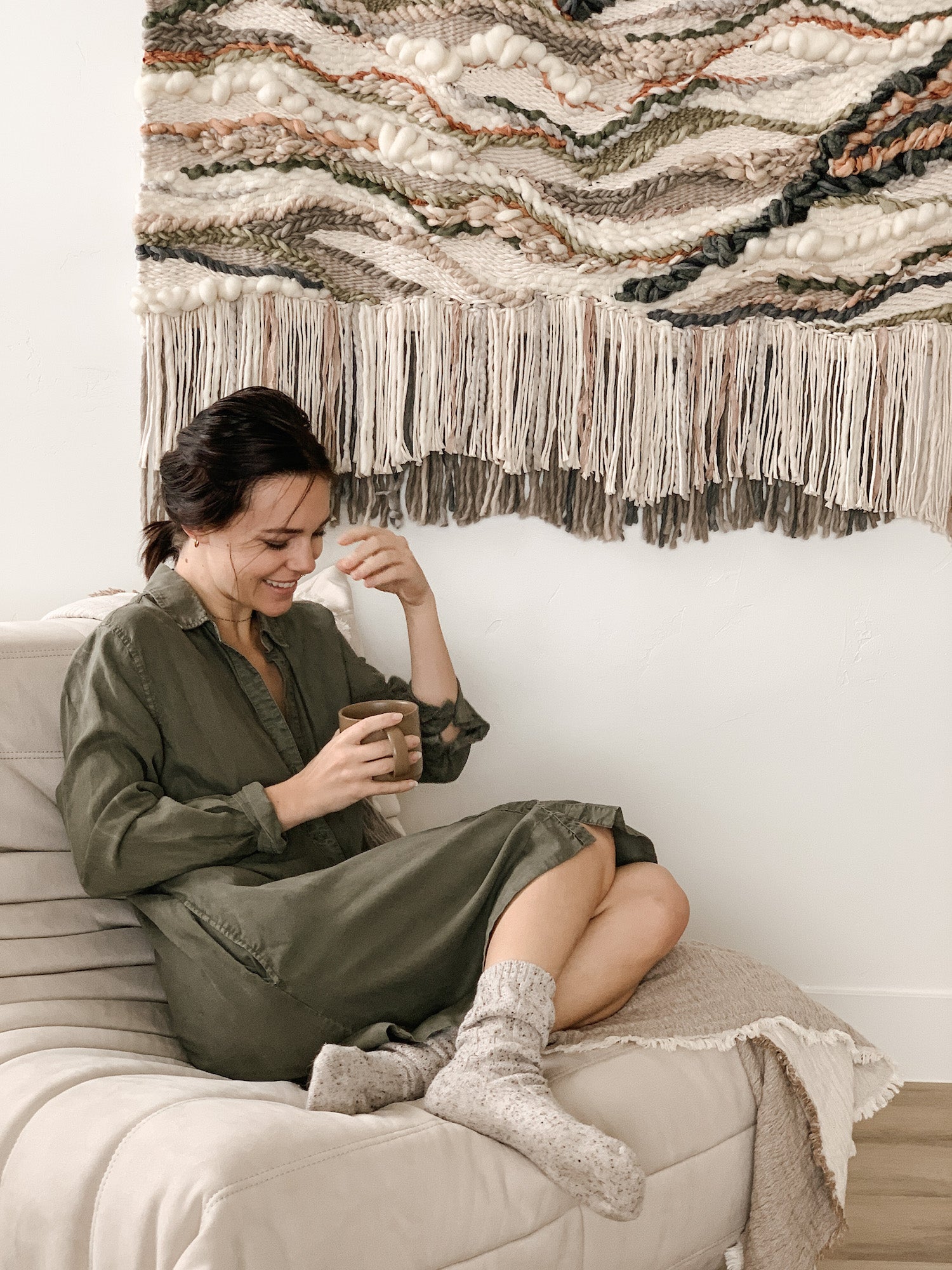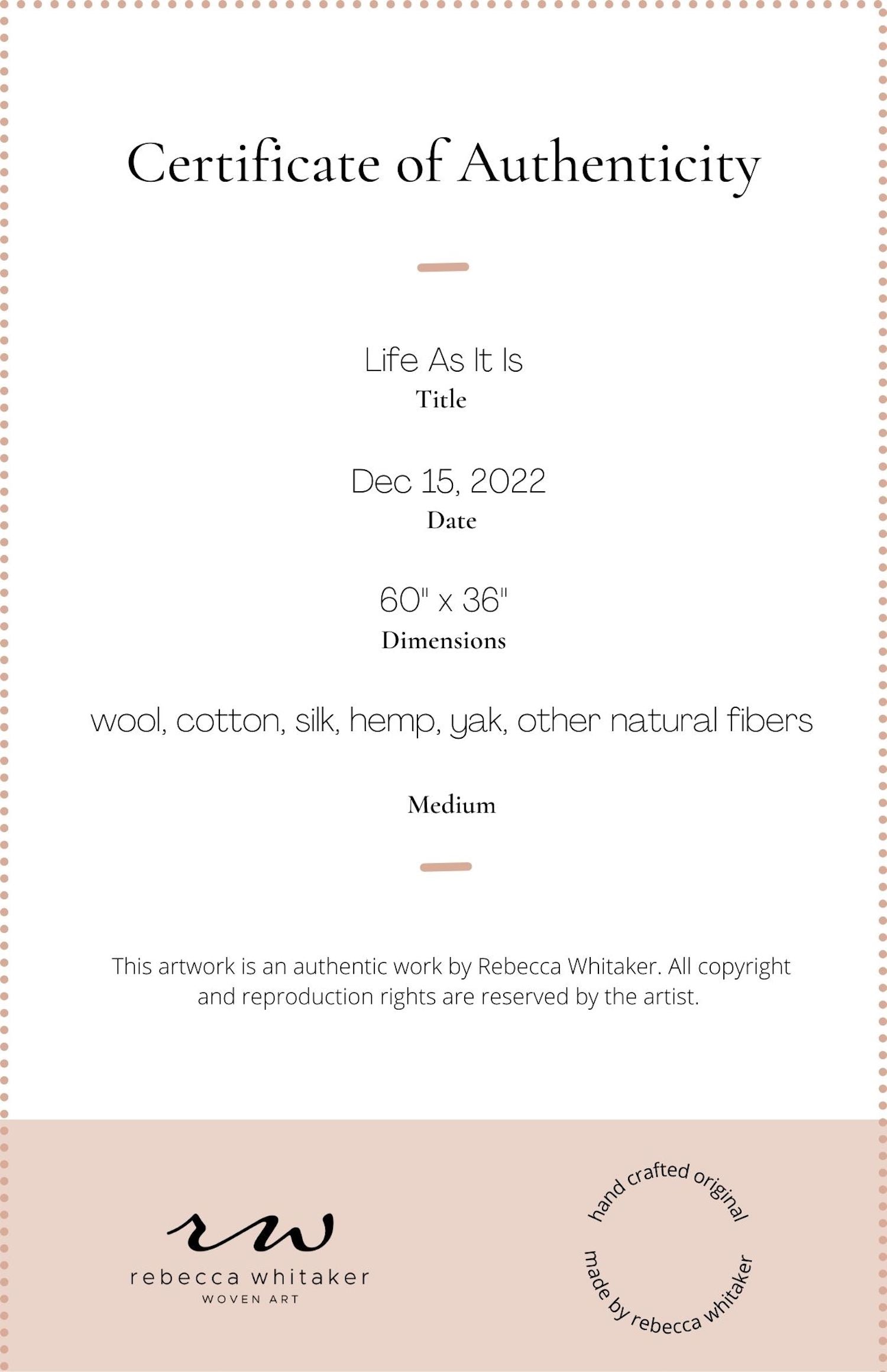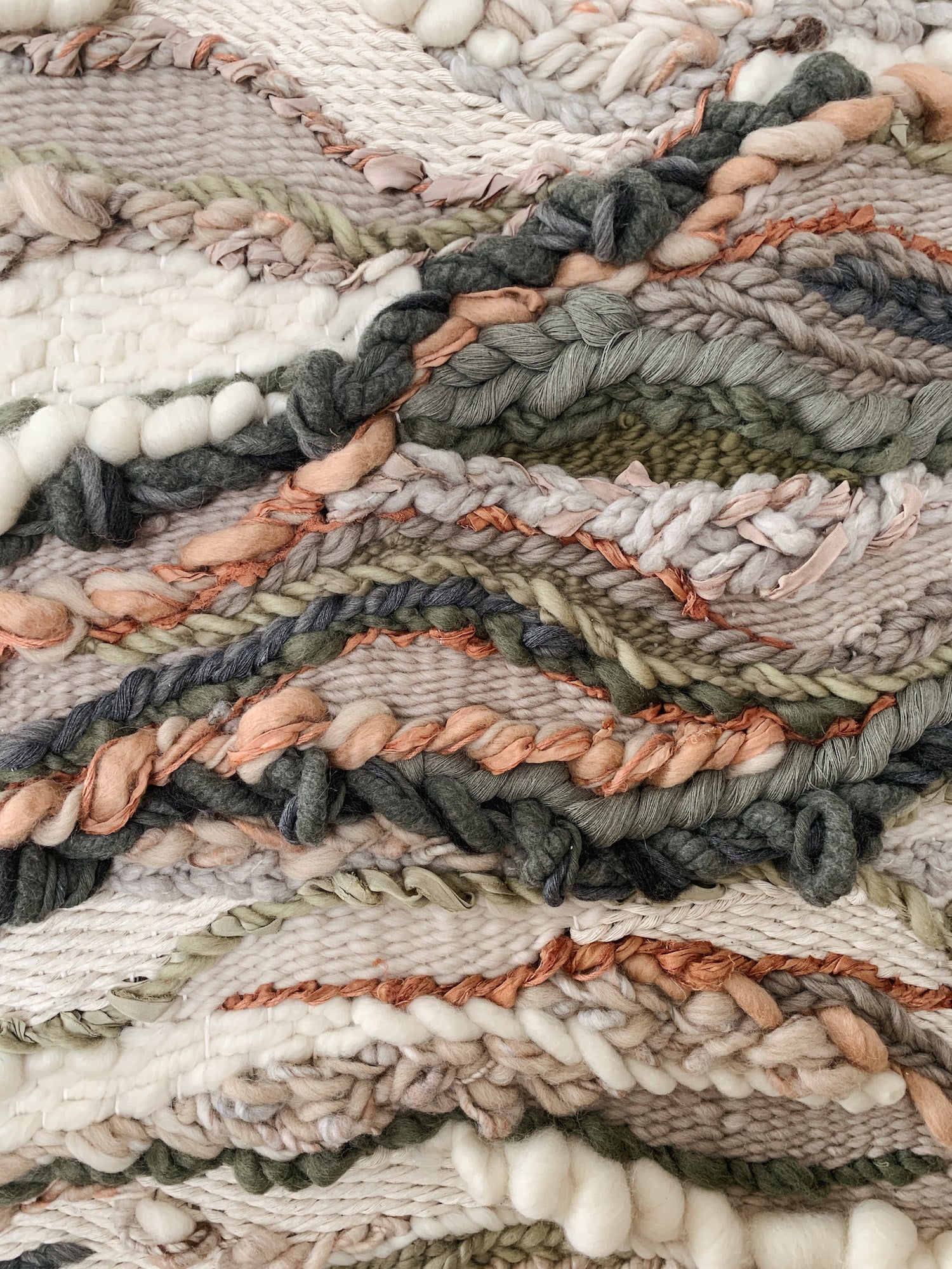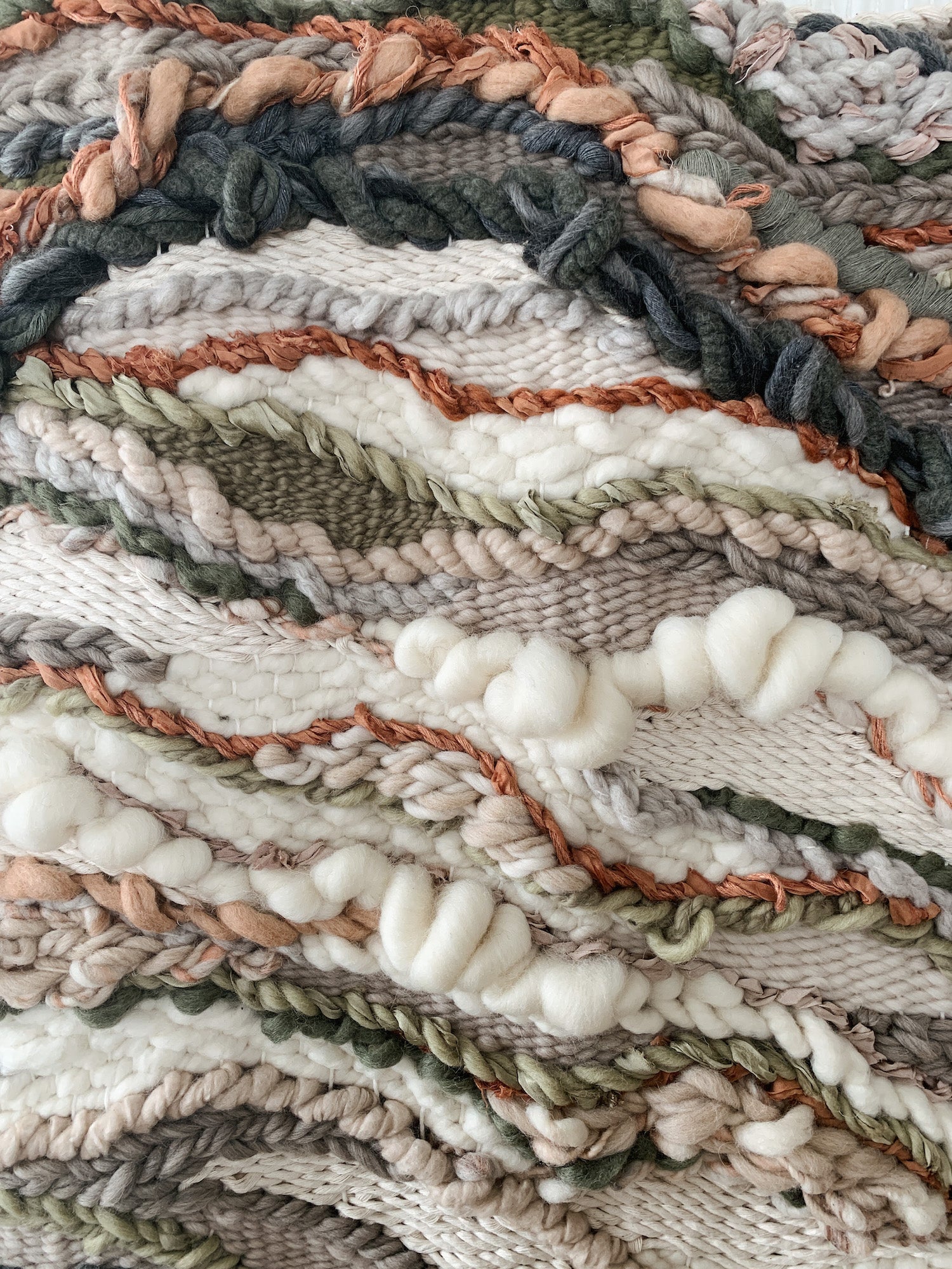 Please handle with care. Rebecca's work is designed to be a decorative wall hanging only, not to be used as rugs or regularly handled. Avoid moisture except to gently steam the fringe if necessary shortly after installation. Use clean hands to comb through fringe or straighten strings at the top, careful to avoid snagging fibers. No maintenance cleaning is necessary besides gently dusting with a feather dusty as needed.