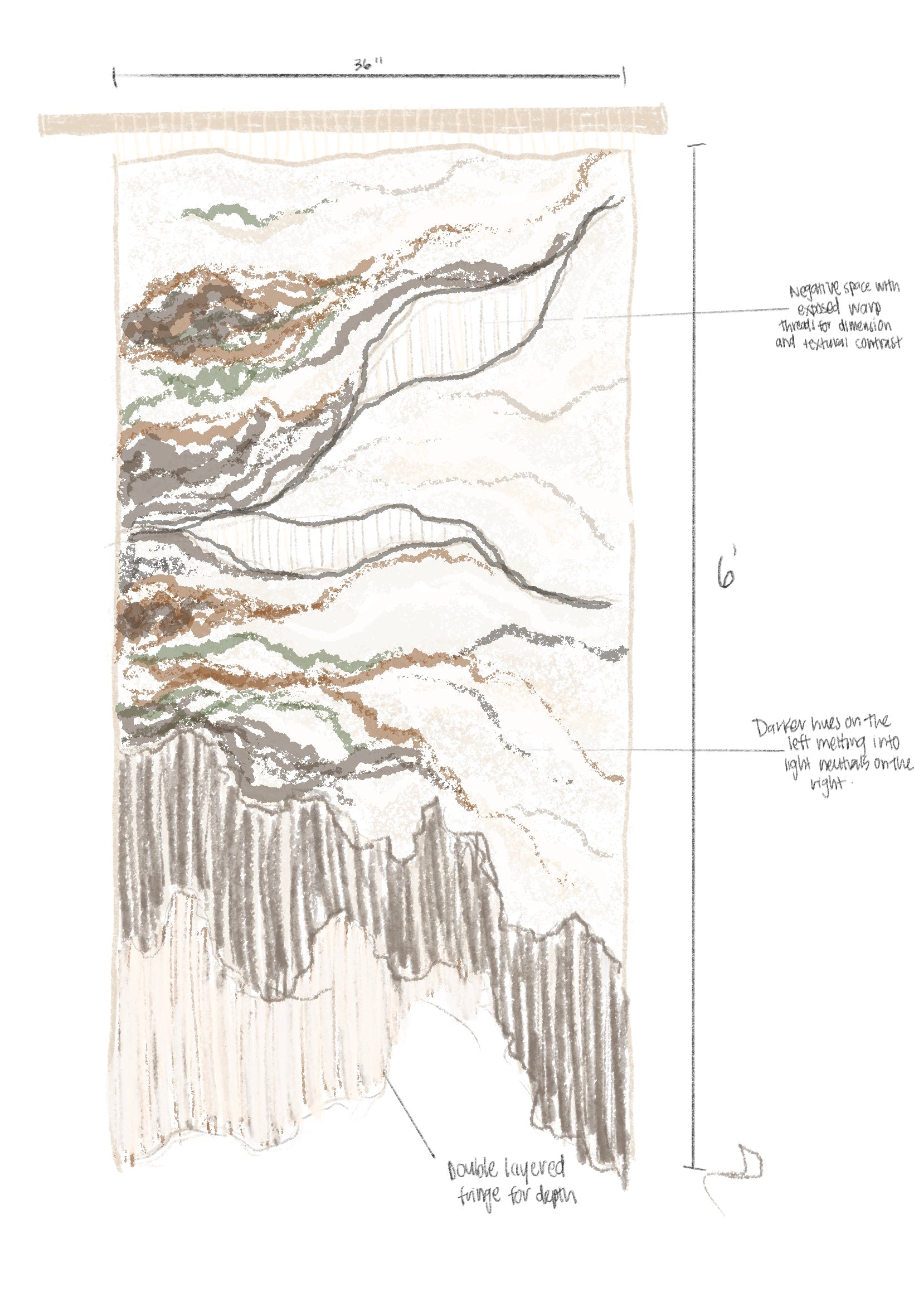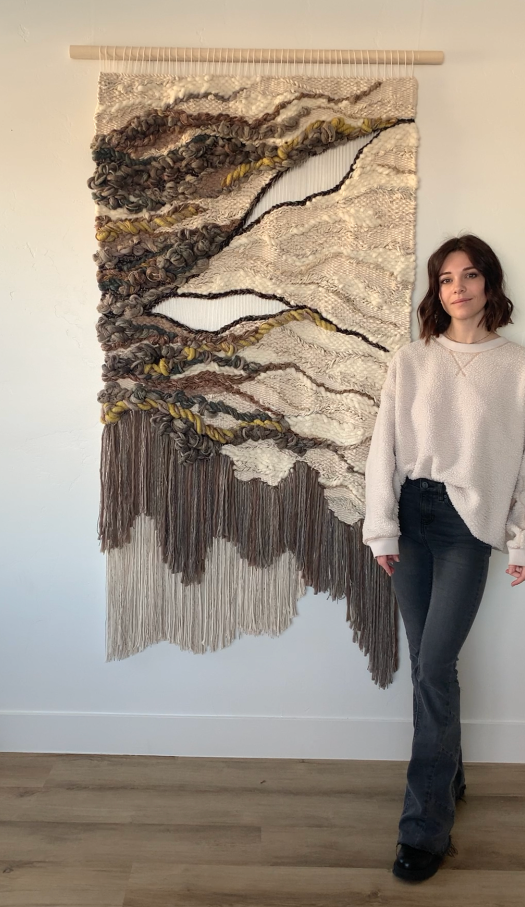 Please handle with care. Rebecca's work is designed to be a decorative wall hanging only, not to be used as rugs or regularly handled. Avoid moisture except to gently steam the fringe if necessary shortly after installation. Use clean hands to comb through fringe or straighten strings at the top, careful to avoid snagging fibers. No maintenance cleaning is necessary besides gently dusting with a feather dusty as needed.