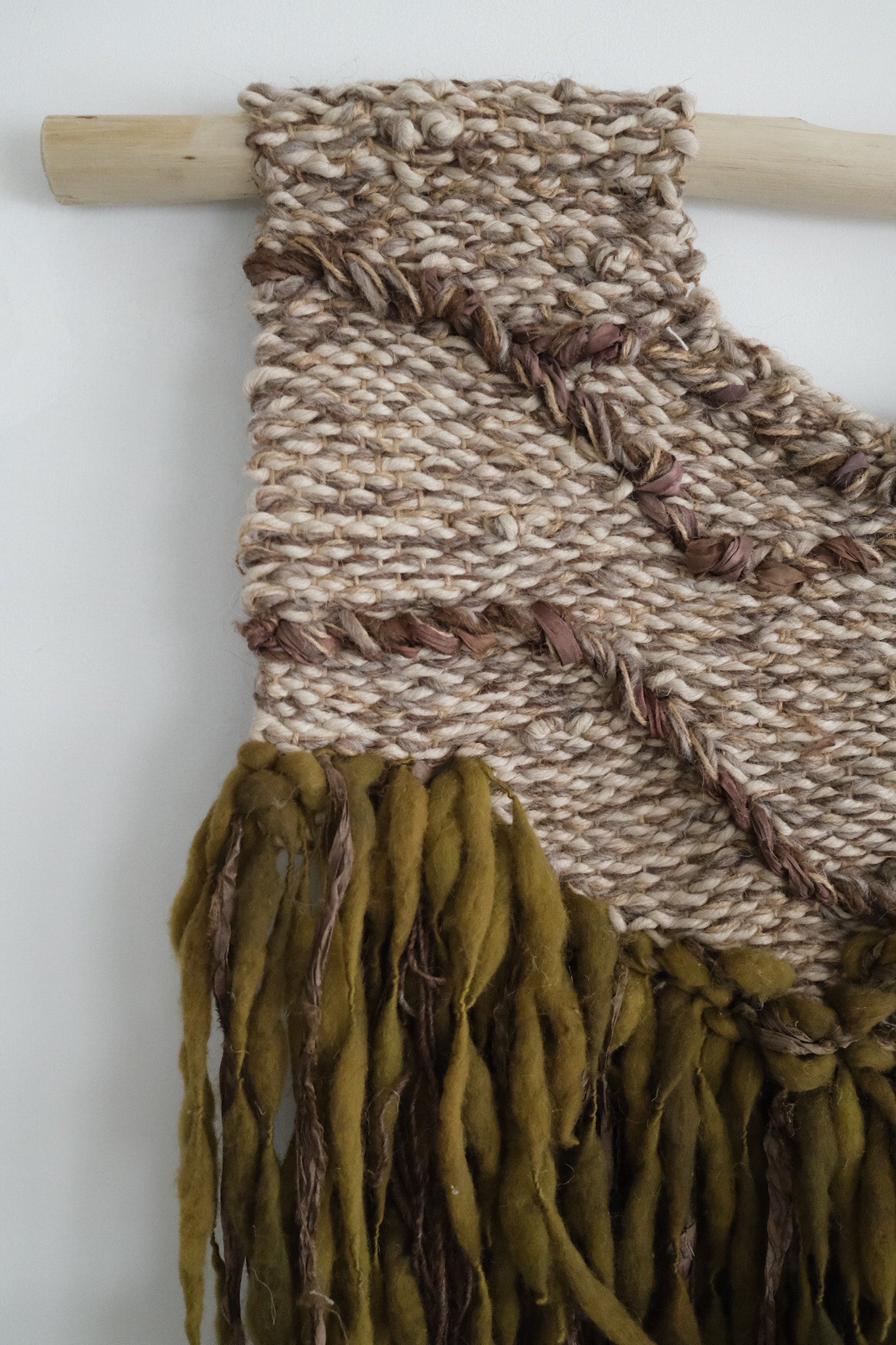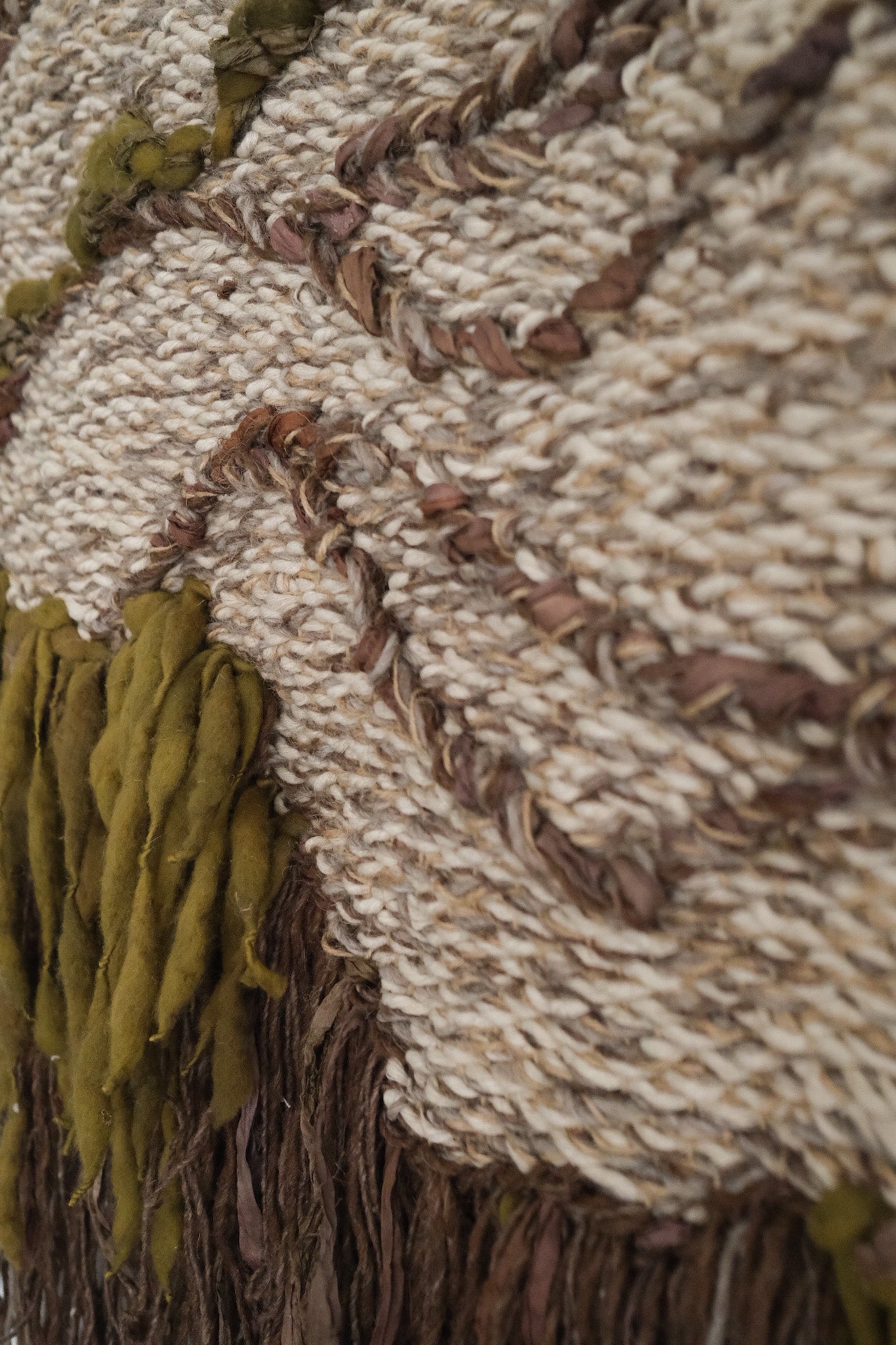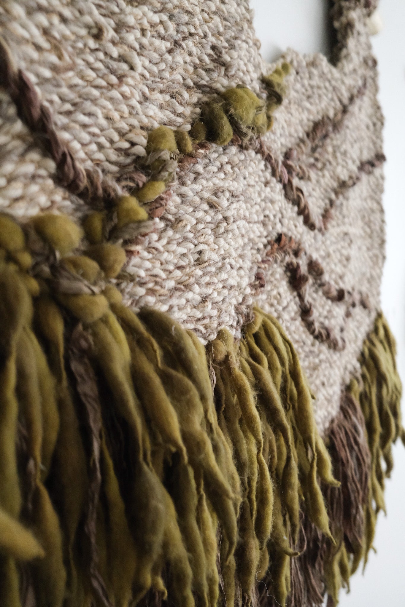 This textural wall hanging is made of felted wool, hemp, raffia, jute, nettle and ramie bark. Dimensions are 37'' by 33''. Accent colors are brown and green. Please message with any questions before purchasing.