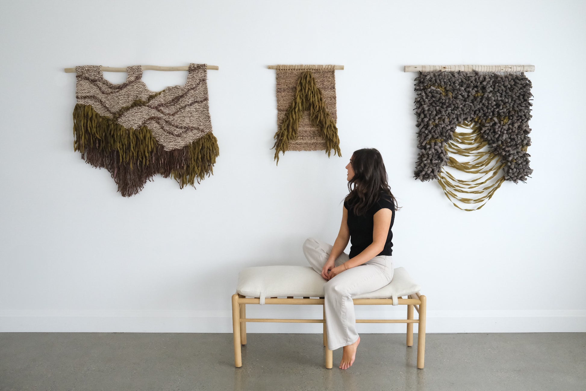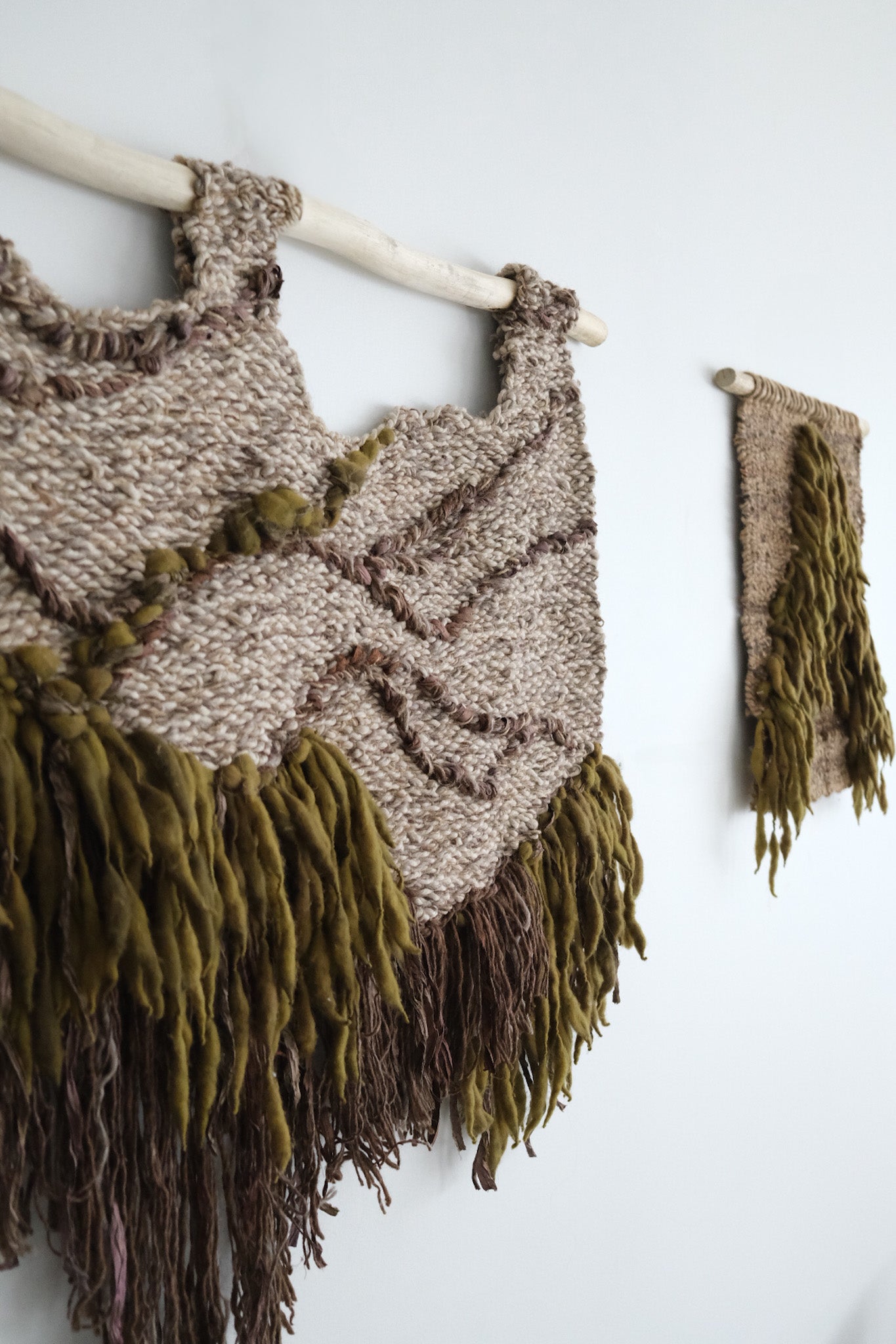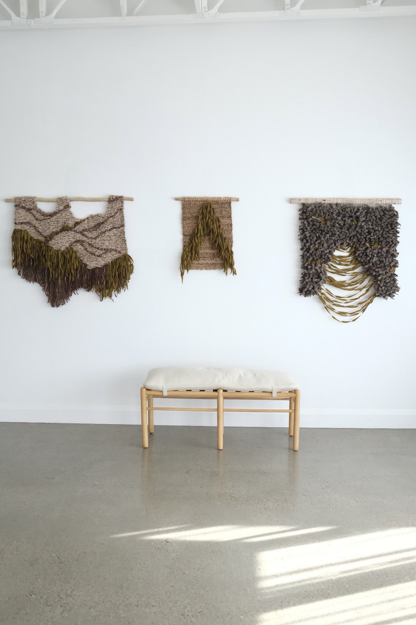 Please handle with care. Rebecca's work is designed to be a decorative wall hanging only, not to be used as rugs or regularly handled. Avoid moisture except to gently steam the fringe if necessary shortly after installation. Use clean hands to comb through fringe or straighten strings at the top, careful to avoid snagging fibers. No maintenance cleaning is necessary besides gently dusting with a feather dusty as needed.