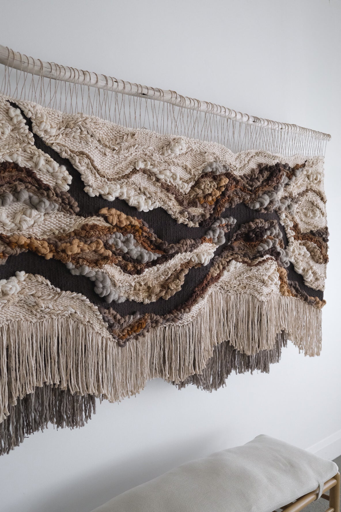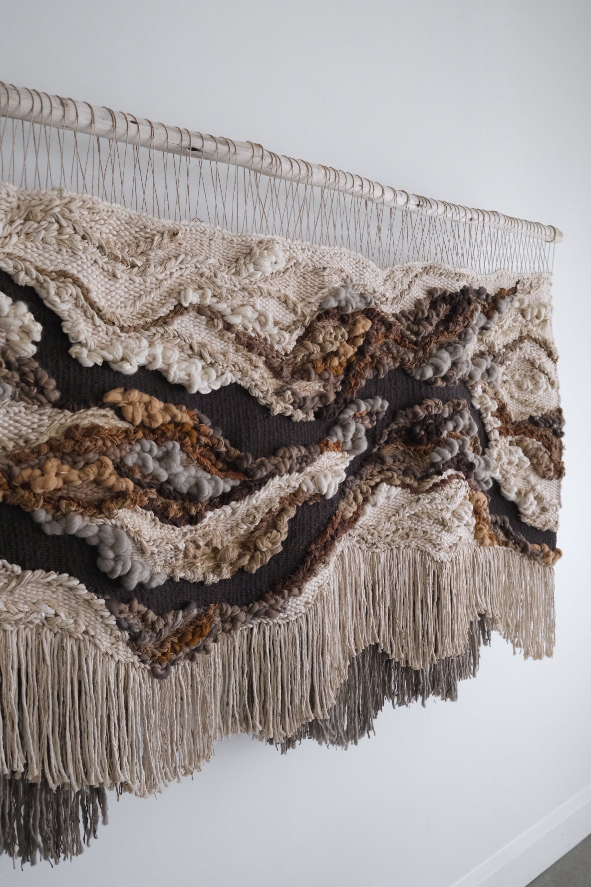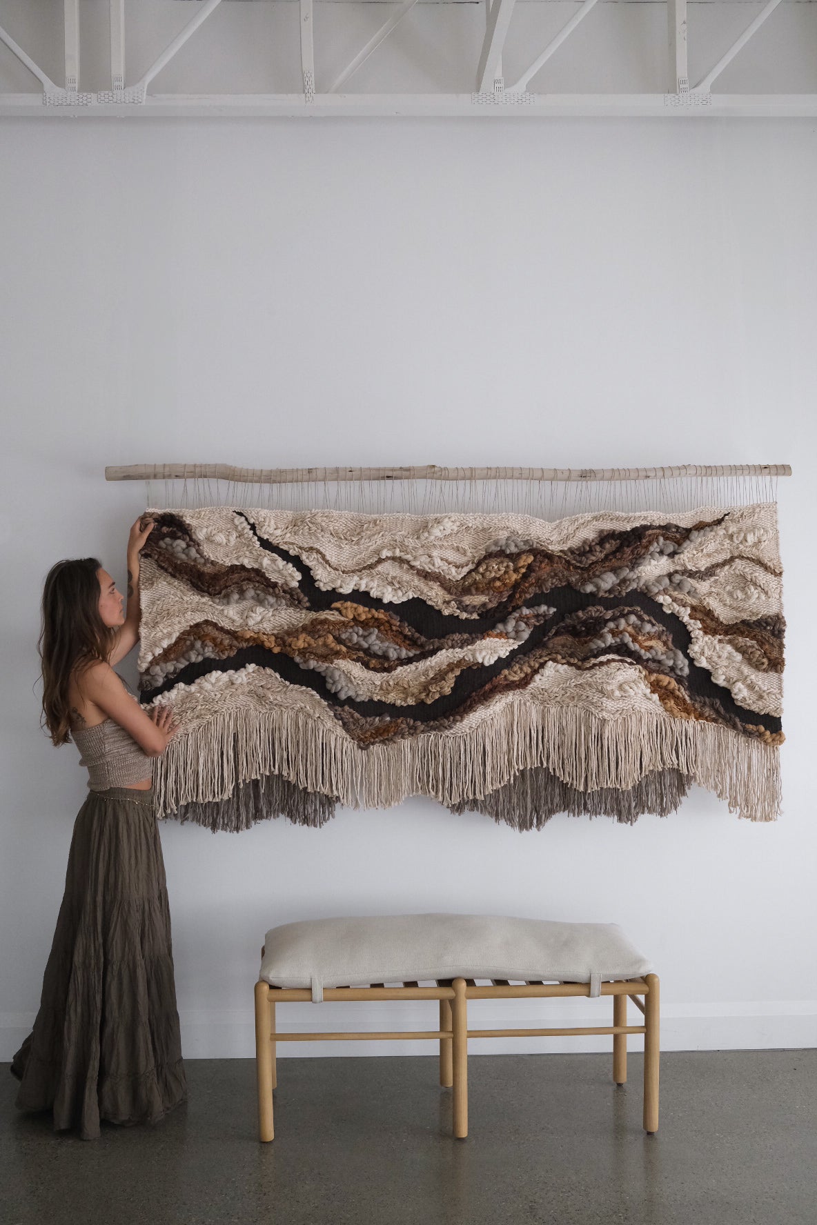 Please handle with care. Rebecca's work is designed to be a decorative wall hanging only, not to be used as rugs or regularly handled. Avoid moisture except to gently steam the fringe if necessary shortly after installation. Use clean hands to comb through fringe or straighten strings at the top, careful to avoid snagging fibers. No maintenance cleaning is necessary besides gently dusting with a feather dusty as needed.