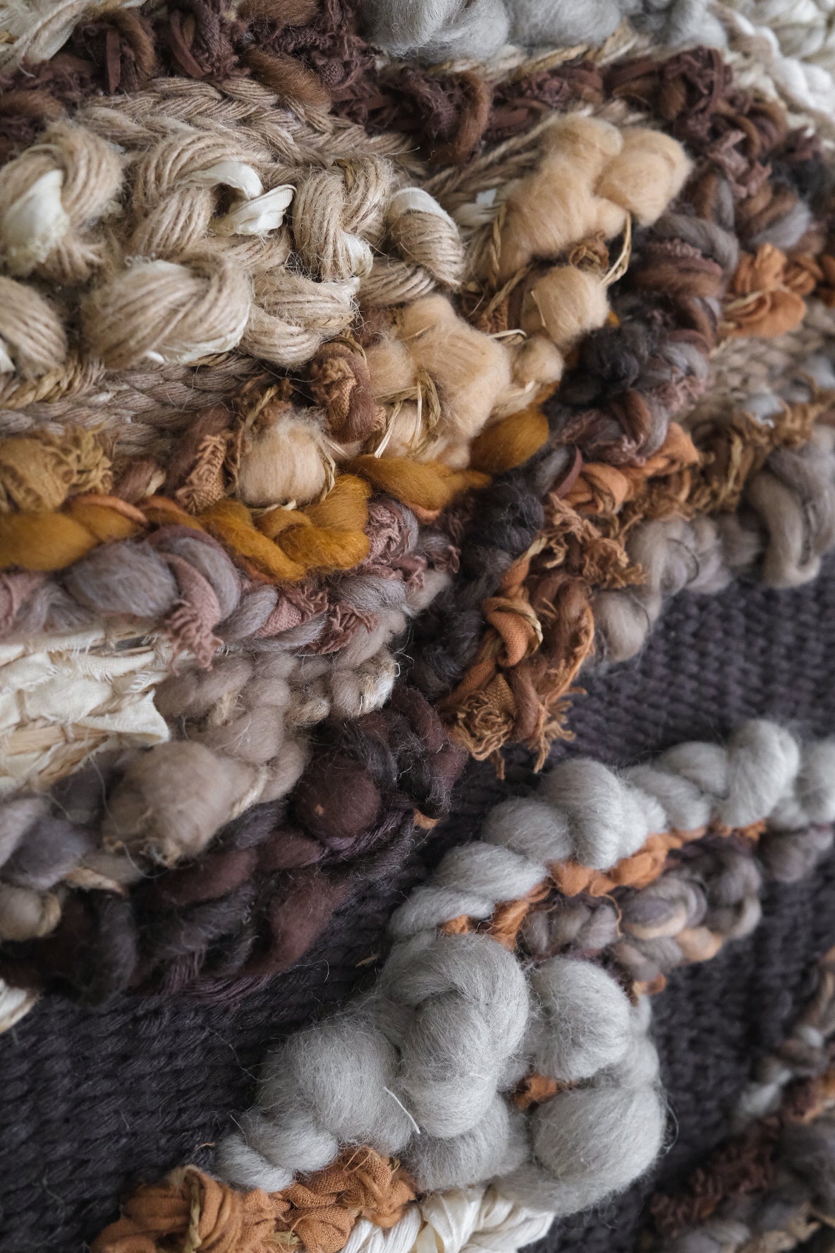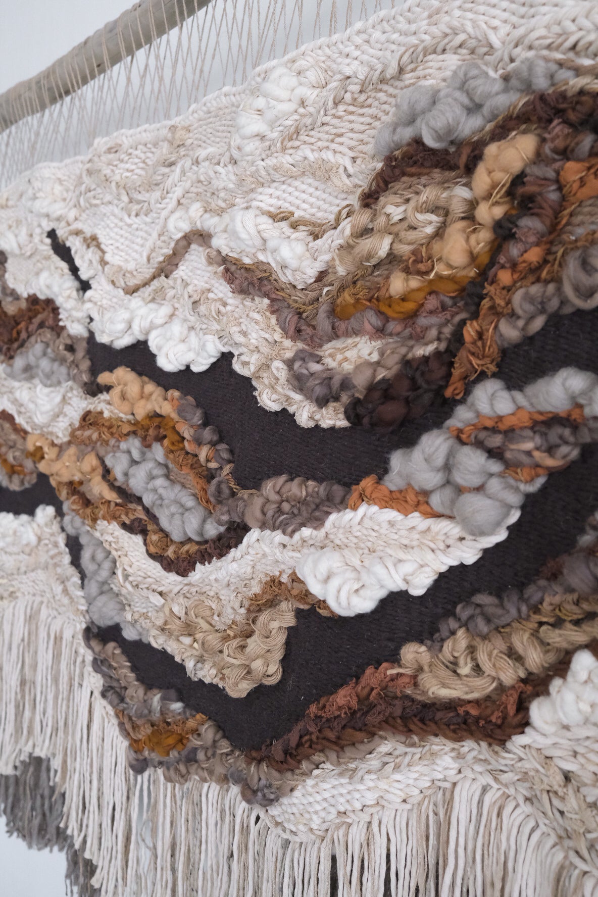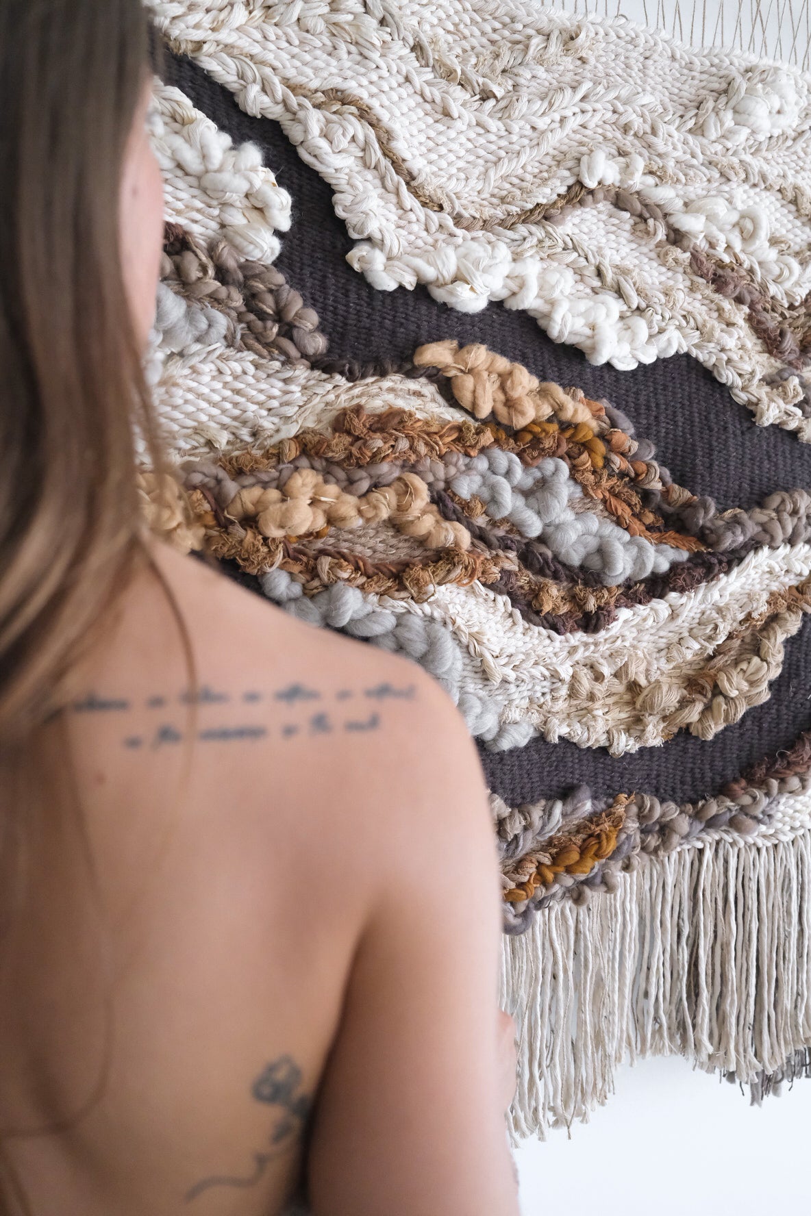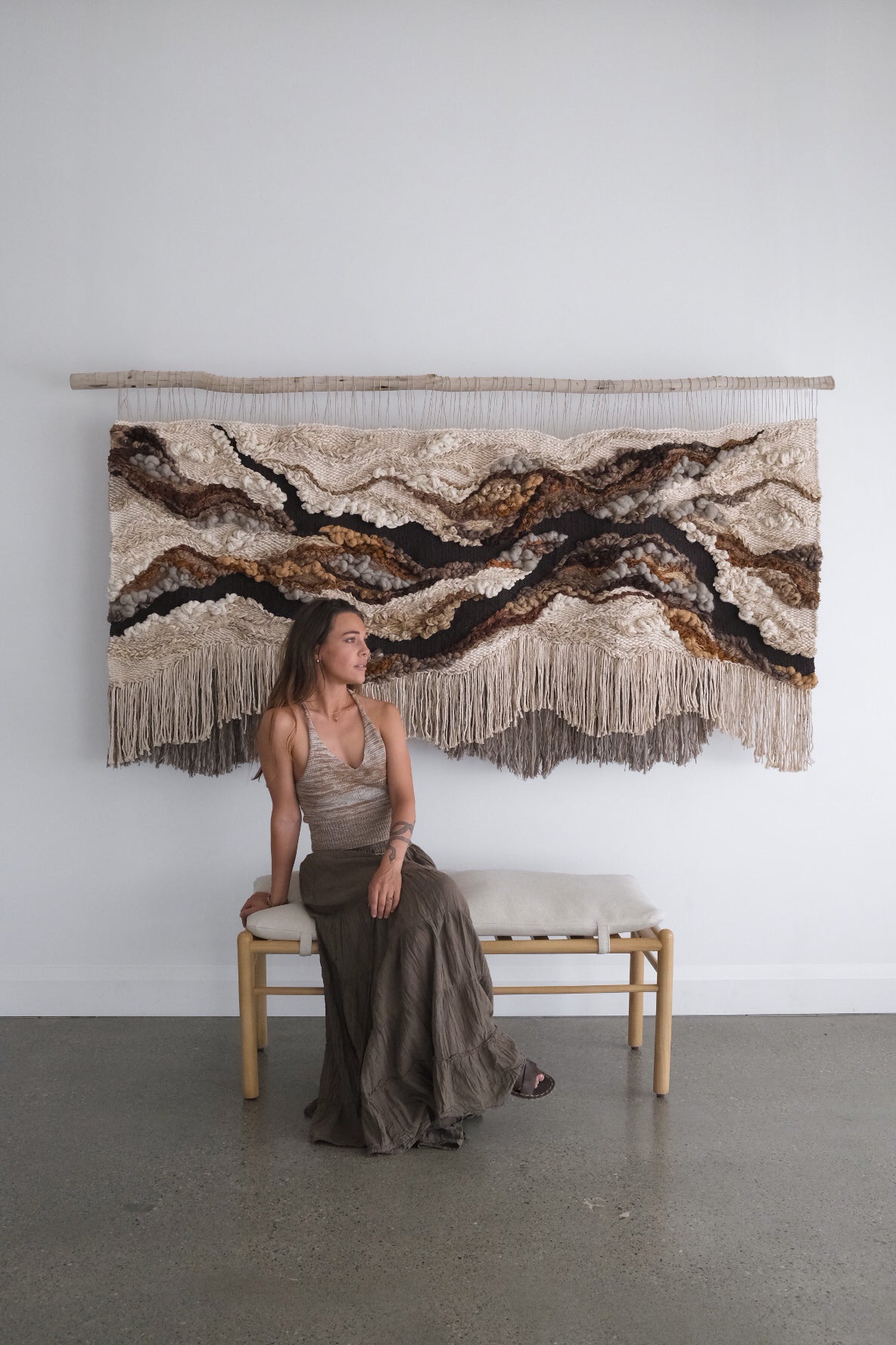 Please handle with care. Rebecca's work is designed to be a decorative wall hanging only, not to be used as rugs or regularly handled. Avoid moisture except to gently steam the fringe if necessary shortly after installation. Use clean hands to comb through fringe or straighten strings at the top, careful to avoid snagging fibers. No maintenance cleaning is necessary besides gently dusting with a feather dusty as needed.