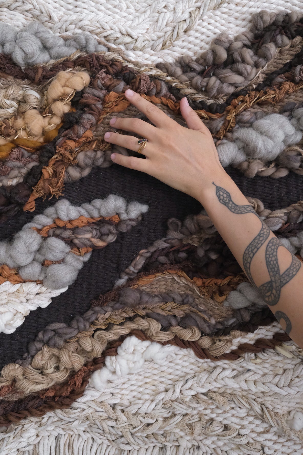 Woven in a warm, earthen palette of deep reds, burnt orange, and soft browns, the textures ripple with rhythm and intention. Each knot and curve suggests movement through landscape and time, echoing ancient ways of knowing and returning.