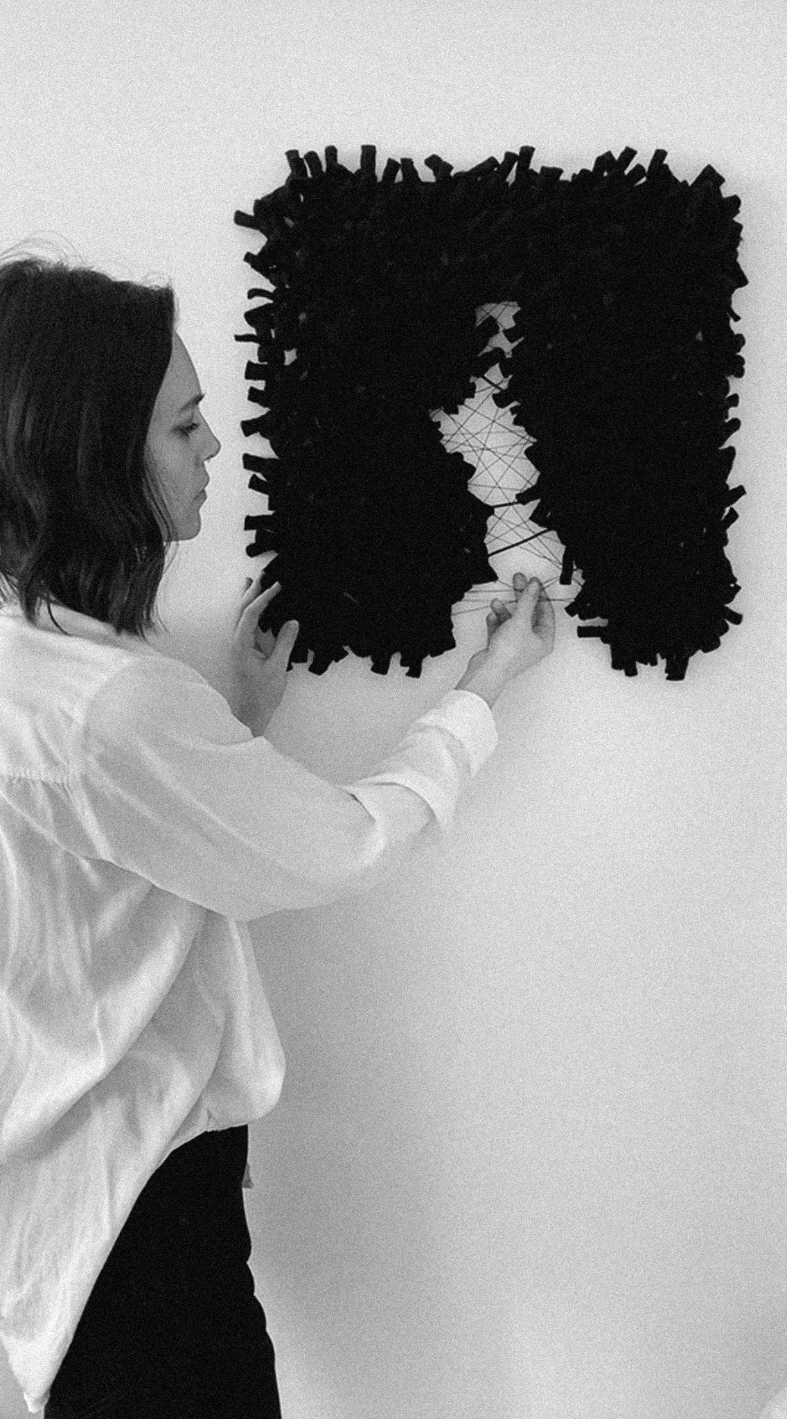Please handle with care. Rebecca's work is designed to be a decorative wall hanging only, not to be used as rugs or regularly handled. Avoid moisture except to gently steam the fringe if necessary shortly after installation. Use clean hands to comb through fringe or straighten strings at the top, careful to avoid snagging fibers. No maintenance cleaning is necessary besides gently dusting with a feather dusty as needed.