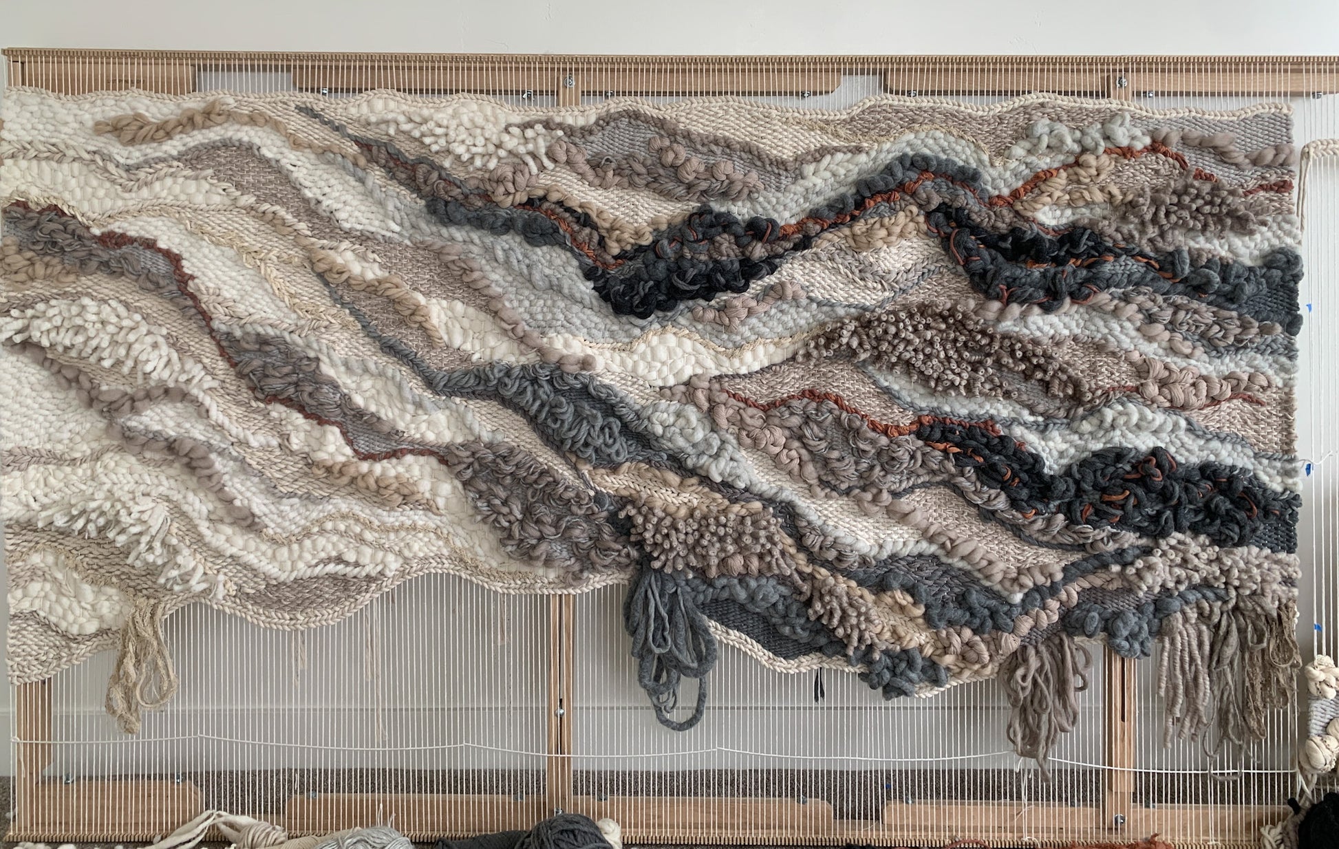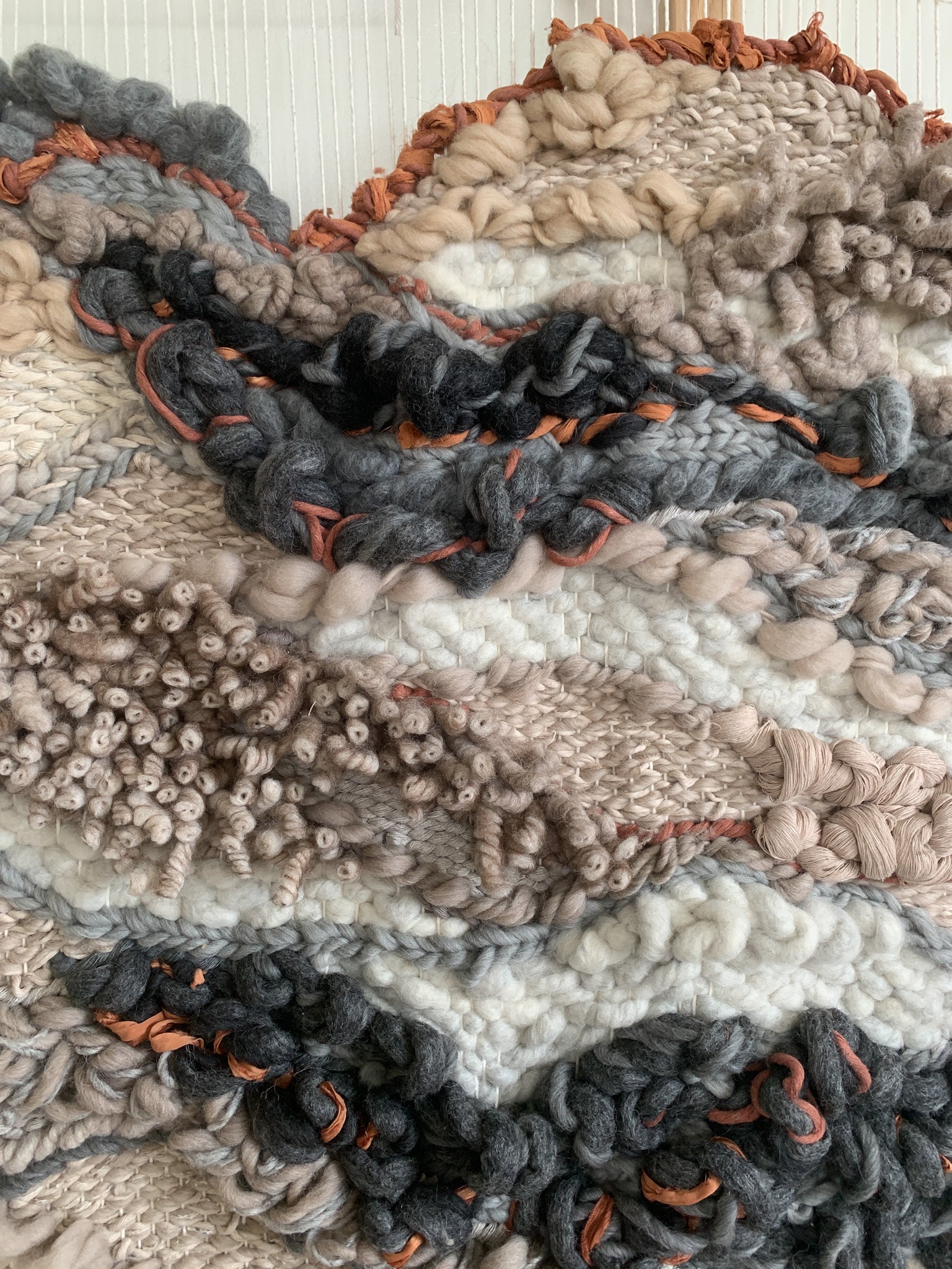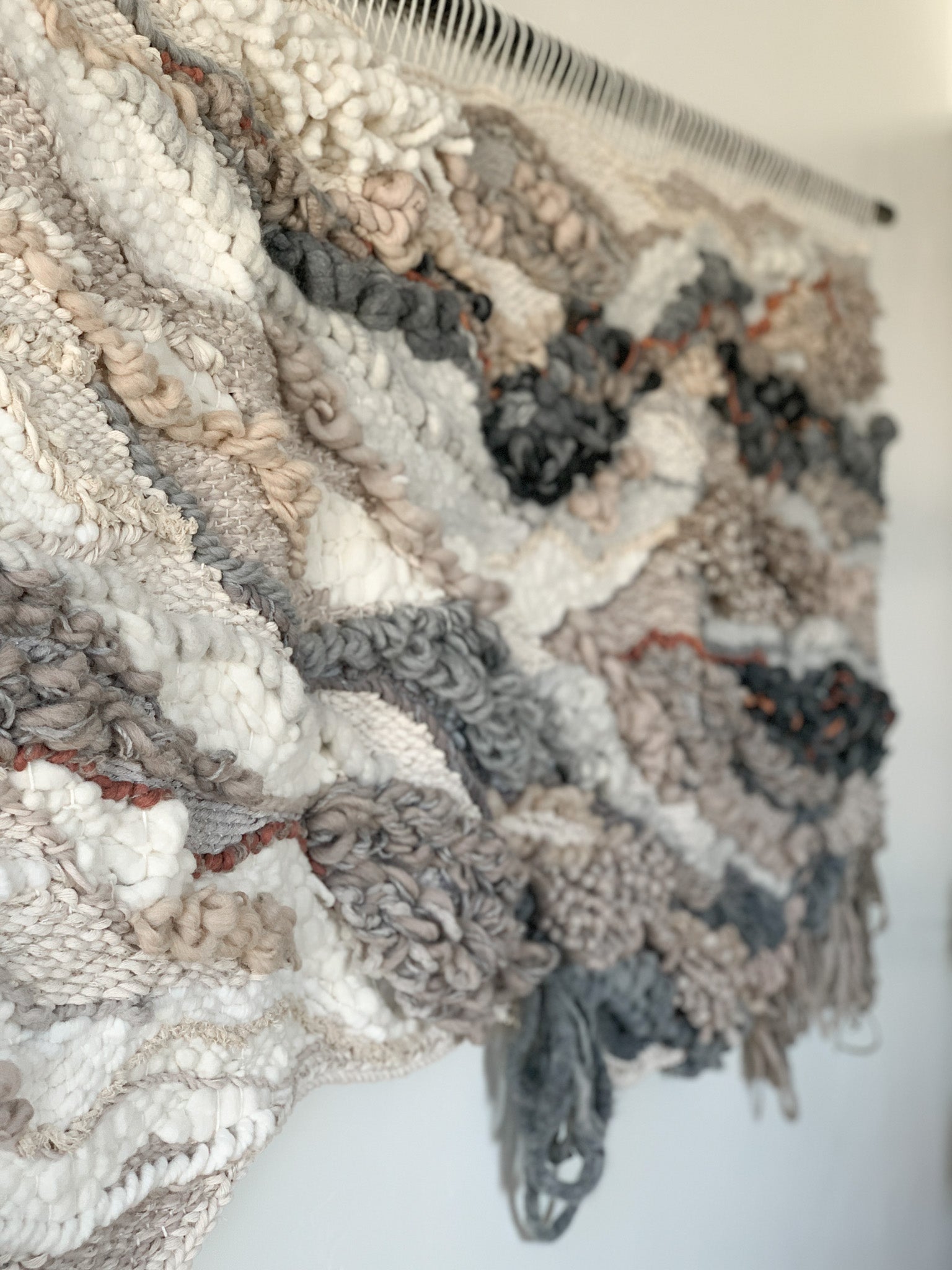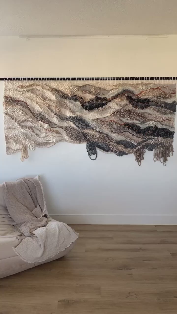 Please handle with care. Rebecca's work is designed to be a decorative wall hanging only, not to be used as rugs or regularly handled. Avoid moisture except to gently steam the fringe if necessary shortly after installation. Use clean hands to comb through fringe or straighten strings at the top, careful to avoid snagging fibers. No maintenance cleaning is necessary besides gently dusting with a feather dusty as needed.