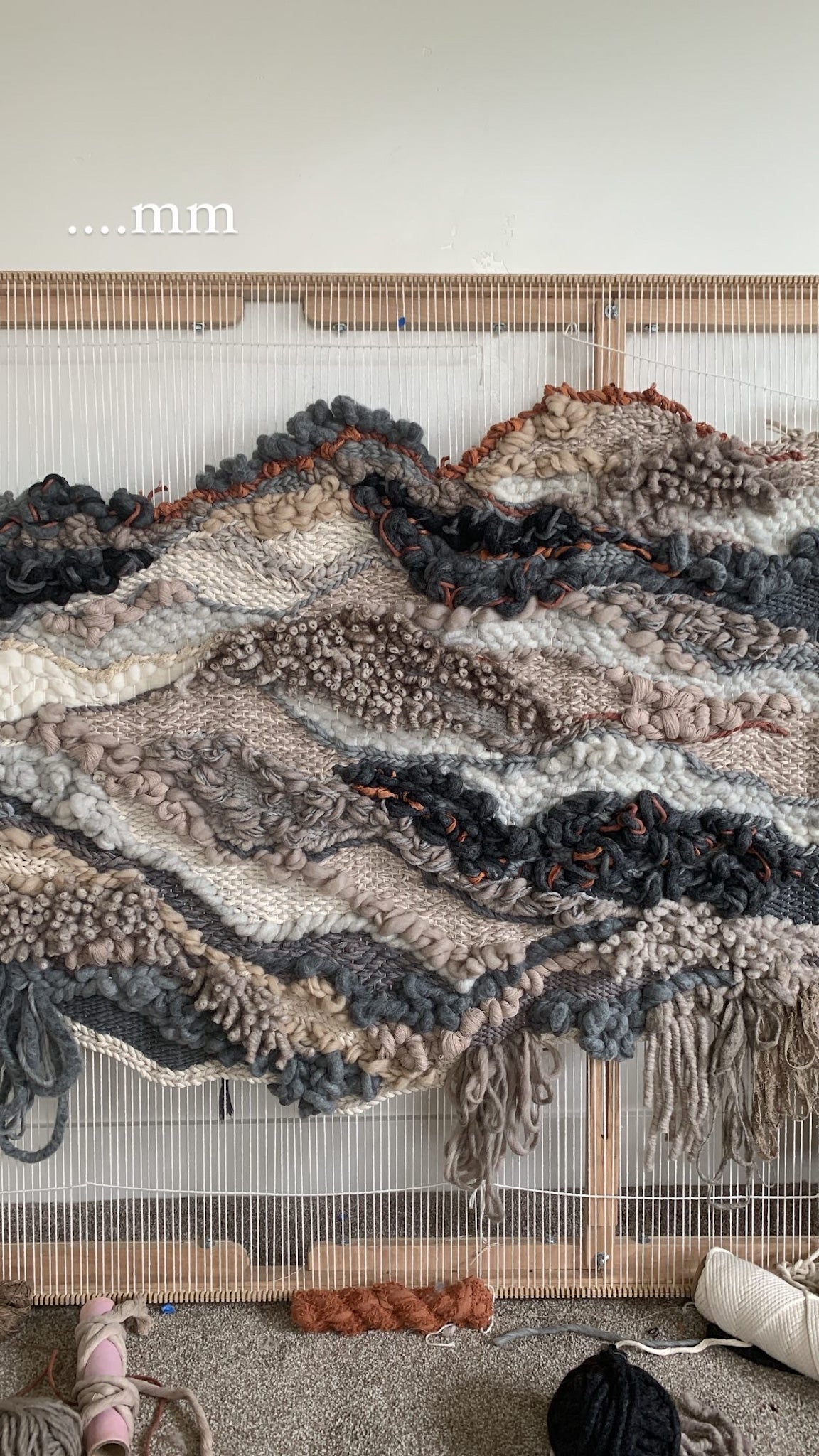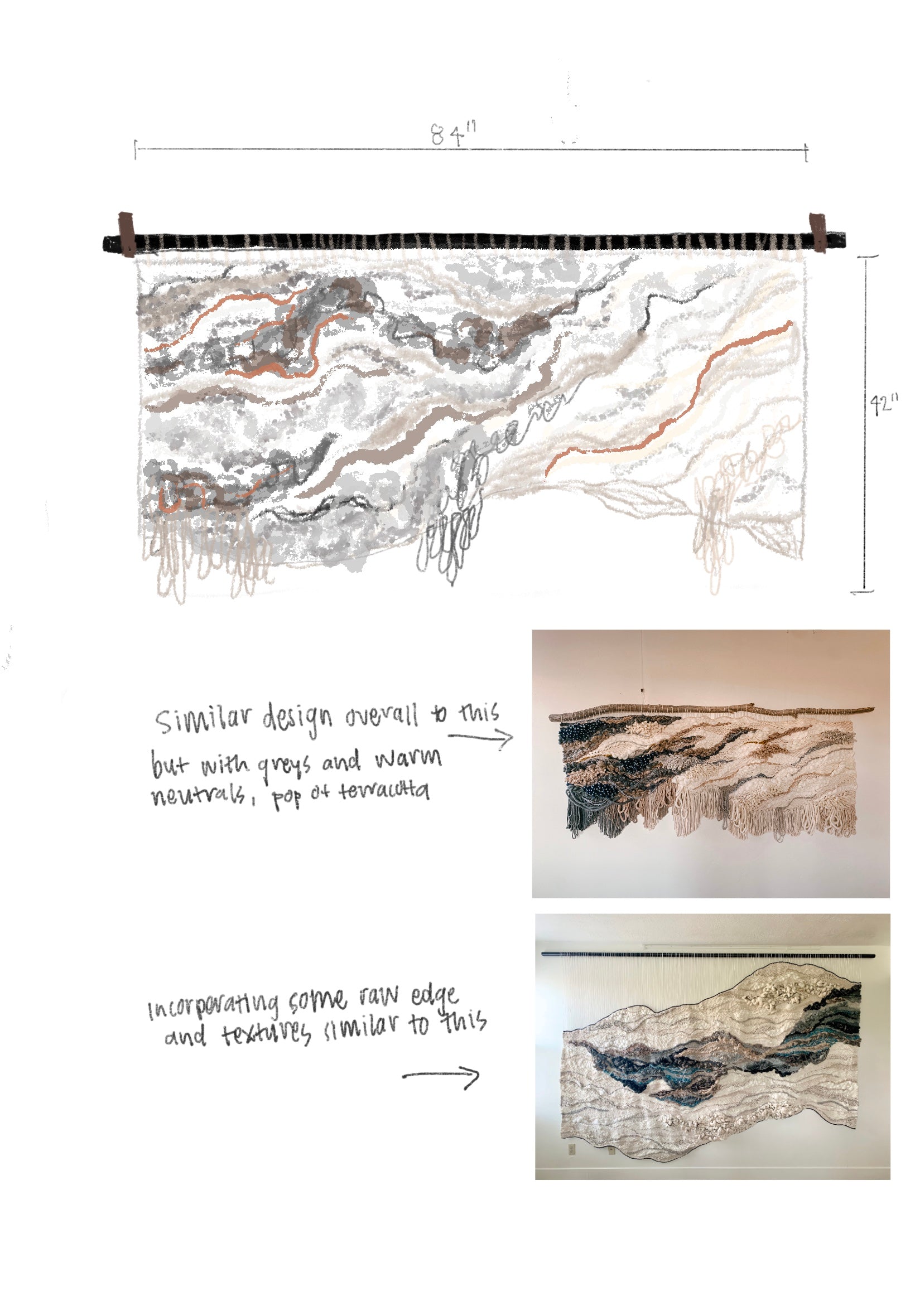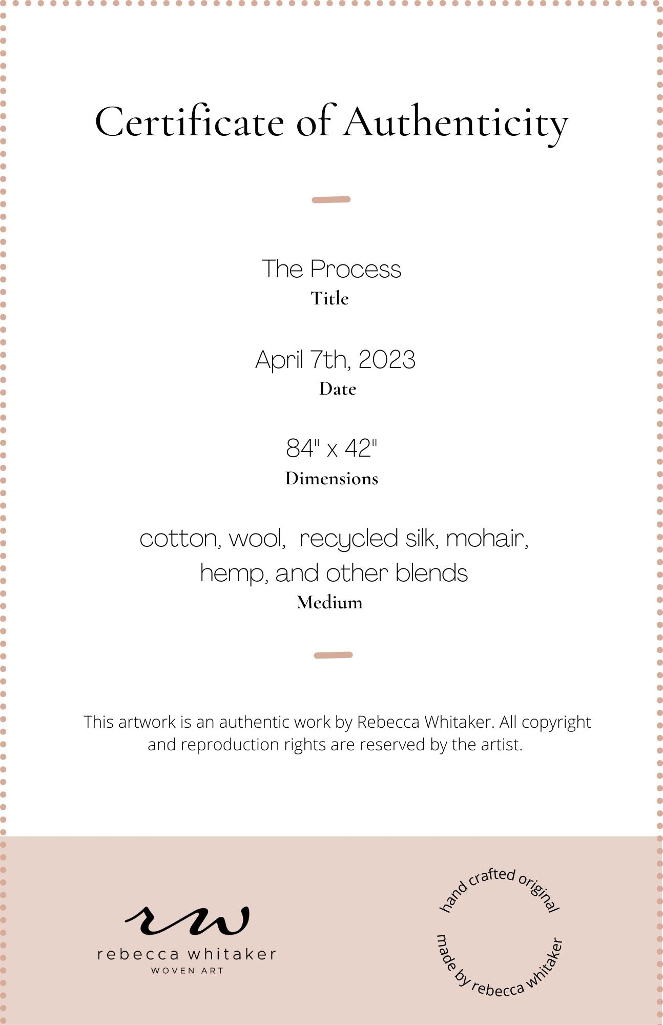 Please handle with care. Rebecca's work is designed to be a decorative wall hanging only, not to be used as rugs or regularly handled. Avoid moisture except to gently steam the fringe if necessary shortly after installation. Use clean hands to comb through fringe or straighten strings at the top, careful to avoid snagging fibers. No maintenance cleaning is necessary besides gently dusting with a feather dusty as needed.