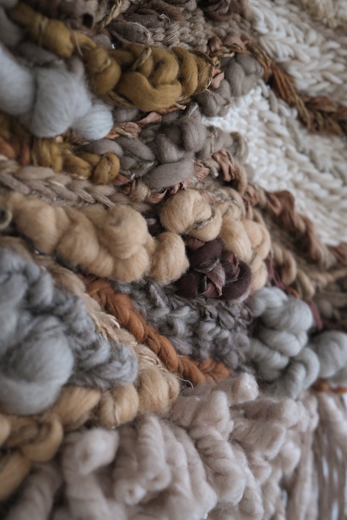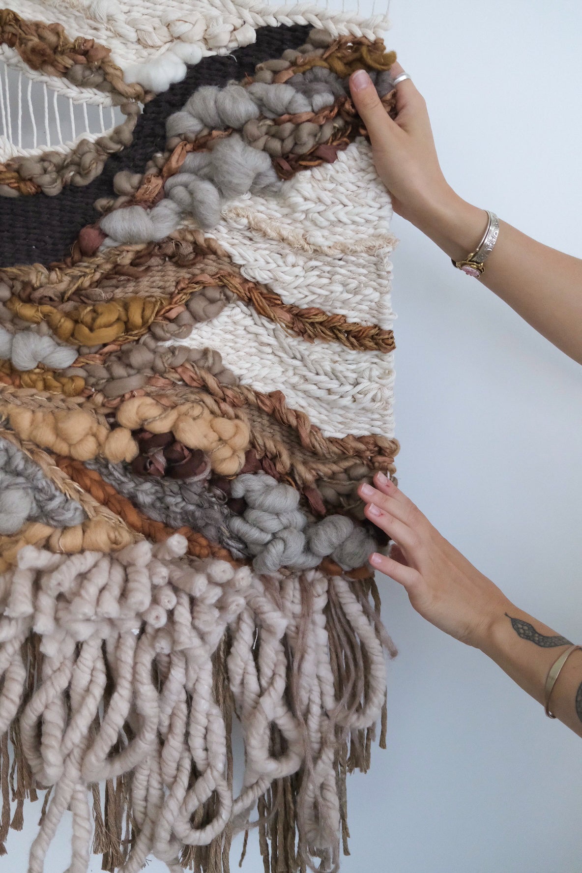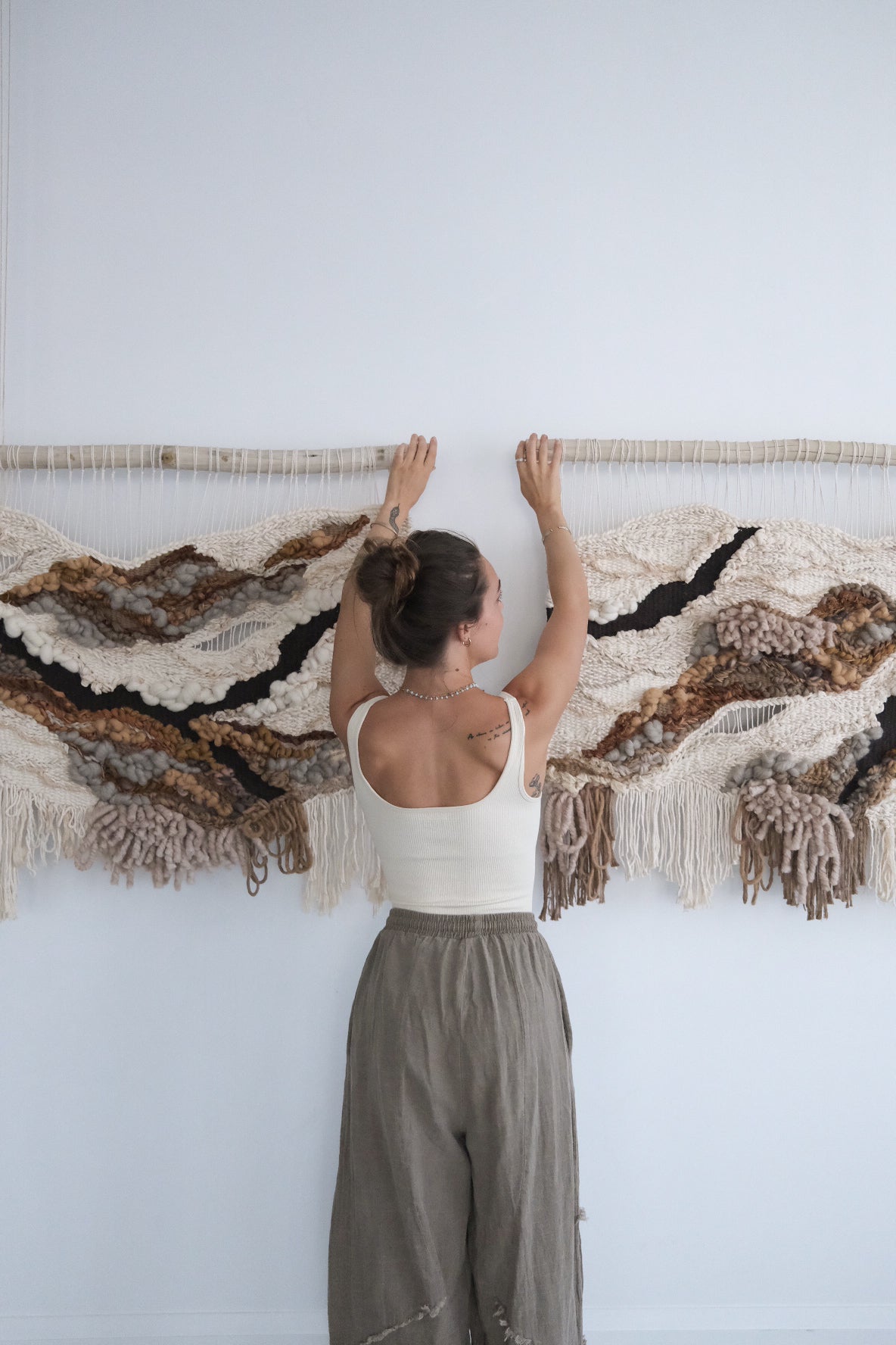 Please handle with care. Rebecca's work is designed to be a decorative wall hanging only, not to be used as rugs or regularly handled. Avoid moisture except to gently steam the fringe if necessary shortly after installation. Use clean hands to comb through fringe or straighten strings at the top, careful to avoid snagging fibers. No maintenance cleaning is necessary besides gently dusting with a feather dusty as needed.