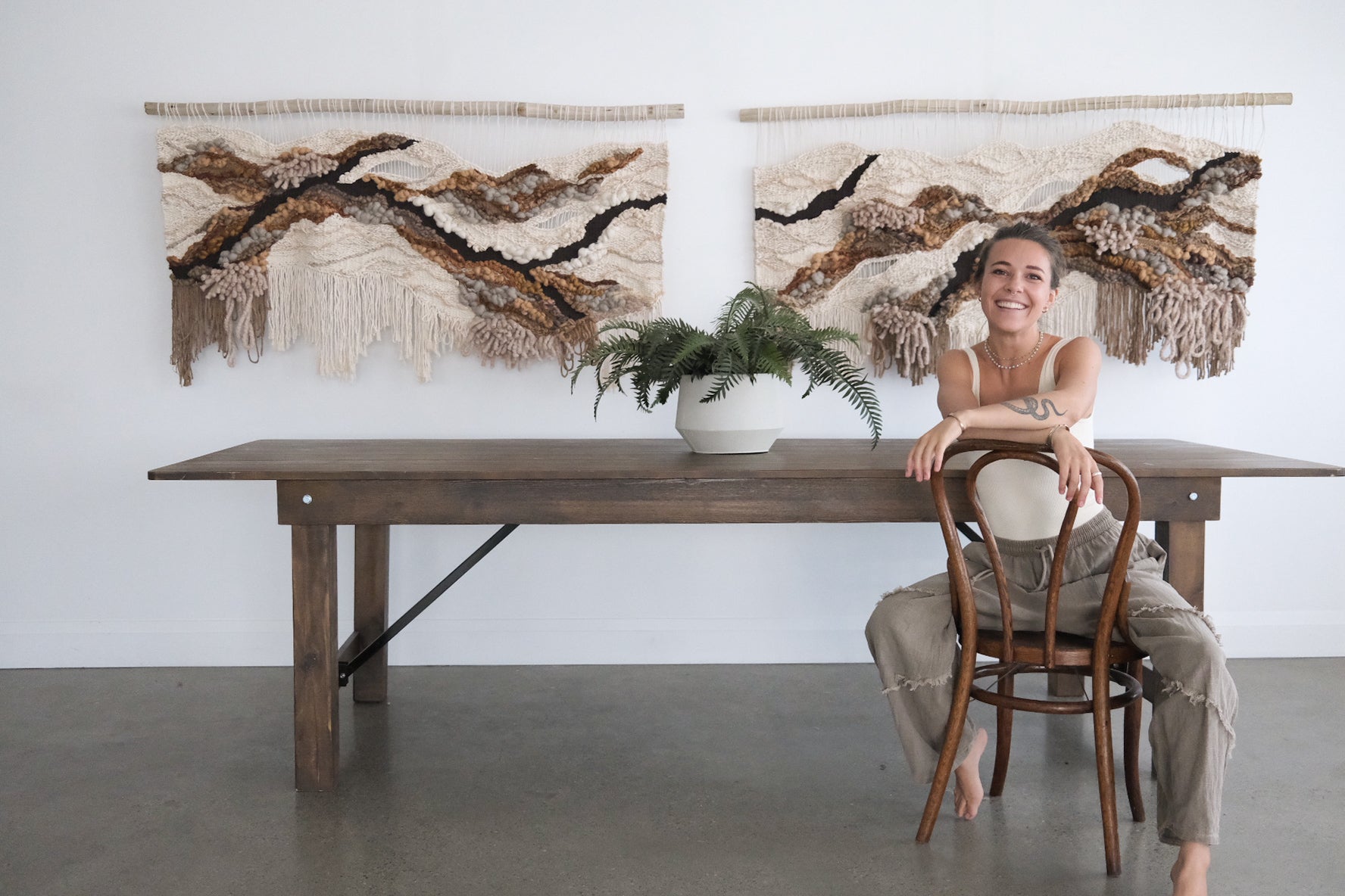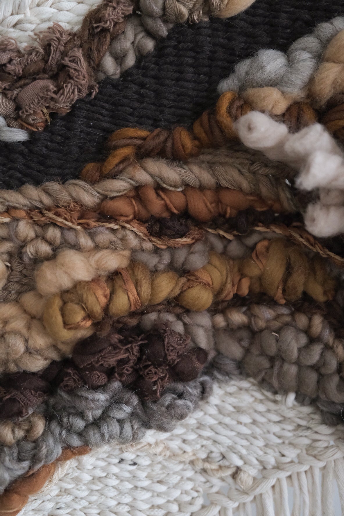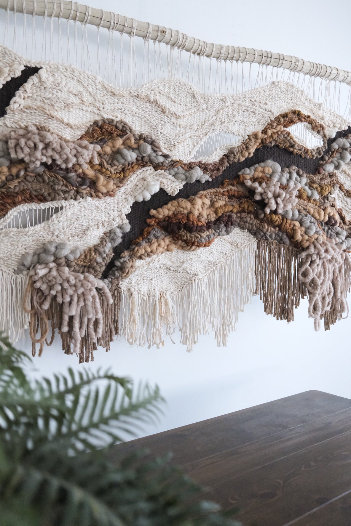 Please handle with care. Rebecca's work is designed to be a decorative wall hanging only, not to be used as rugs or regularly handled. Avoid moisture except to gently steam the fringe if necessary shortly after installation. Use clean hands to comb through fringe or straighten strings at the top, careful to avoid snagging fibers. No maintenance cleaning is necessary besides gently dusting with a feather dusty as needed.