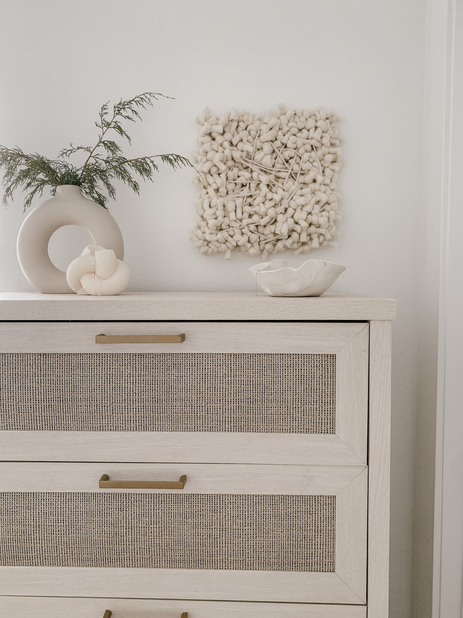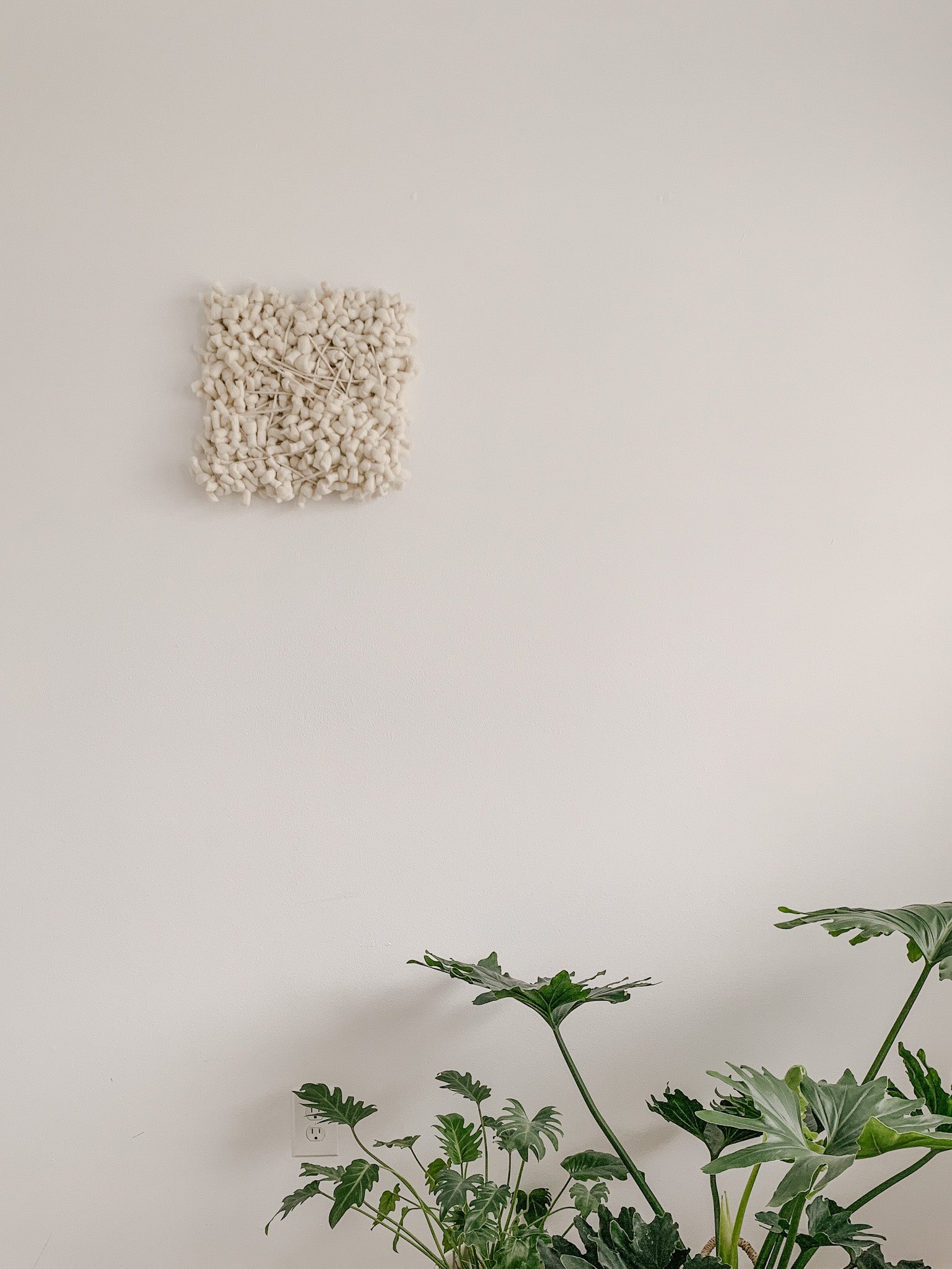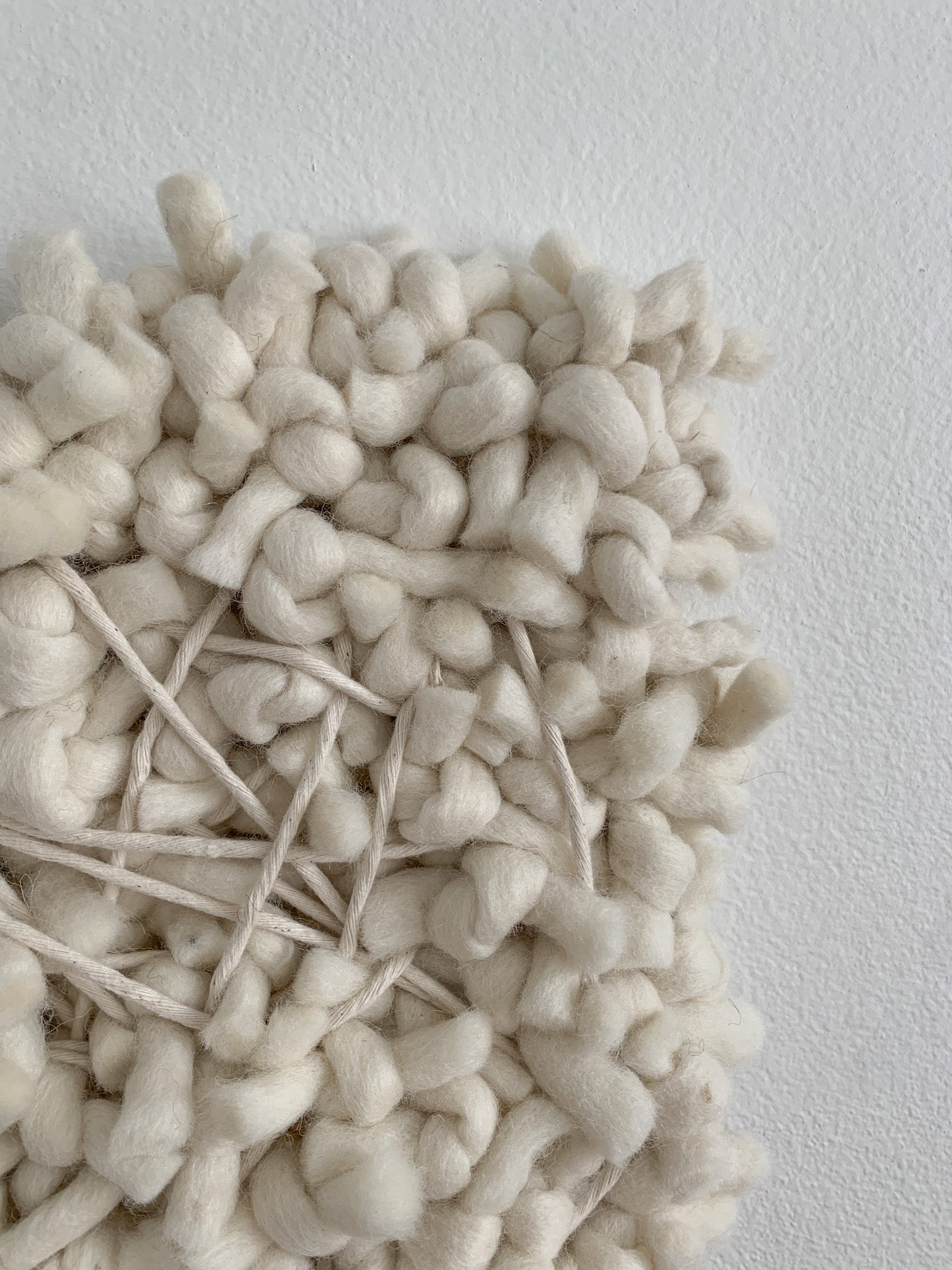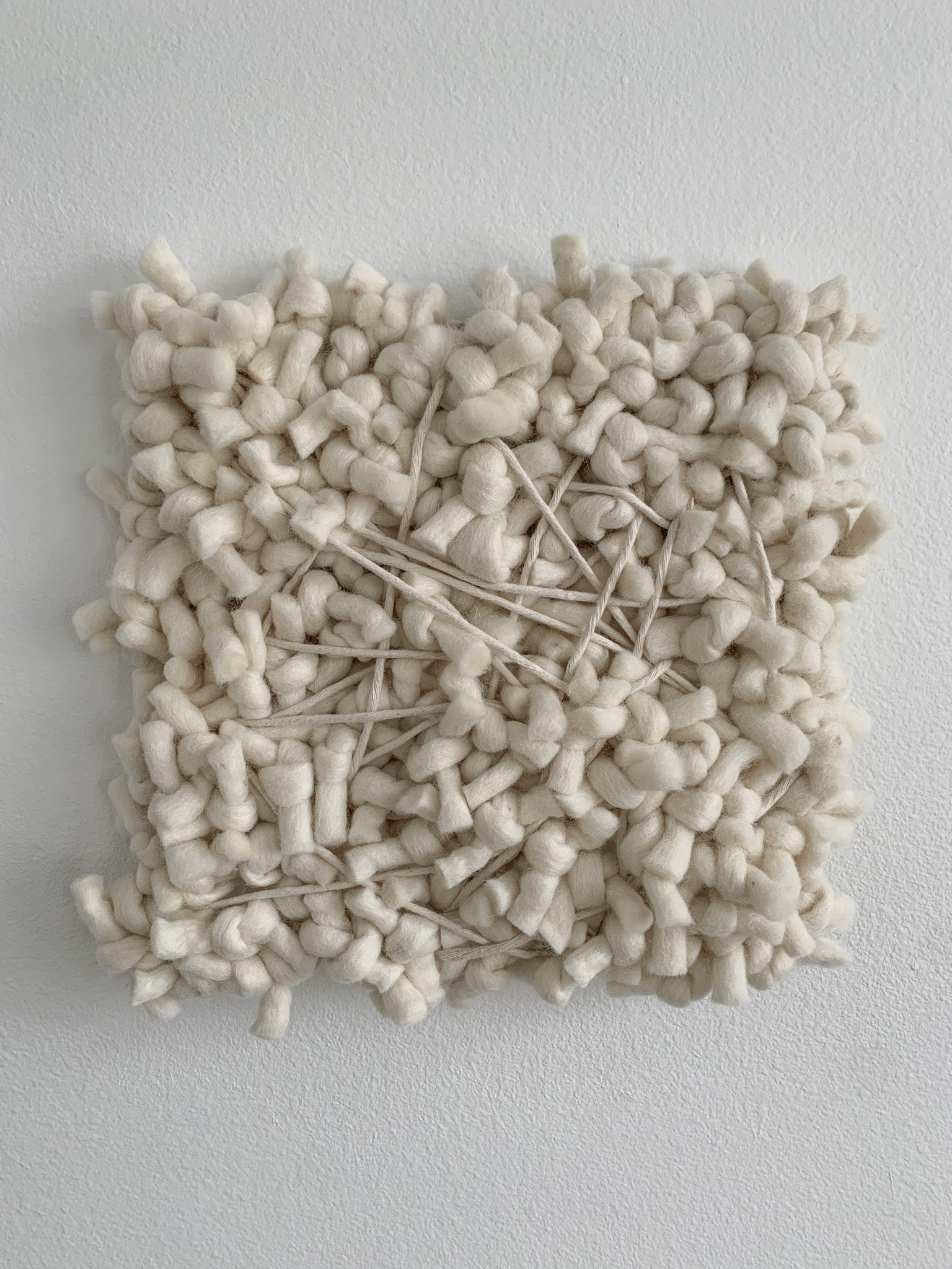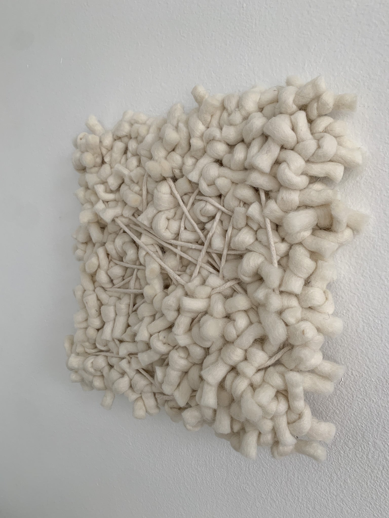 This contemporary wall sculpture is primarily made of felted wool and cotton. The monochrome style in ivory-white brings visual interest and texture to your walls without demanding too much attention, perfect for minimalist and modern interiors.