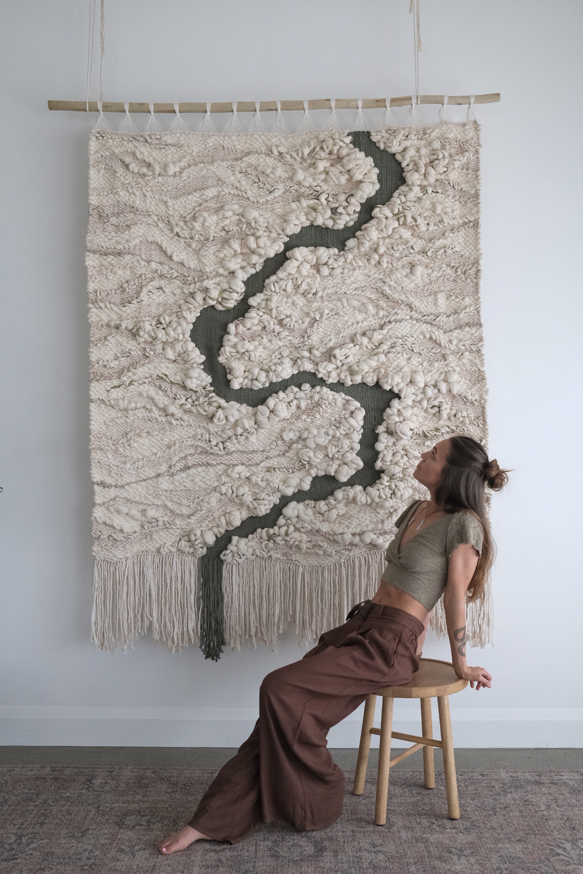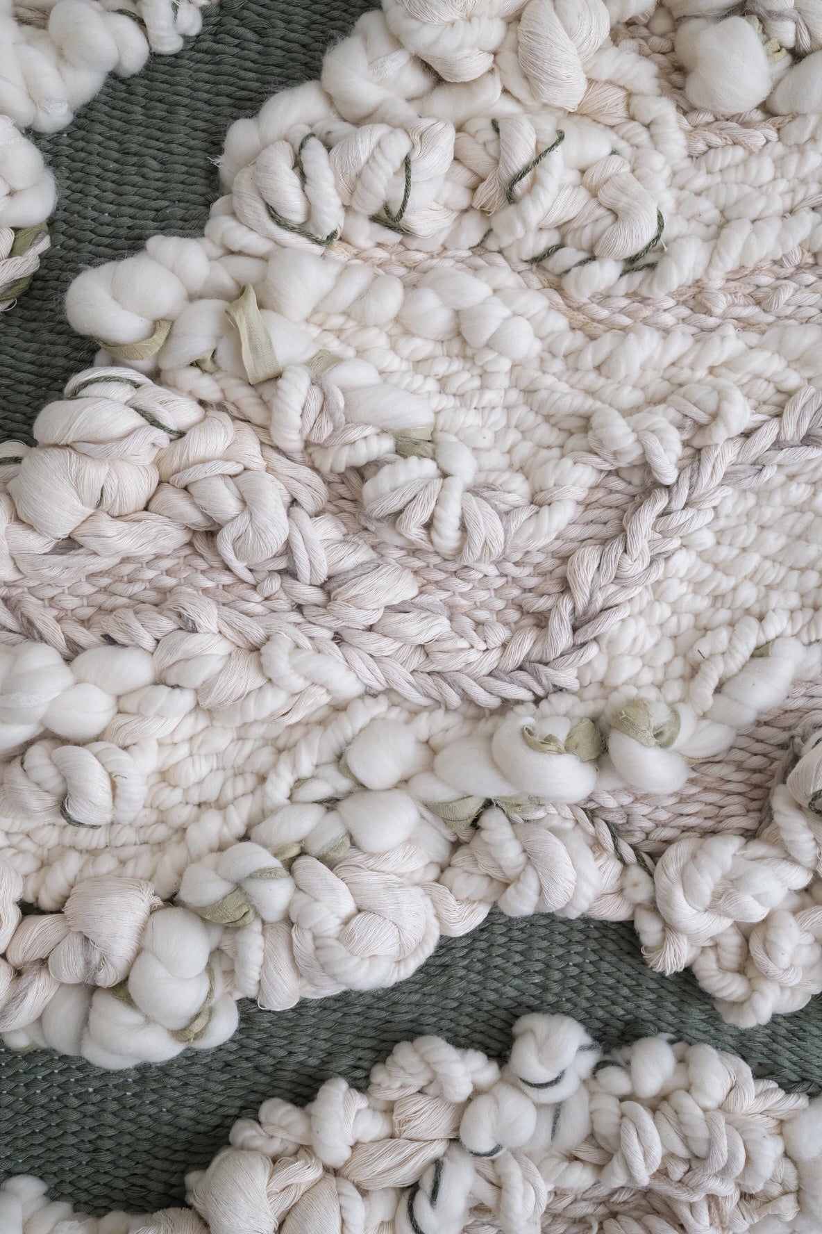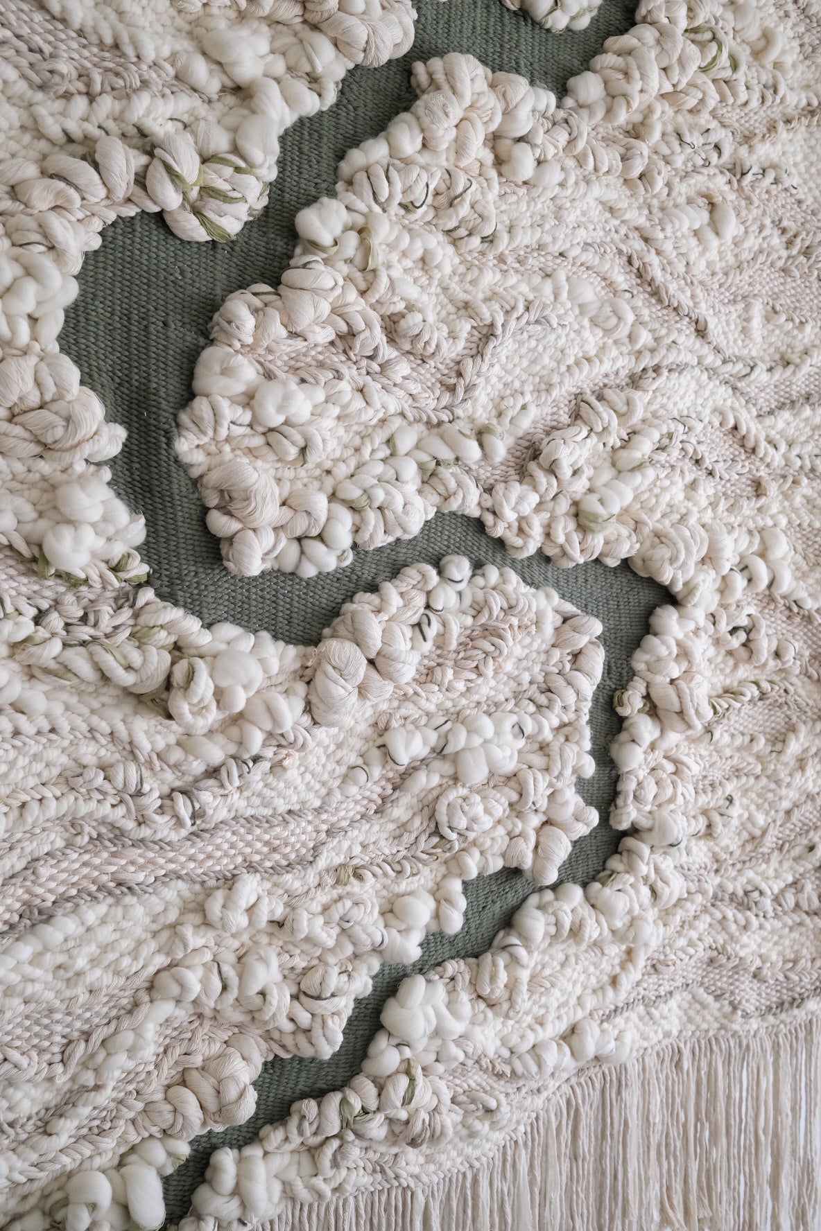 Woven in a soft palette of ivory and green, the work blends cotton, wool, recycled silk, and linen to create rich texture and gentle variation. Both sculptural and serene, Yaima is a study in flow, stillness, and connection to place.