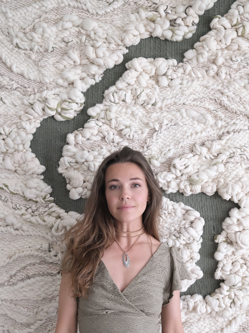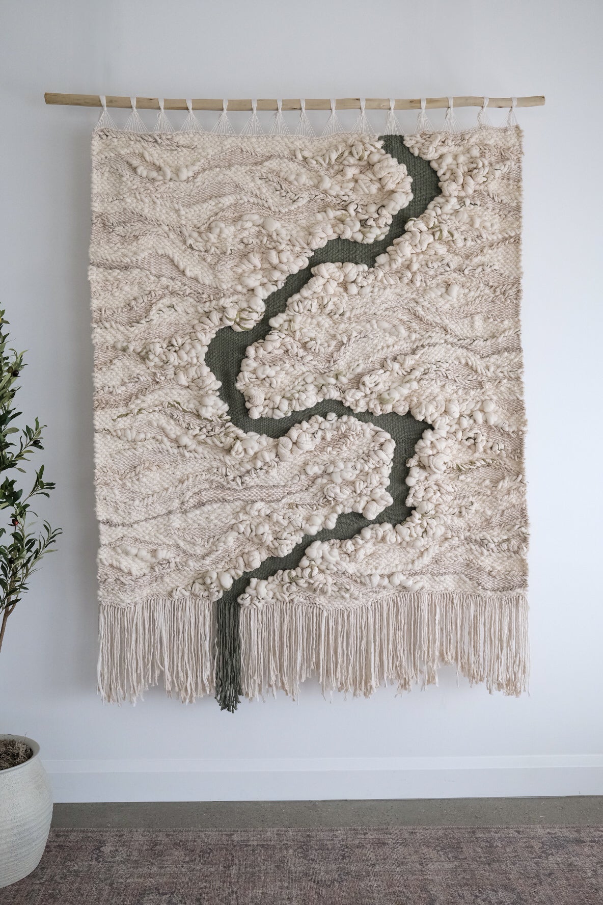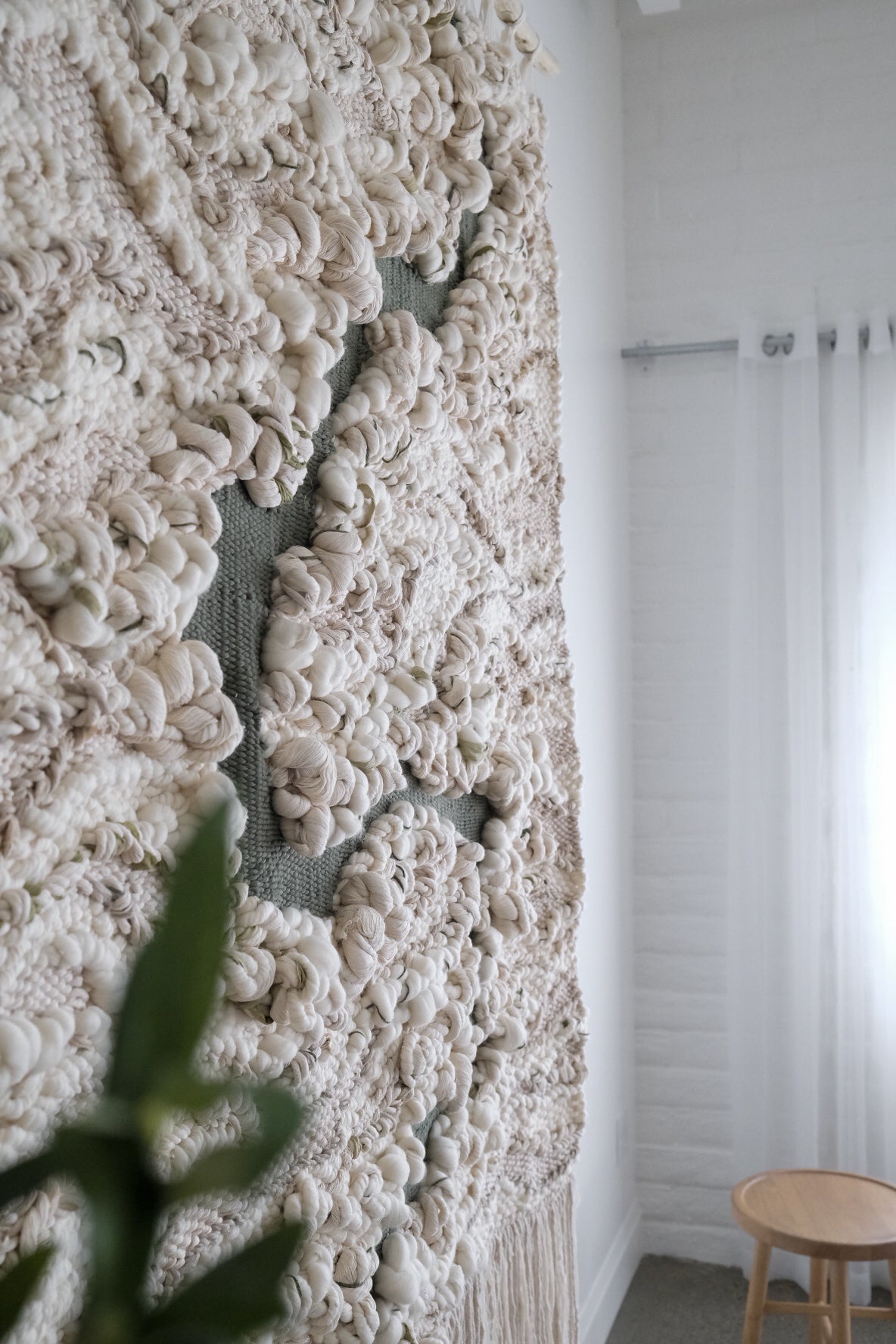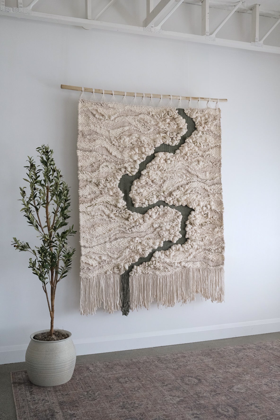 Woven in a soft palette of ivory and green, the work blends cotton, wool, recycled silk, and linen to create rich texture and gentle variation. Both sculptural and serene, Yaima is a study in flow, stillness, and connection to place.