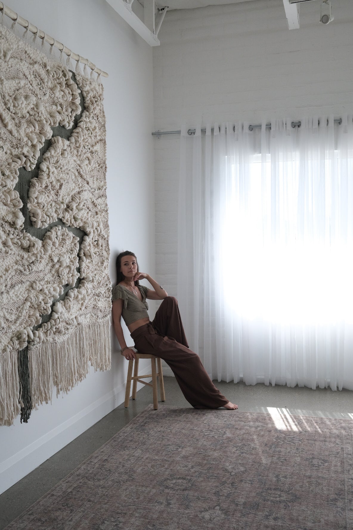 Please handle with care. Rebecca's work is designed to be a decorative wall hanging only, not to be used as rugs or regularly handled. Avoid moisture except to gently steam the fringe if necessary shortly after installation. Use clean hands to comb through fringe or straighten strings at the top, careful to avoid snagging fibers. No maintenance cleaning is necessary besides gently dusting with a feather dusty as needed.